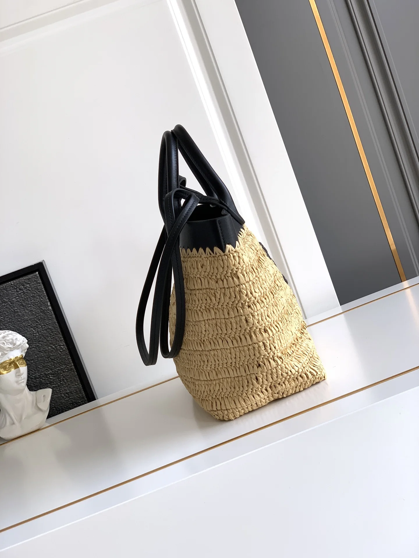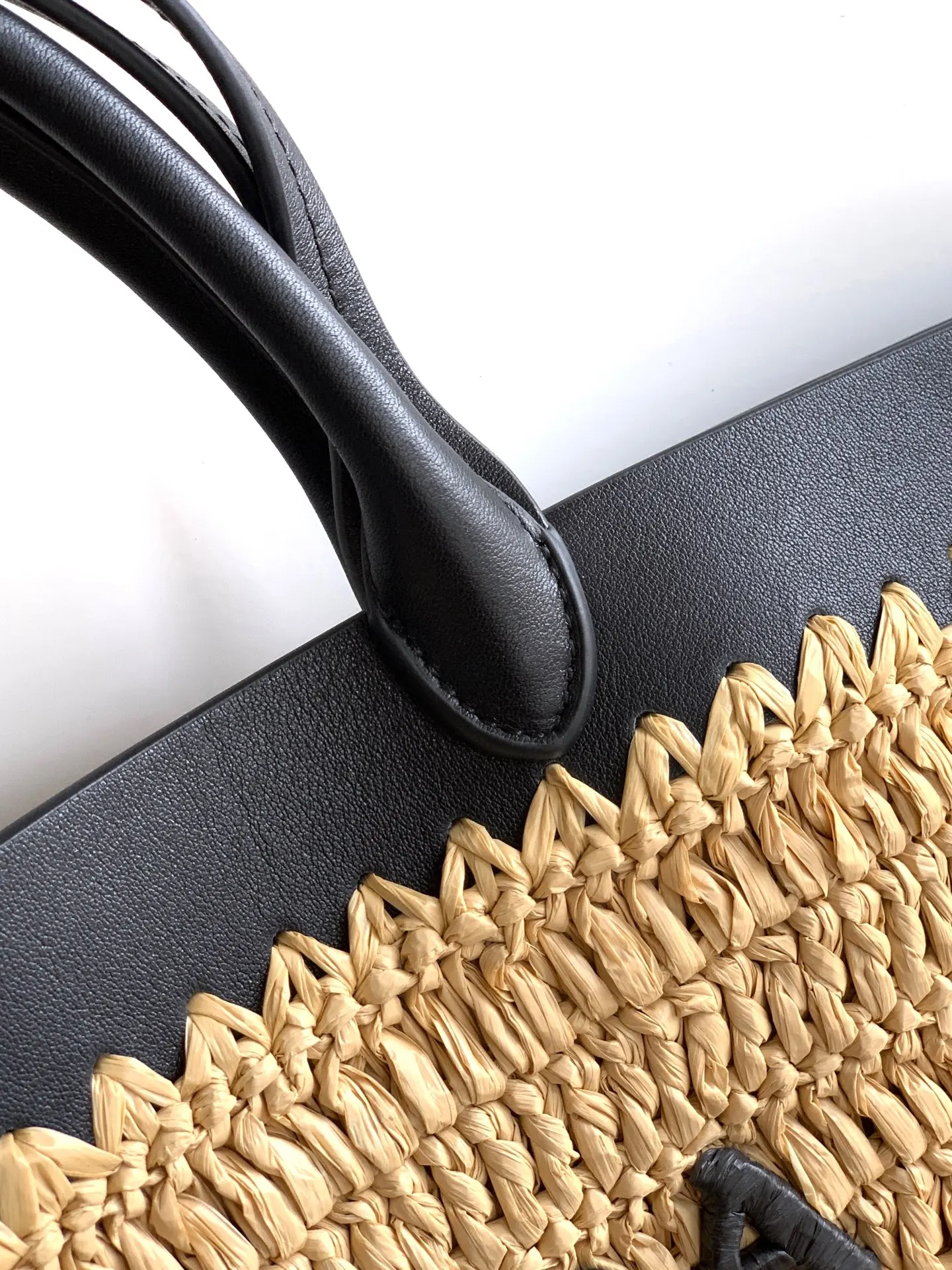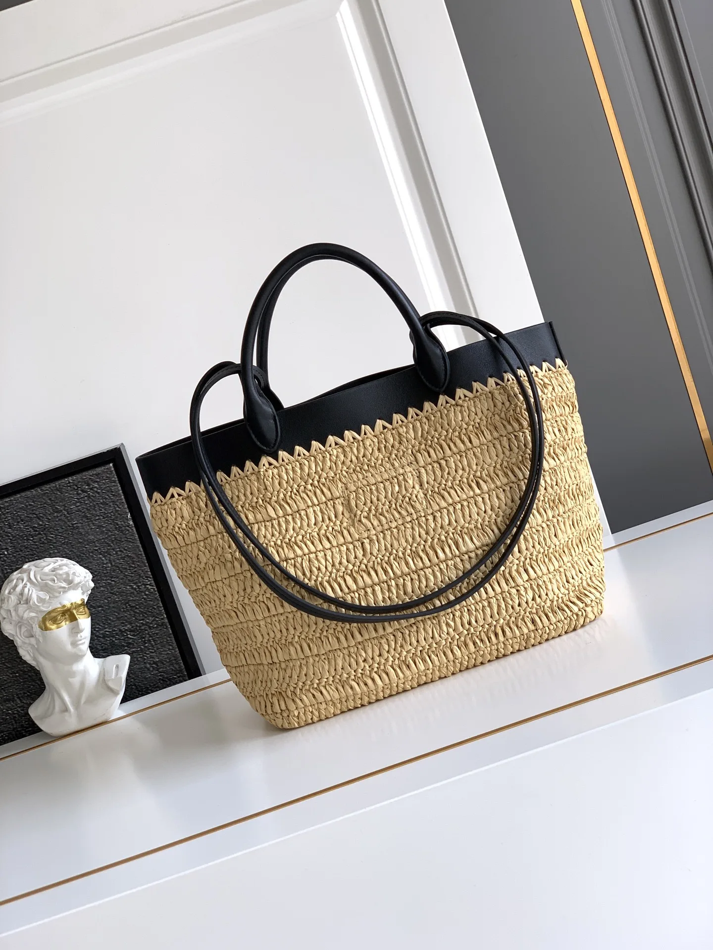 新款草编托特包 这款现代而精致的托特包结合钩编工艺和皮革细节 营造出夏日氛围 牛皮双提手 可用作手提包或单肩包 正面饰以撞色刺绣字母徽标 增添辨识度 精致的编织包身散发出浓郁的春夏气息啦 简单背着就能赋予无与伦比的高级质感啦 空间容量大 又是一个经典爆款啦