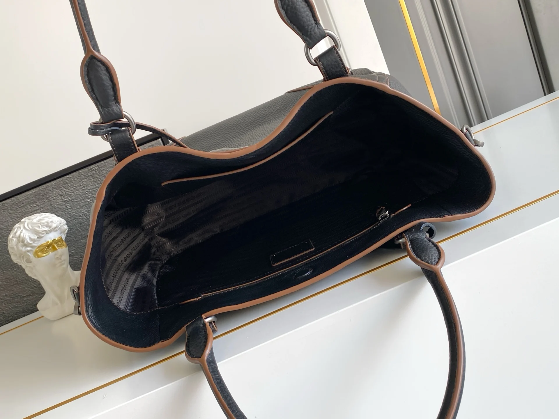 这款手提袋标志着回归DNA的根源 其设计令人想起旅行主题 宽松实用的廓形由纹理丰富的皮革和不规则纹理制成 营造出自然而精致的效果 皮革手柄