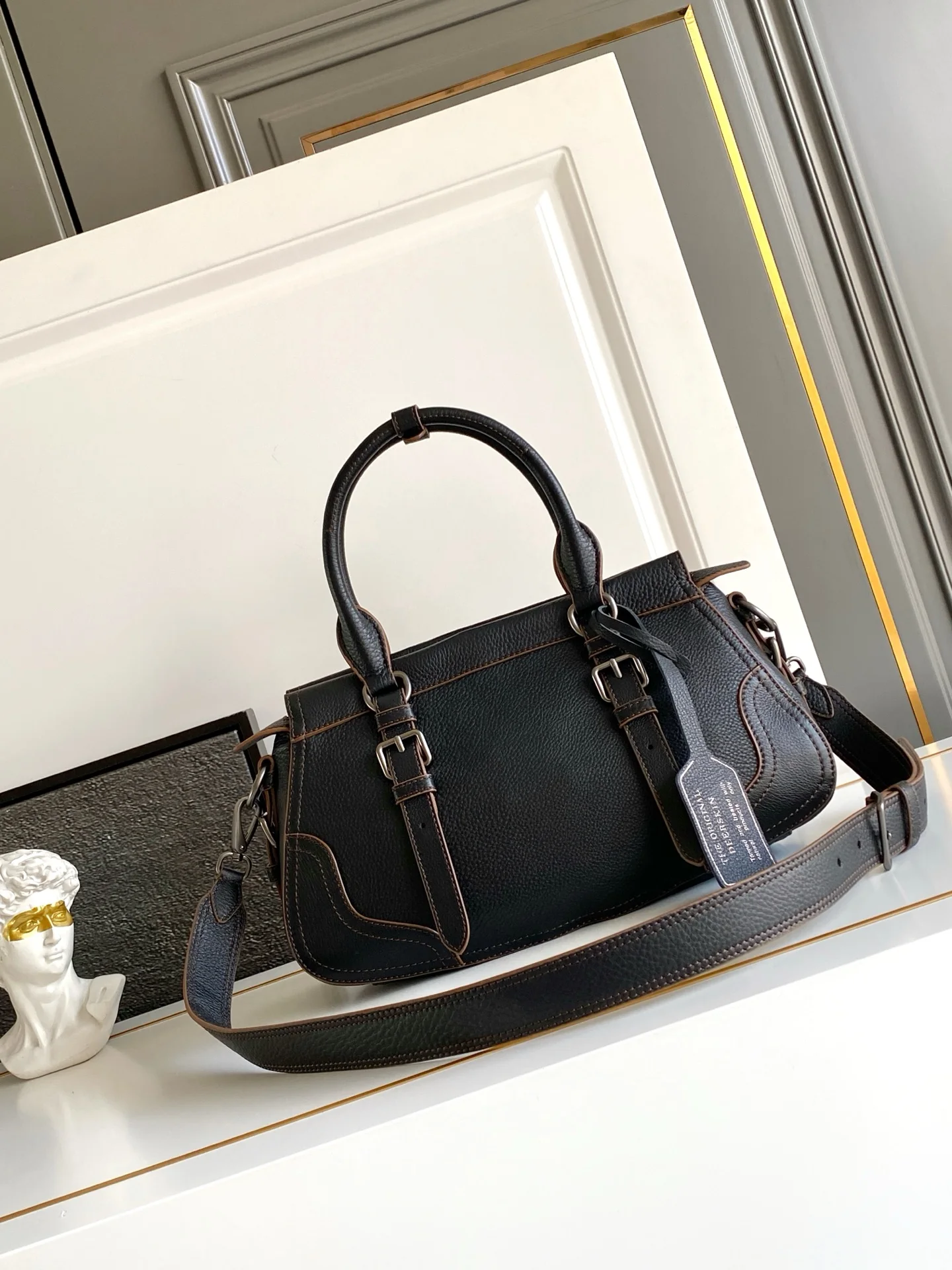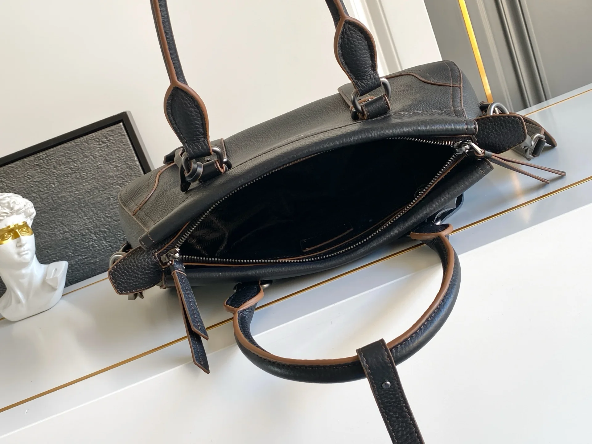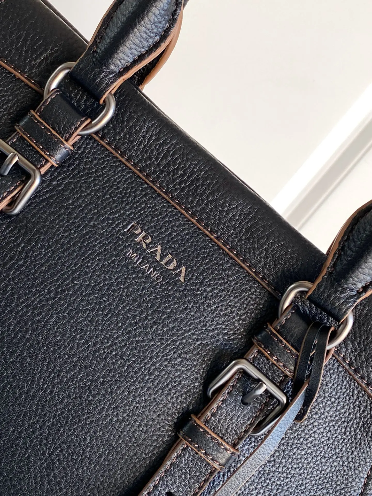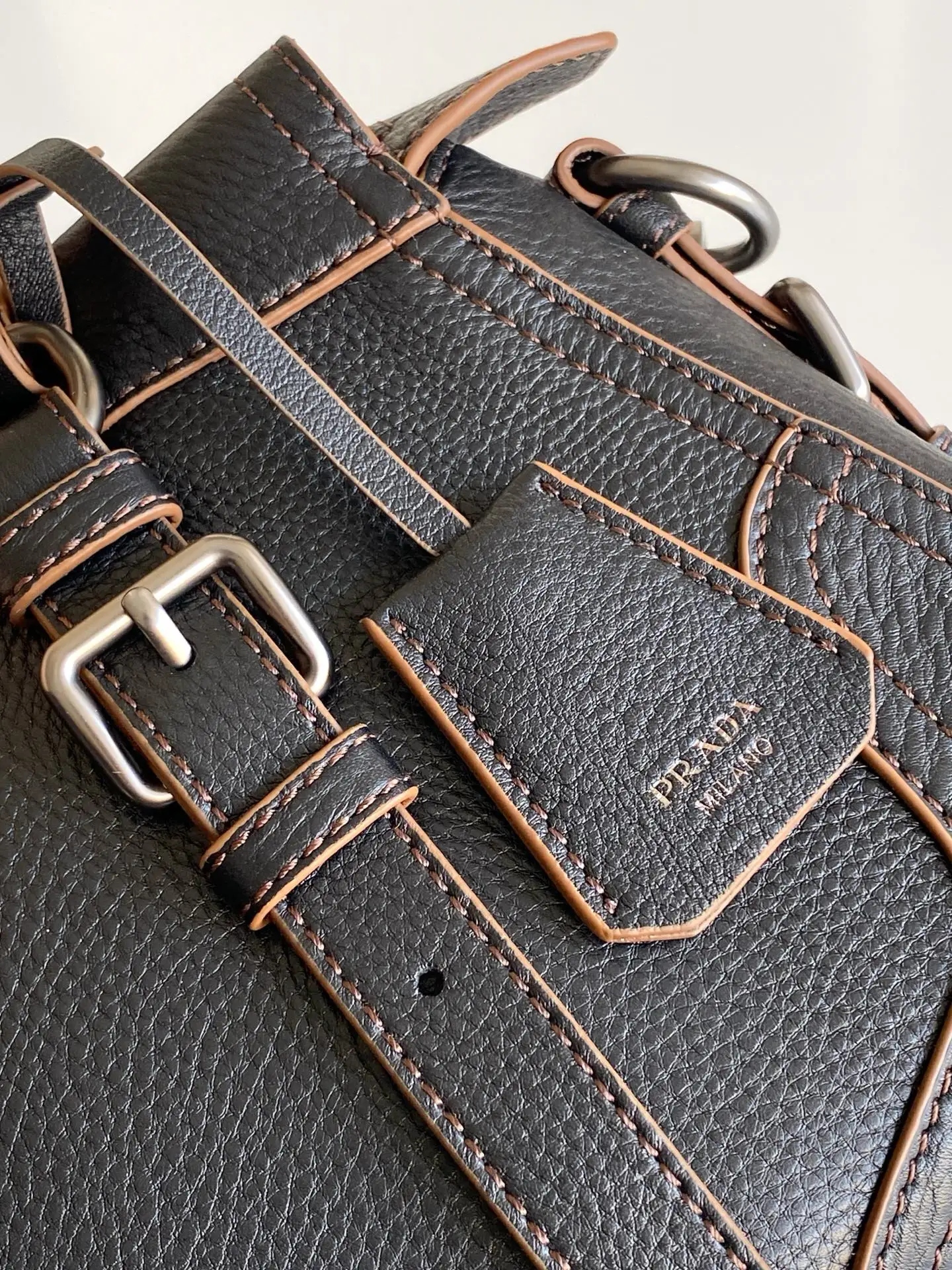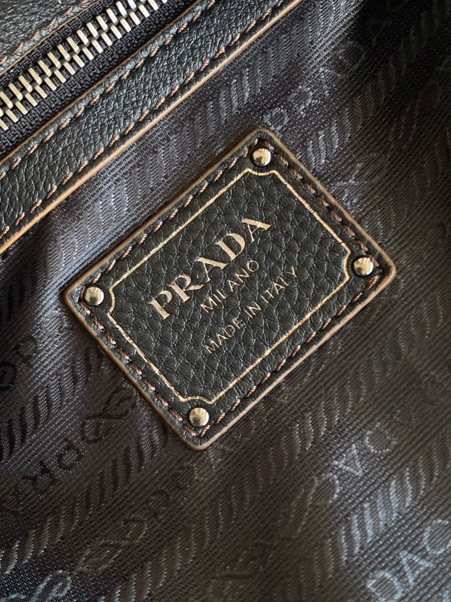 新款手提包这款包袋以设计重返Prada DNA的根源 唤起旅行主题这款紧凑多功能的皮革廓形 质地丰富且纹理不规则 配有可拆卸肩带 可多种方式佩戴 加固的角落 灵感源自旅行包