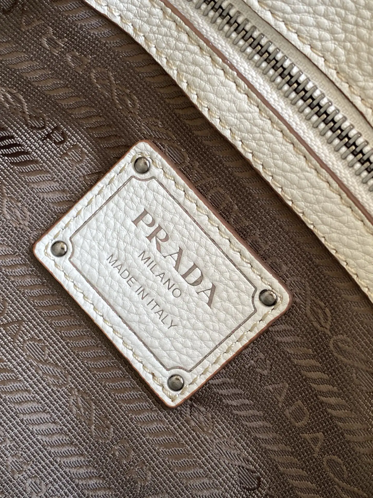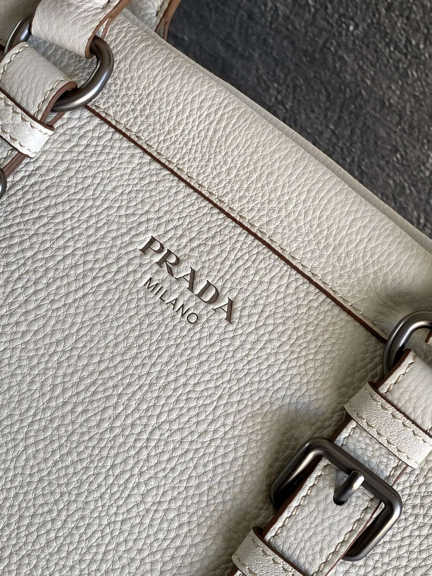 新款手提包这款包袋以设计重返Prada DNA的根源 唤起旅行主题这款紧凑多功能的皮革廓形 质地丰富且纹理不规则 配有可拆卸肩带 可多种方式佩戴 加固的角落 灵感源自旅行包