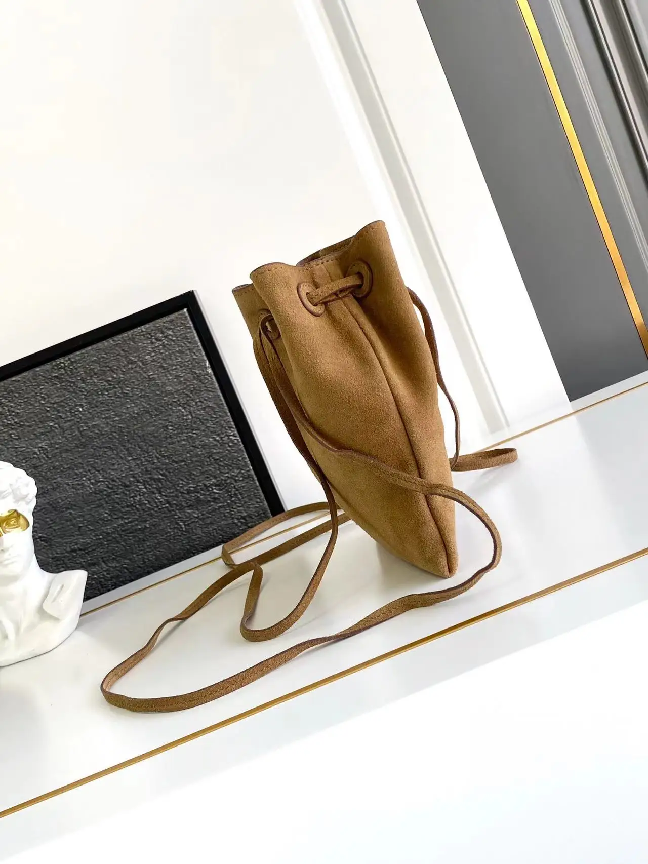 这款小斜跨包采用进口绒皮 磨砂皮 和内配进口羊皮 顶级五金 袋口为抽绳缩口袋 双条长肩带设计 上身效果显得格外时尚又休闲 容量空间大赶紧入手吧 把这个可爱爆款小斜跨带回家吧