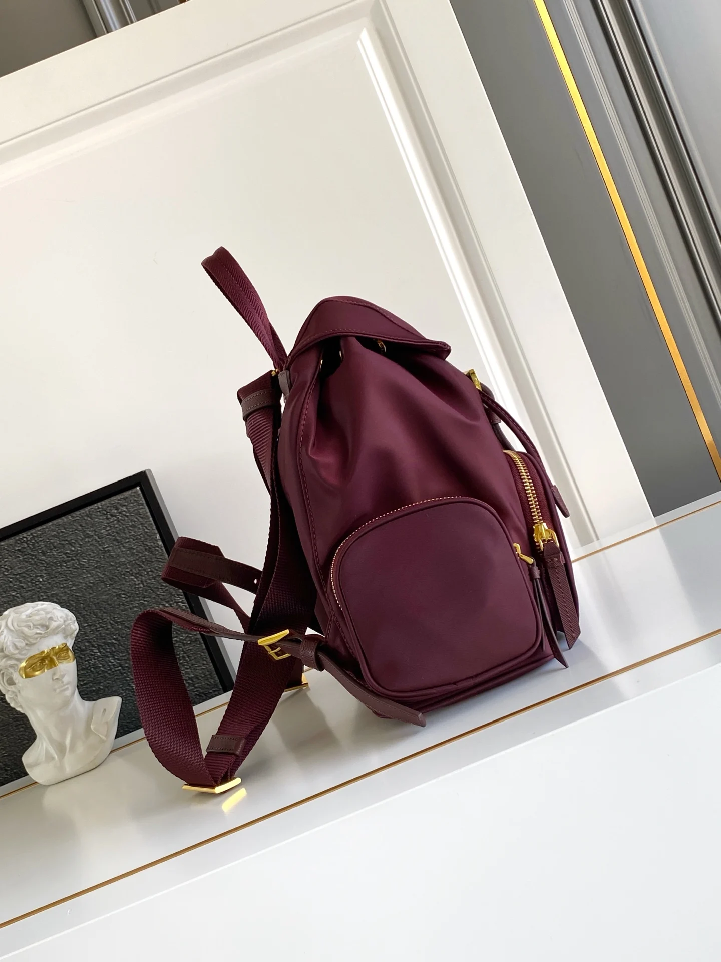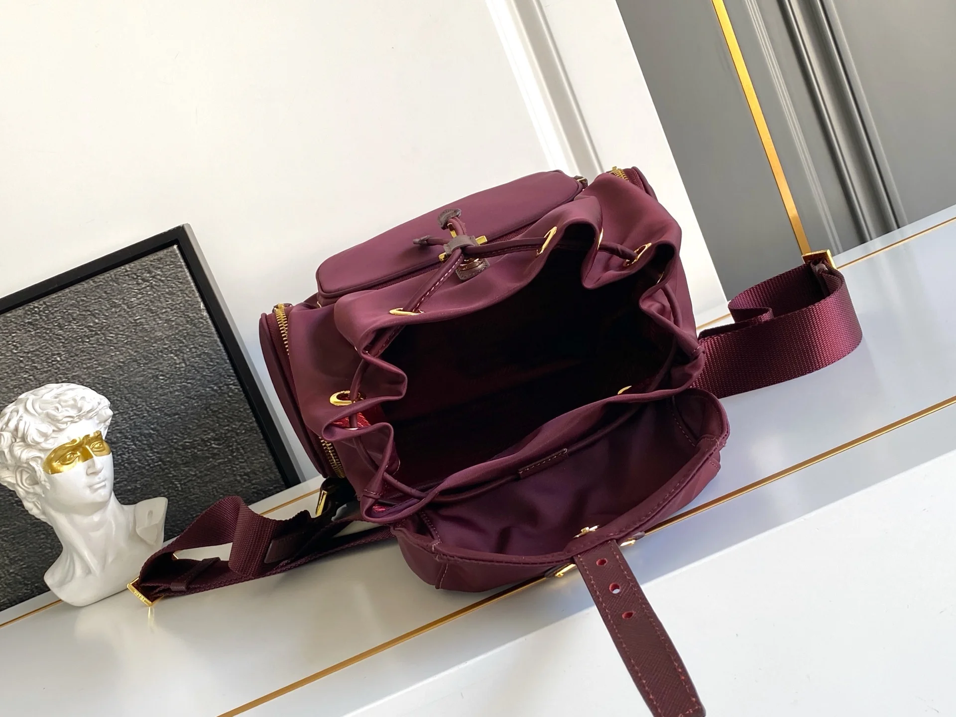 这款双肩背包采用进口尼龙布包面料 包身为三个拉琏口袋设计 袋口以翻盖抽绳开合 顶级五金 容量空间大 口袋多多非常实用上身效果非常好看 宝宝们赶紧入手吧 又是一款永久不过时爆款