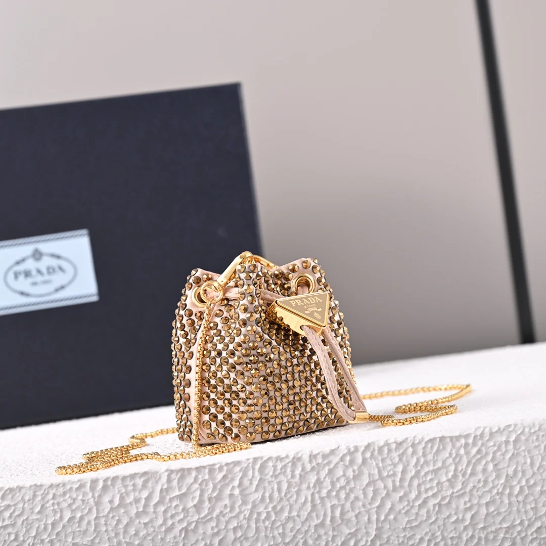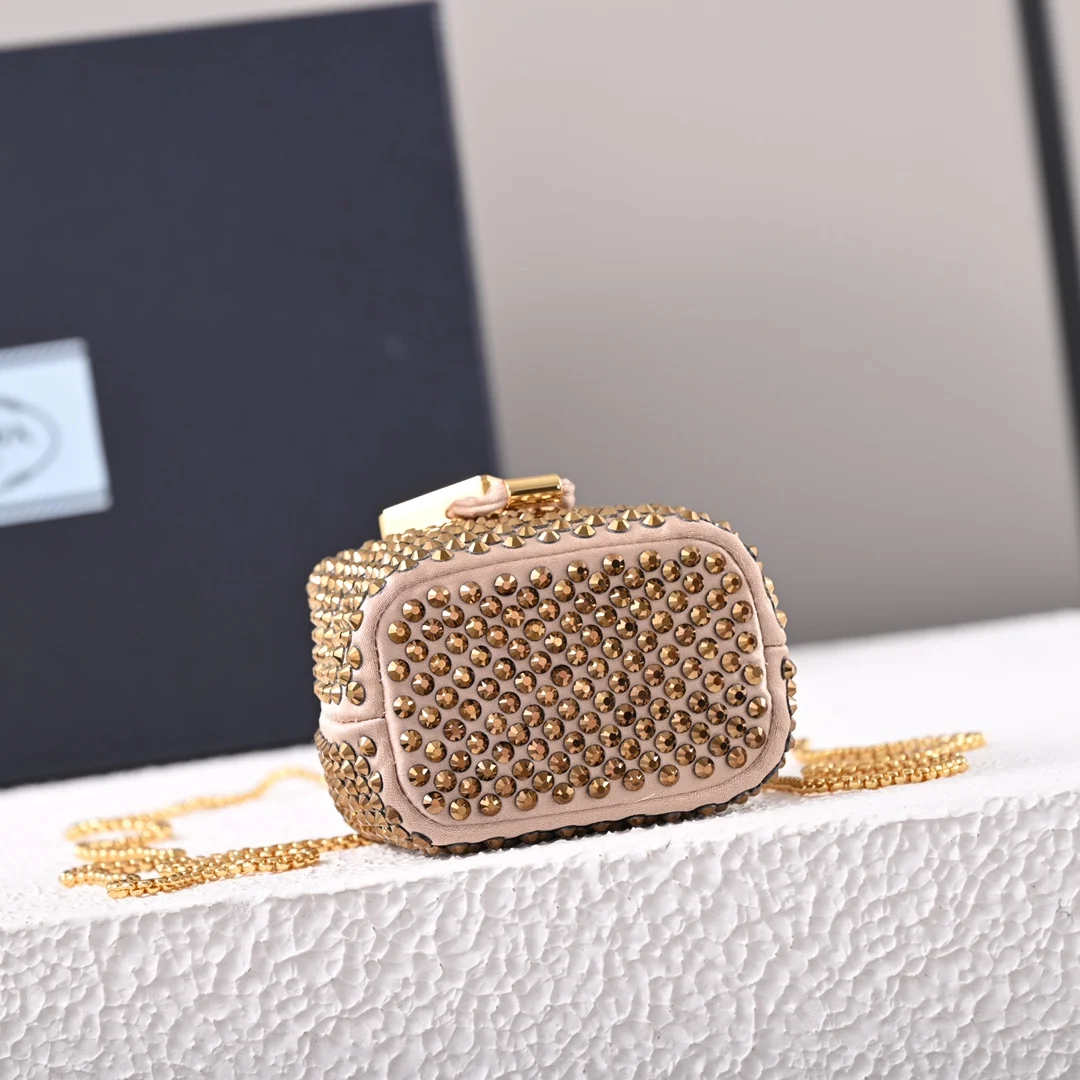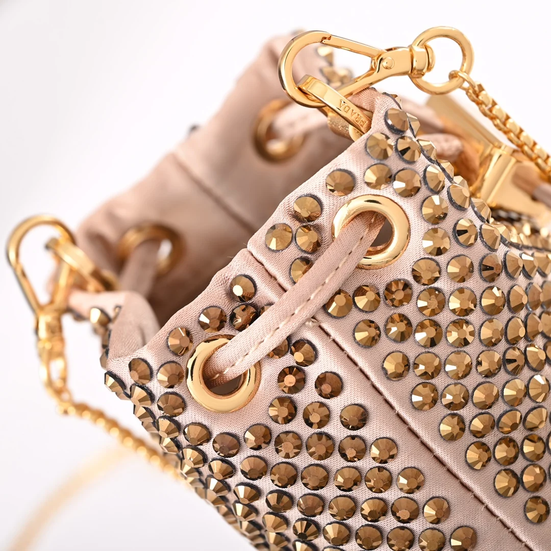 这款mini小水桶采用进口仿水晶和缎面材料组合 涂珐琅金属三角形徽标装饰开合设计 金属铁琏可斜跨 太可爱了 bling bling的效果非常吸眼 可仙可酷 难道你不心动 美妞们 赶紧入手吧 太美太可爱了