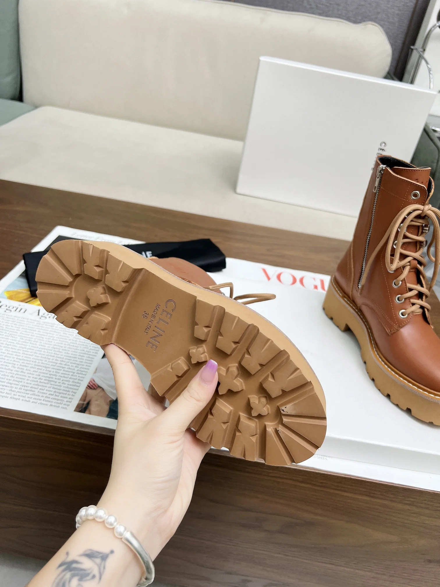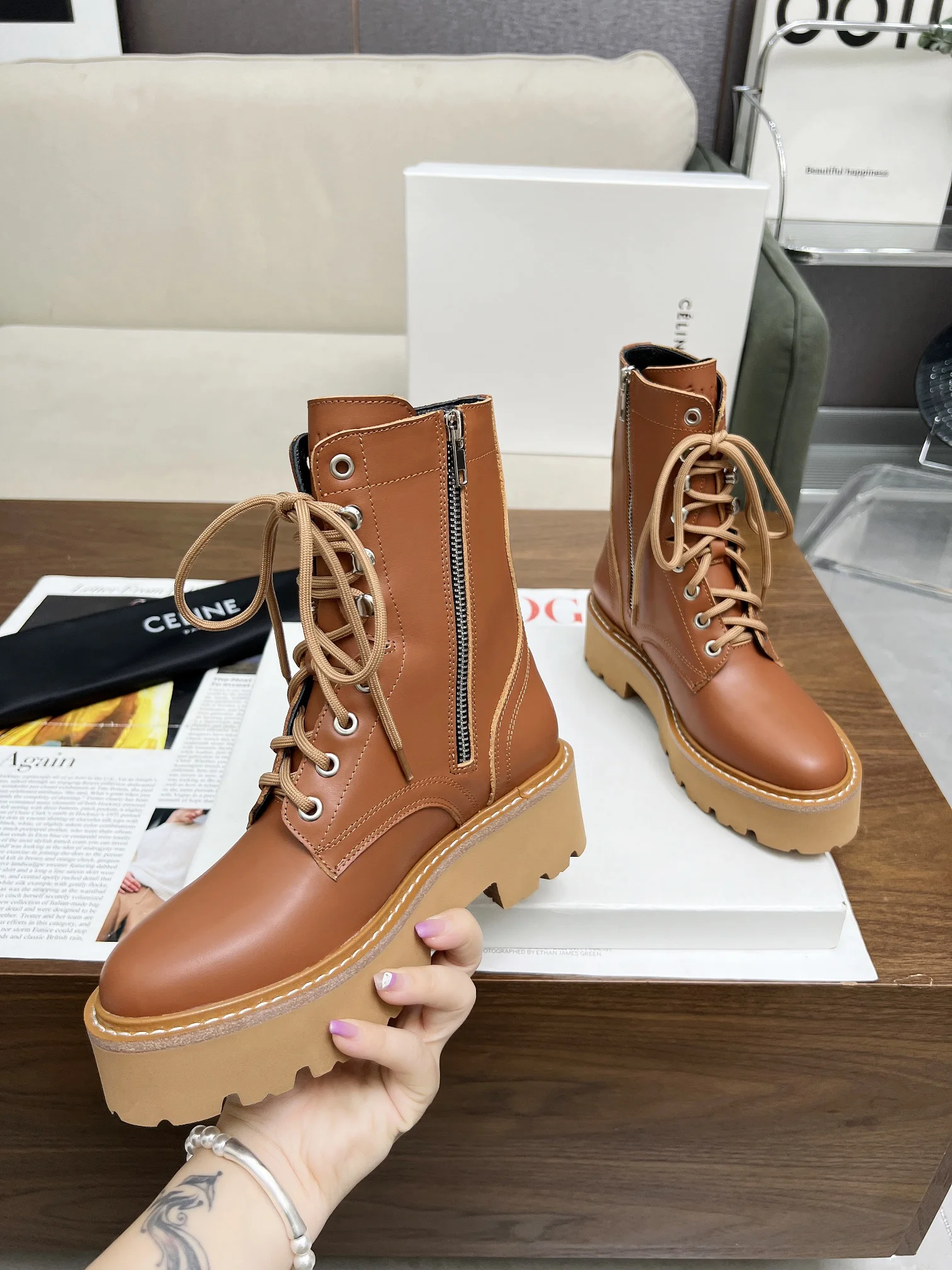 赛琳 2024凯旋门马丁系带厚底平底粗跟粗靴