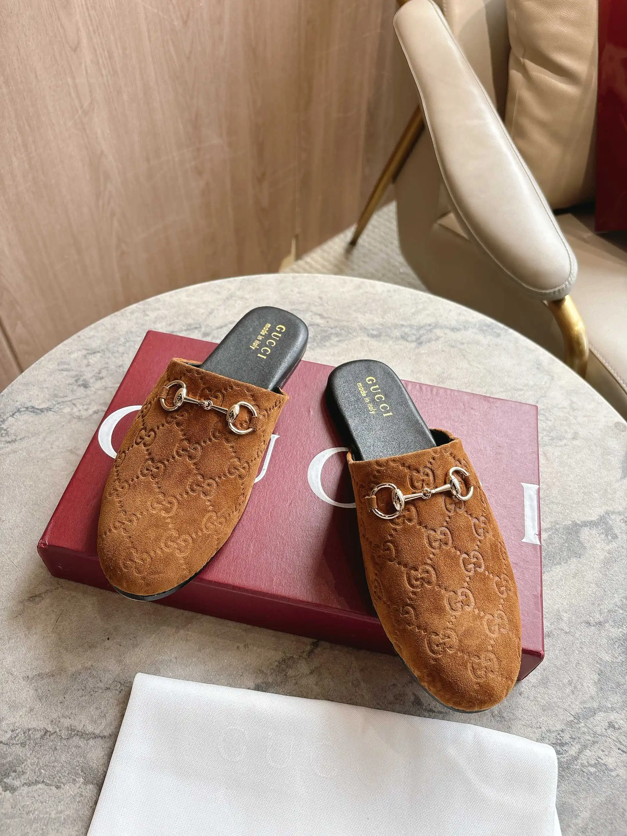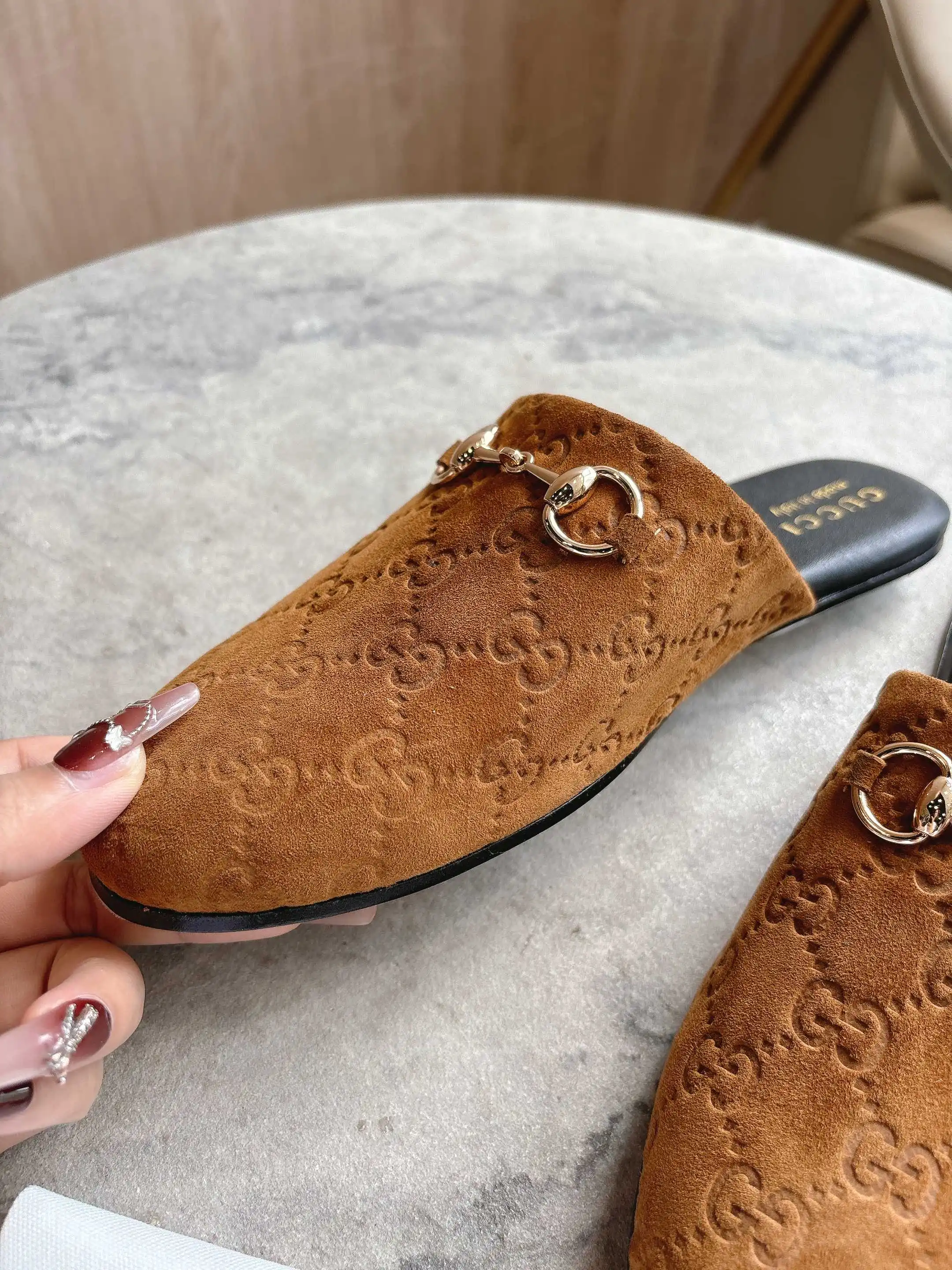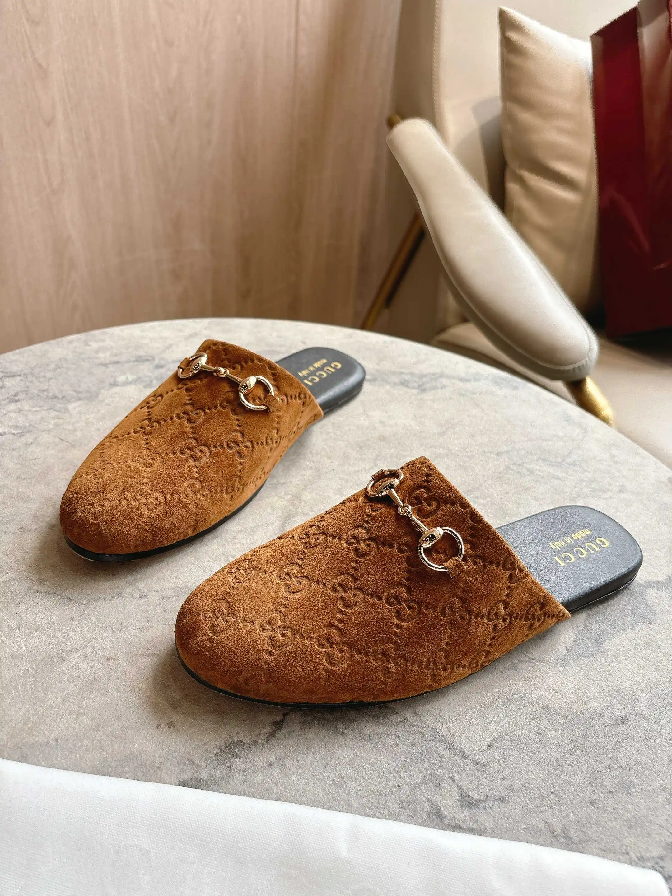 3669-10 棕G 35-42 2025秋冬系列, 典藏图案继续在Gucci全新系列中大放异彩 全新系列匠心呈献马衔扣配件 彰显品牌马术传承 这款男士穆勒鞋采用光滑绒面材质匠心打造 搭配浅金色调配件增添亮眼细节