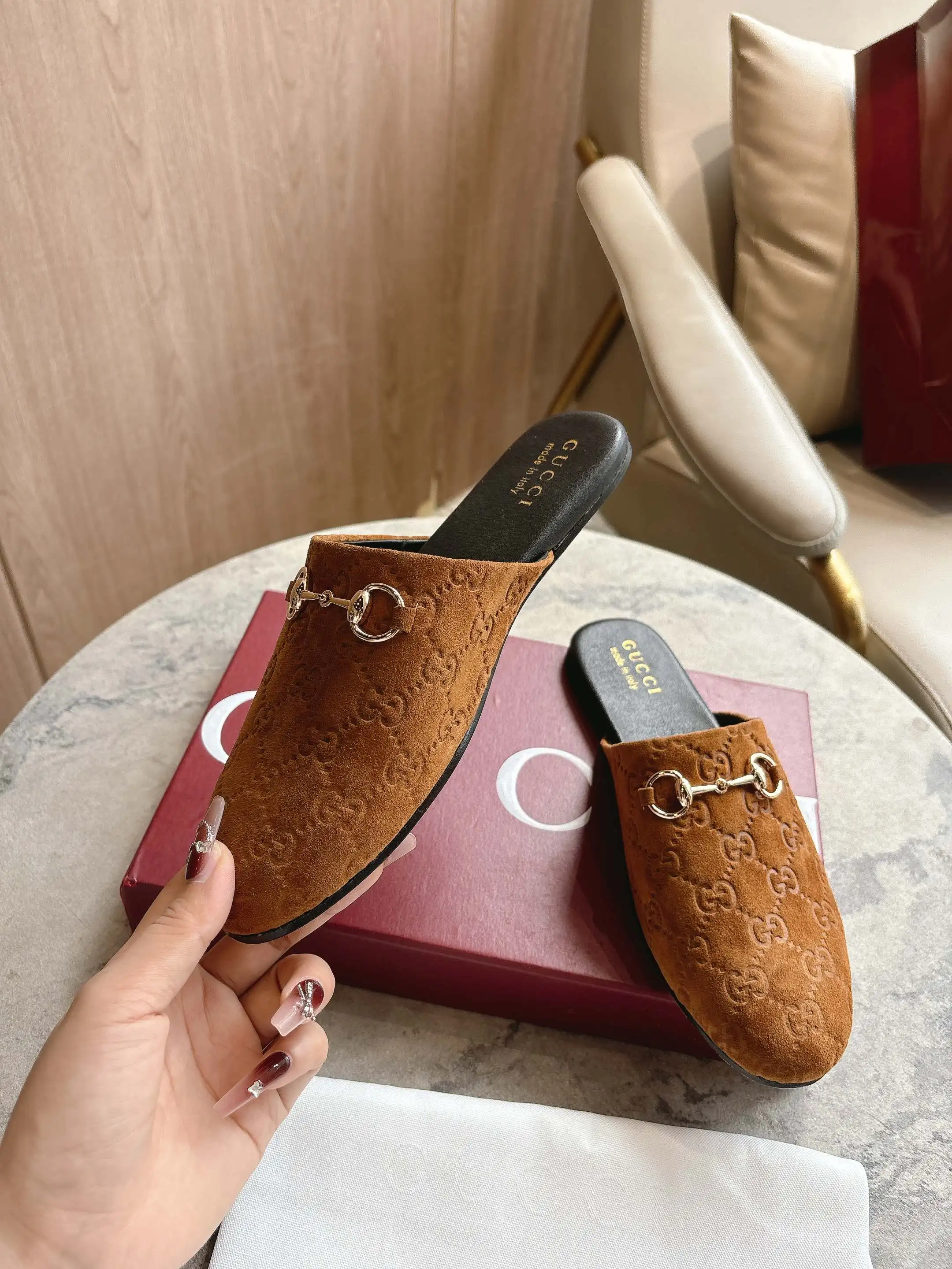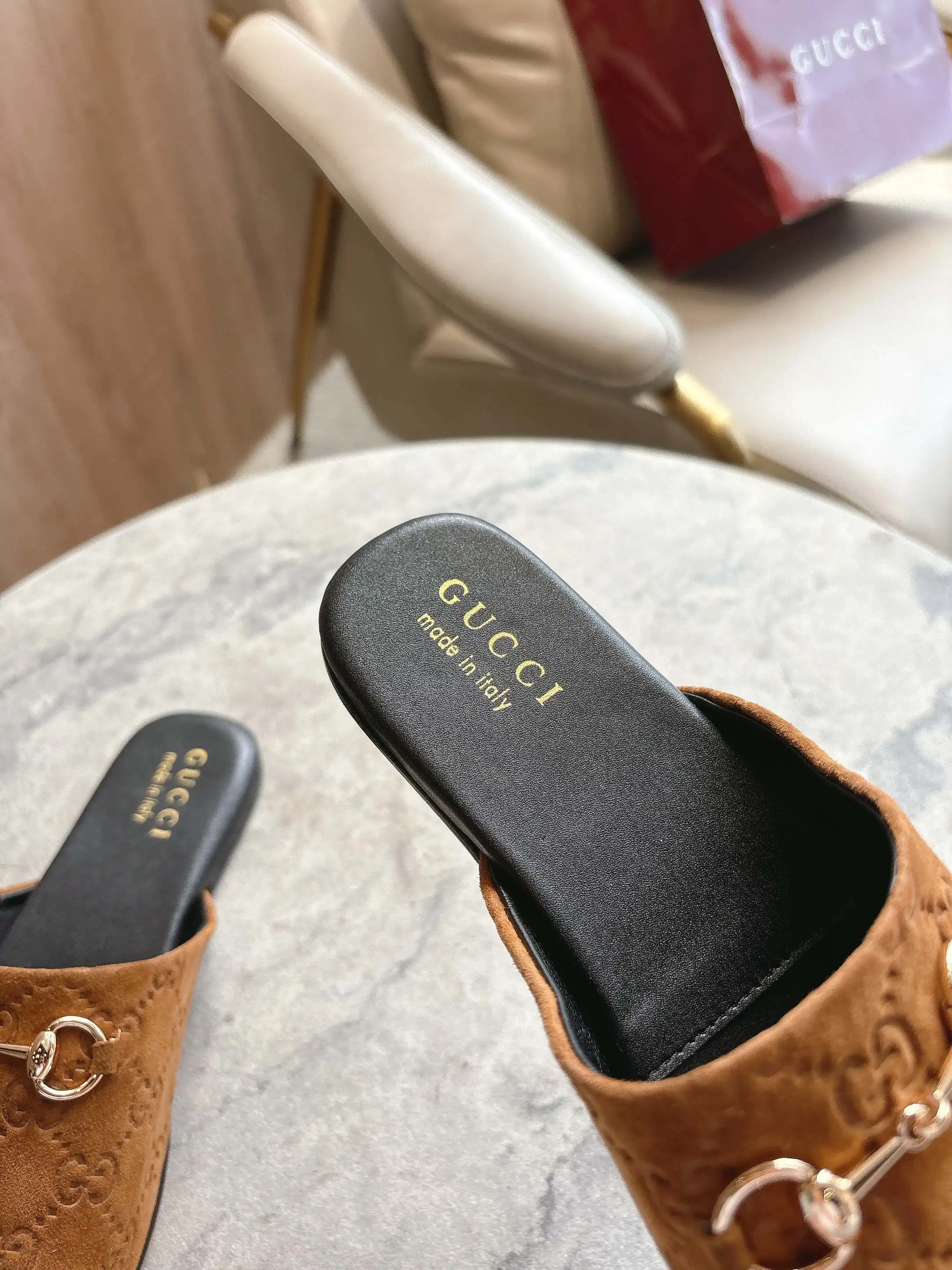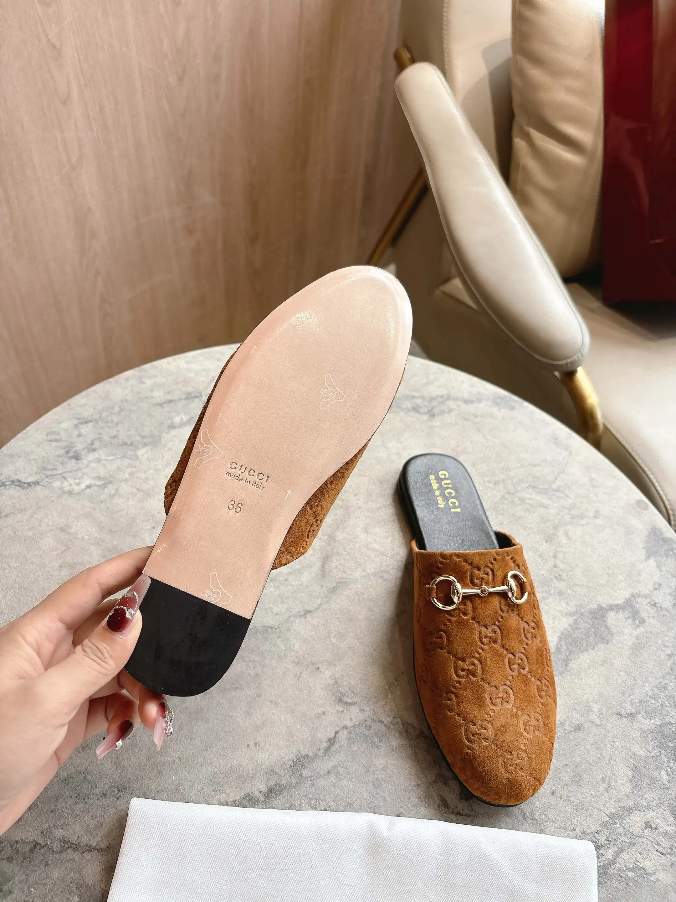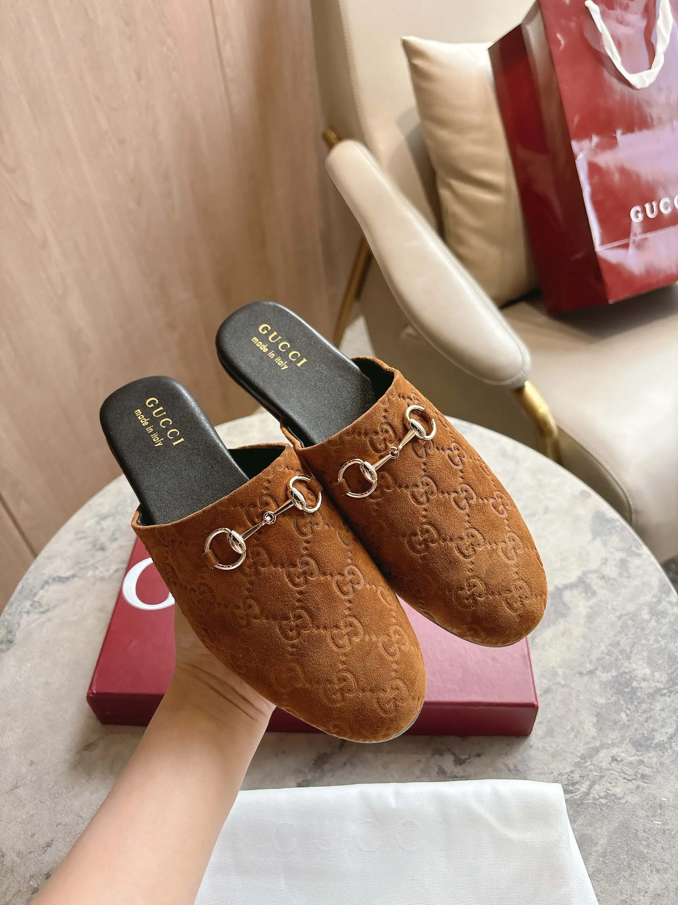 3669-10 棕G 35-42 2025秋冬系列, 典藏图案继续在Gucci全新系列中大放异彩 全新系列匠心呈献马衔扣配件 彰显品牌马术传承 这款男士穆勒鞋采用光滑绒面材质匠心打造 搭配浅金色调配件增添亮眼细节
