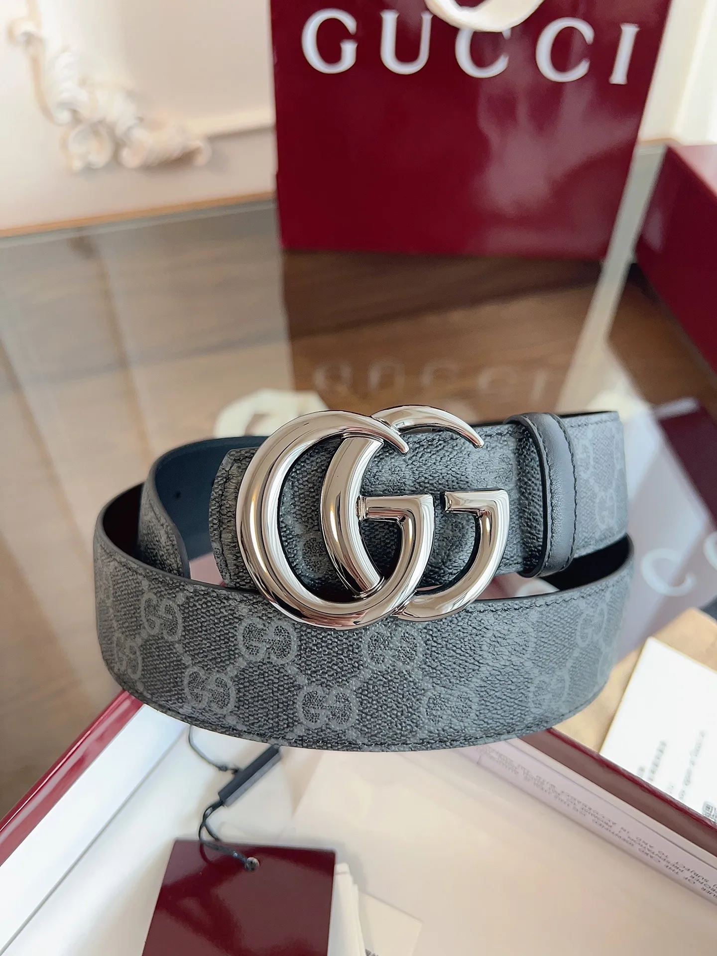 Gucci 这款男士腰带亮眼吸睛 是2026早春系列之一 腰带扣设有一个销钉 可轻松翻转互扣式双G造型配件 一面为柔软GG supreme帆布 另一面为黑色皮革 宽度4cm