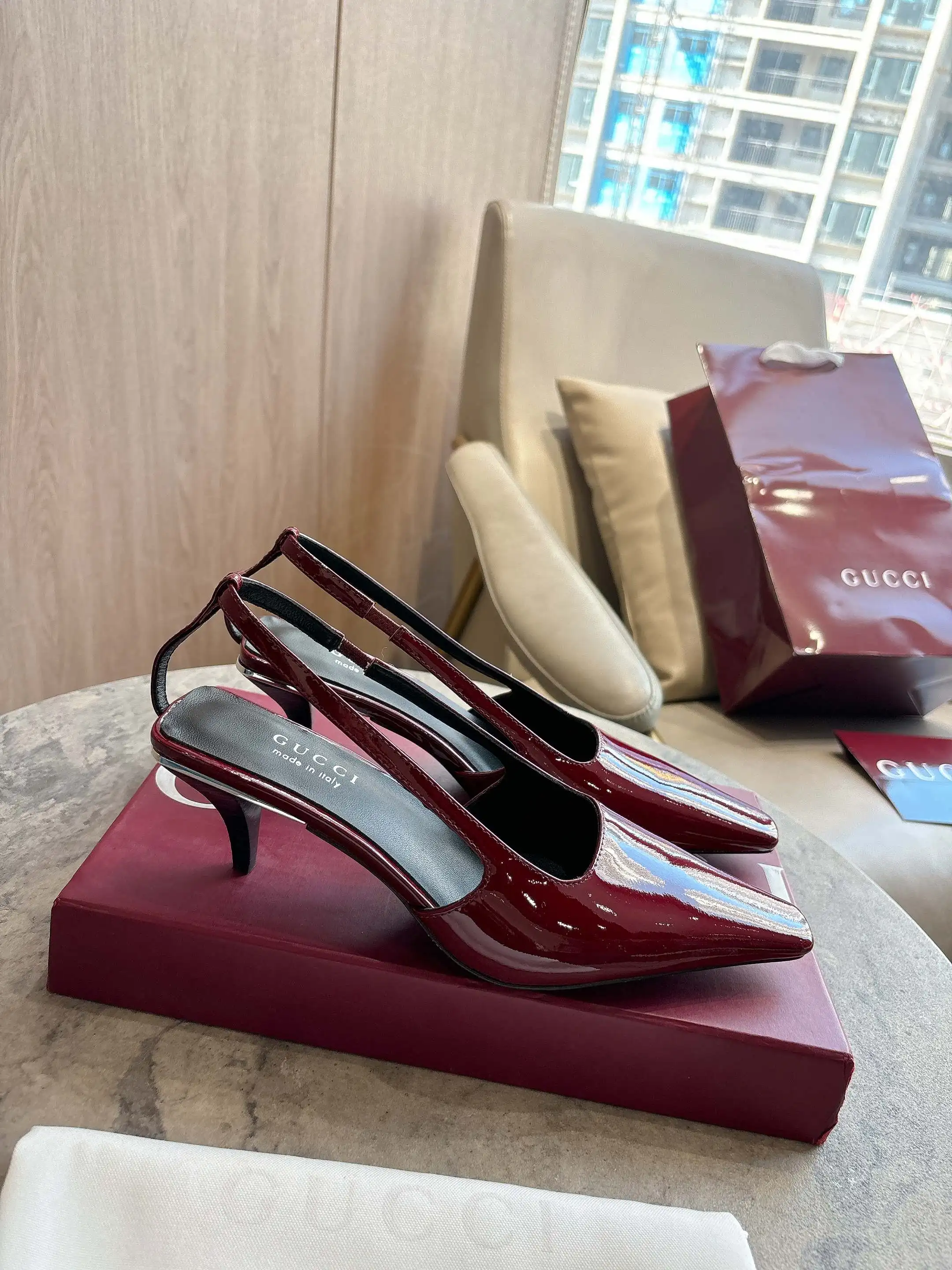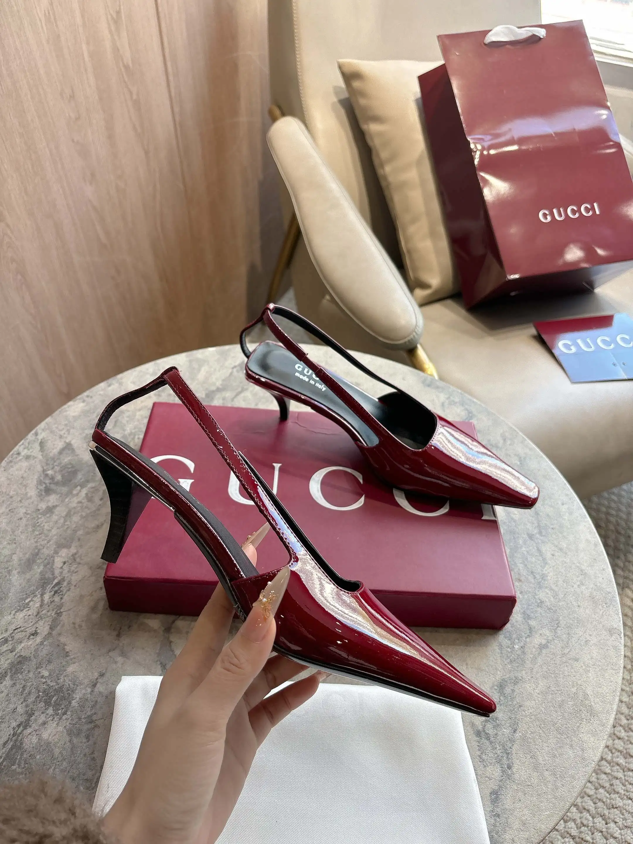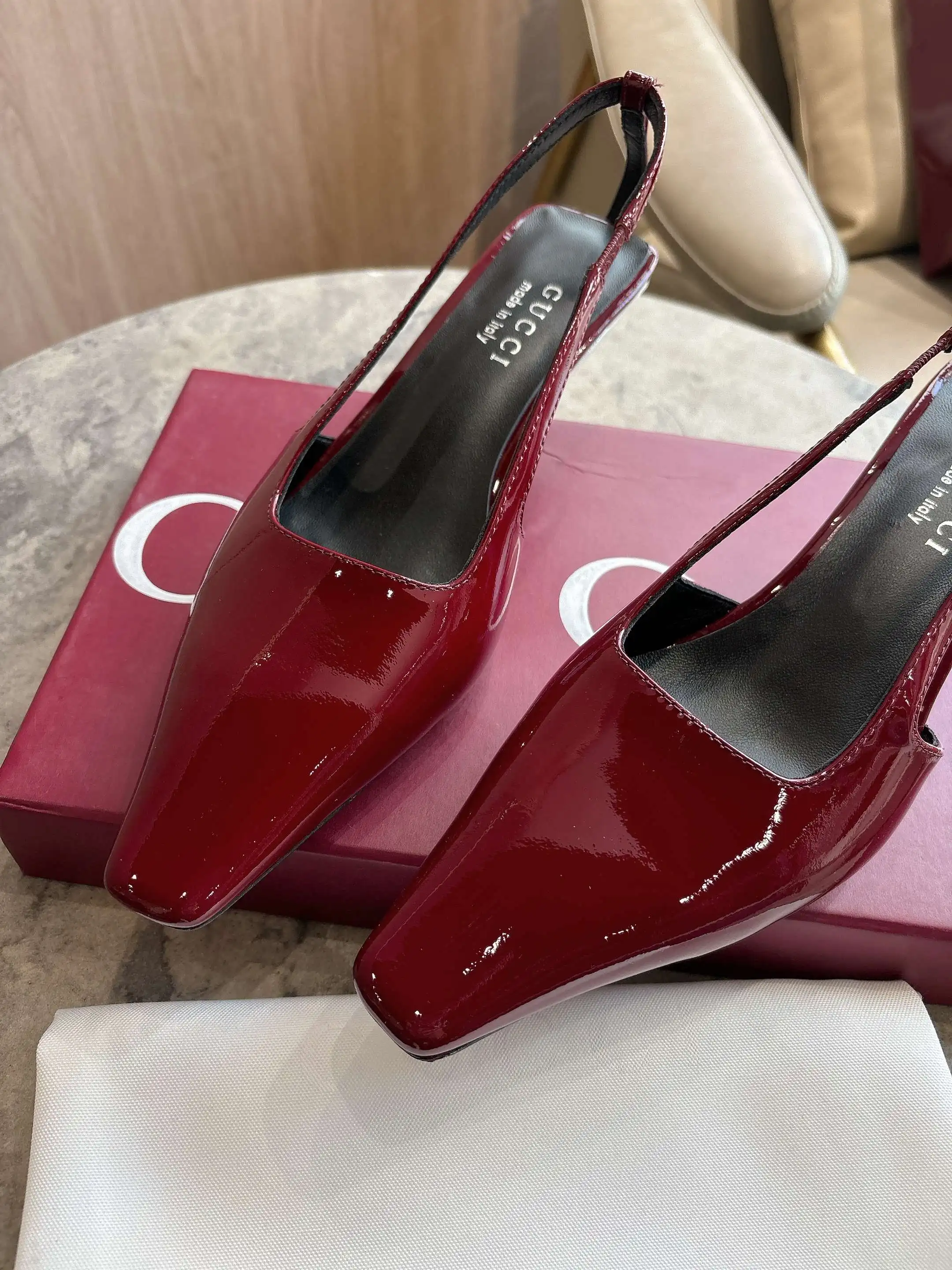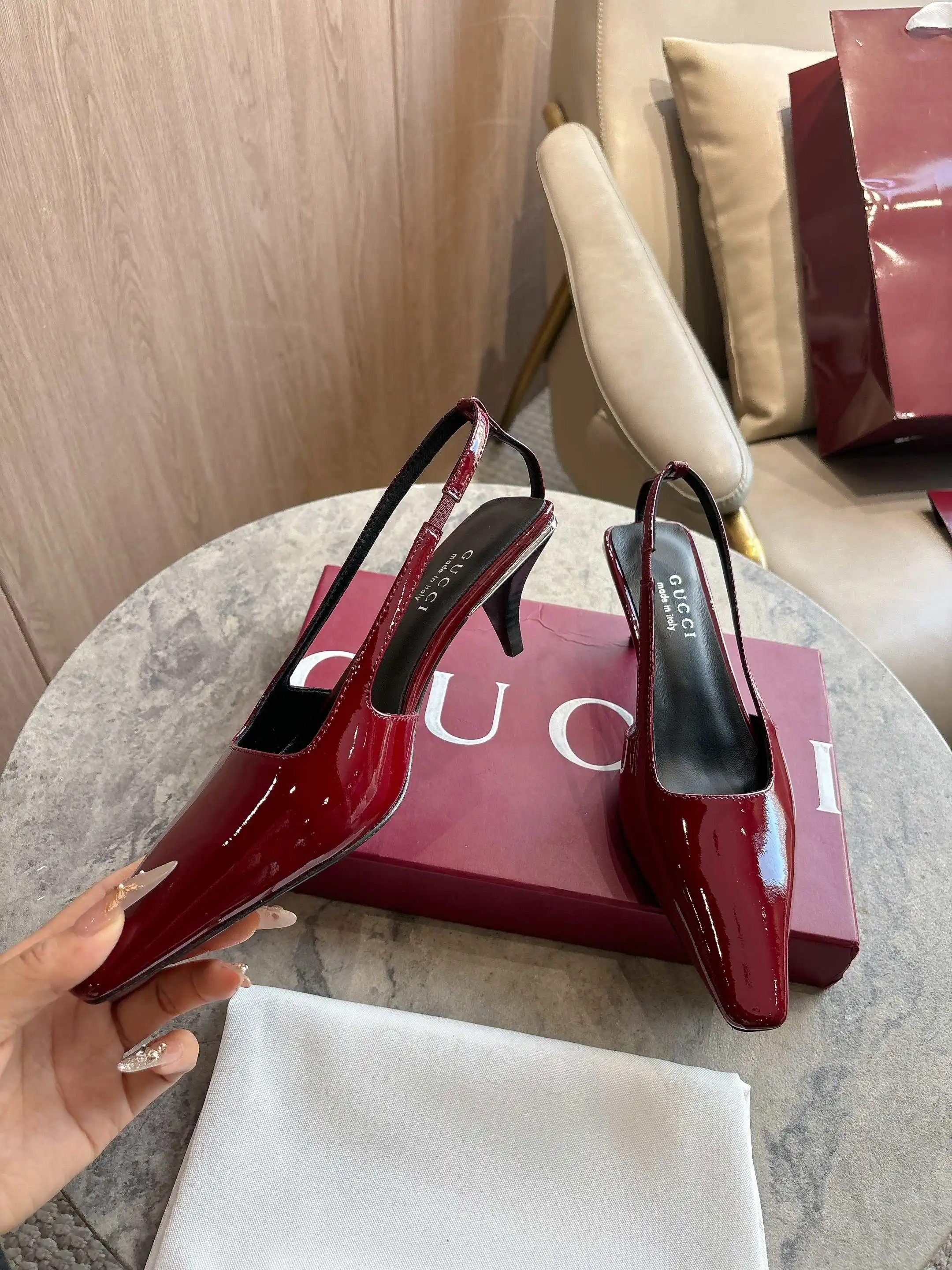 3570-2 酒红 25-42 这款后系带鞋于2026早春系列时装秀首度亮相 加长方头廓形匠心诠释20世纪90年代的繁美风韵 鞋履汲取品牌典藏设计灵感 右鞋跟后方饰有仿水晶标识金属饰片 彰显别致格调