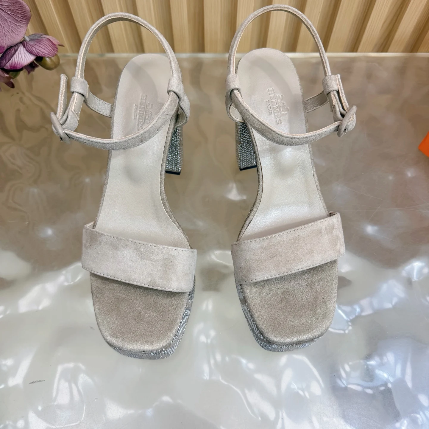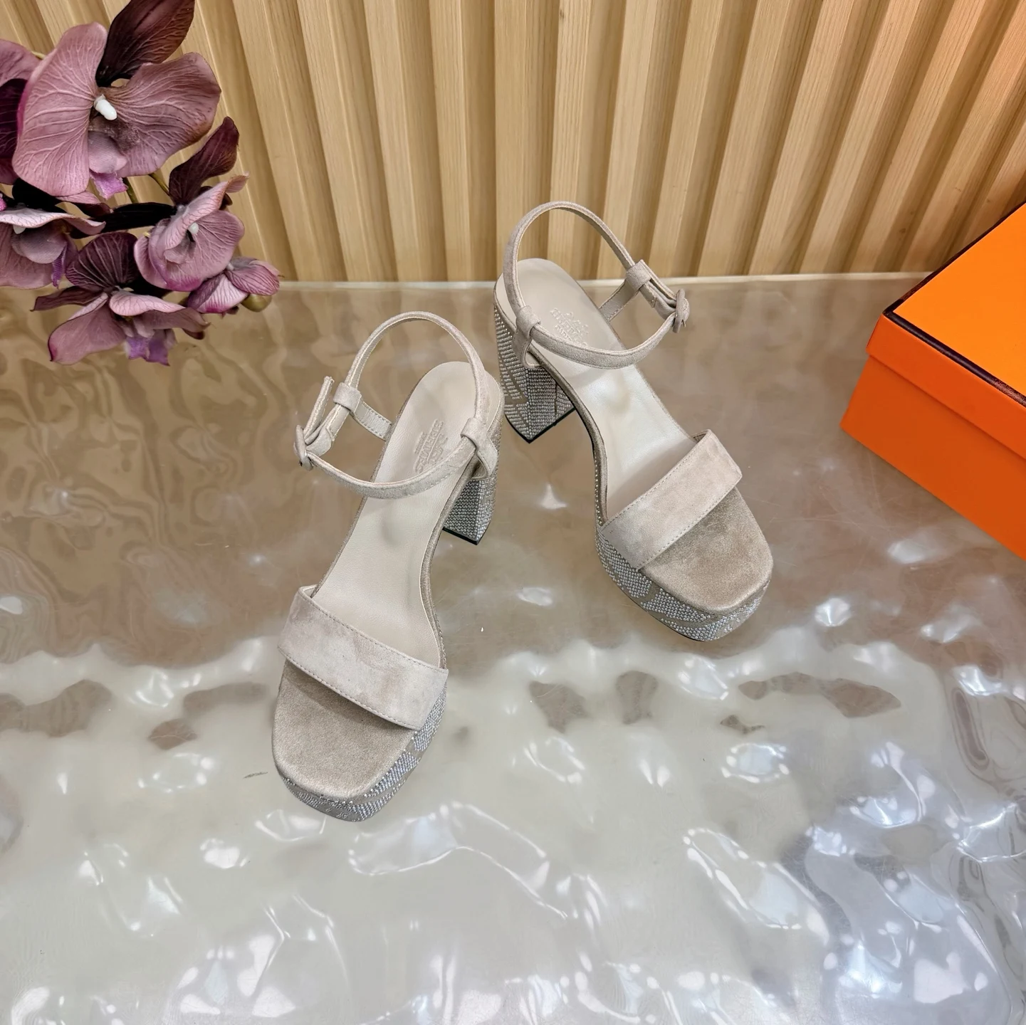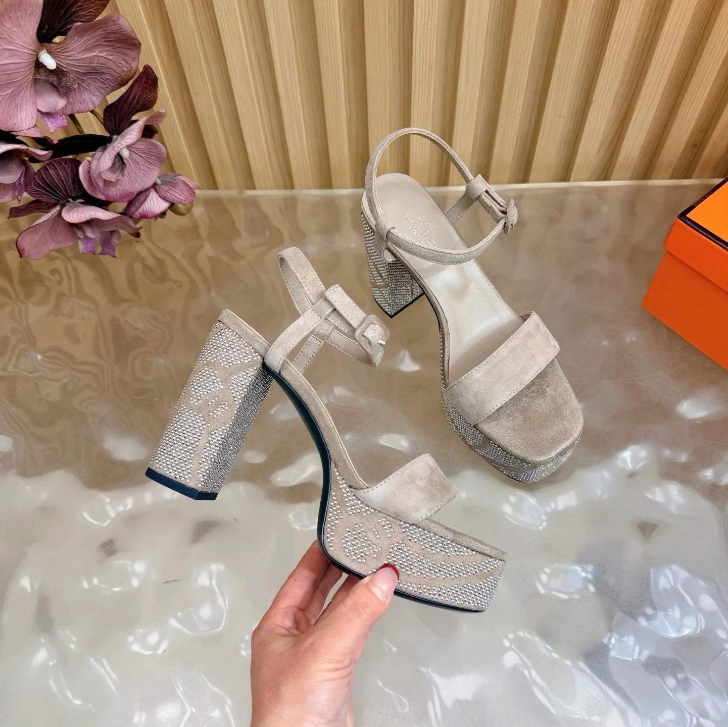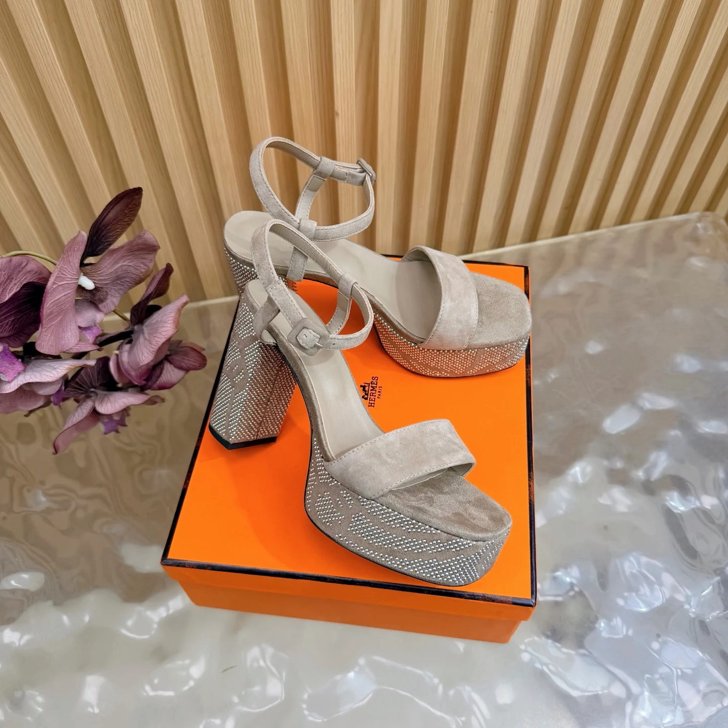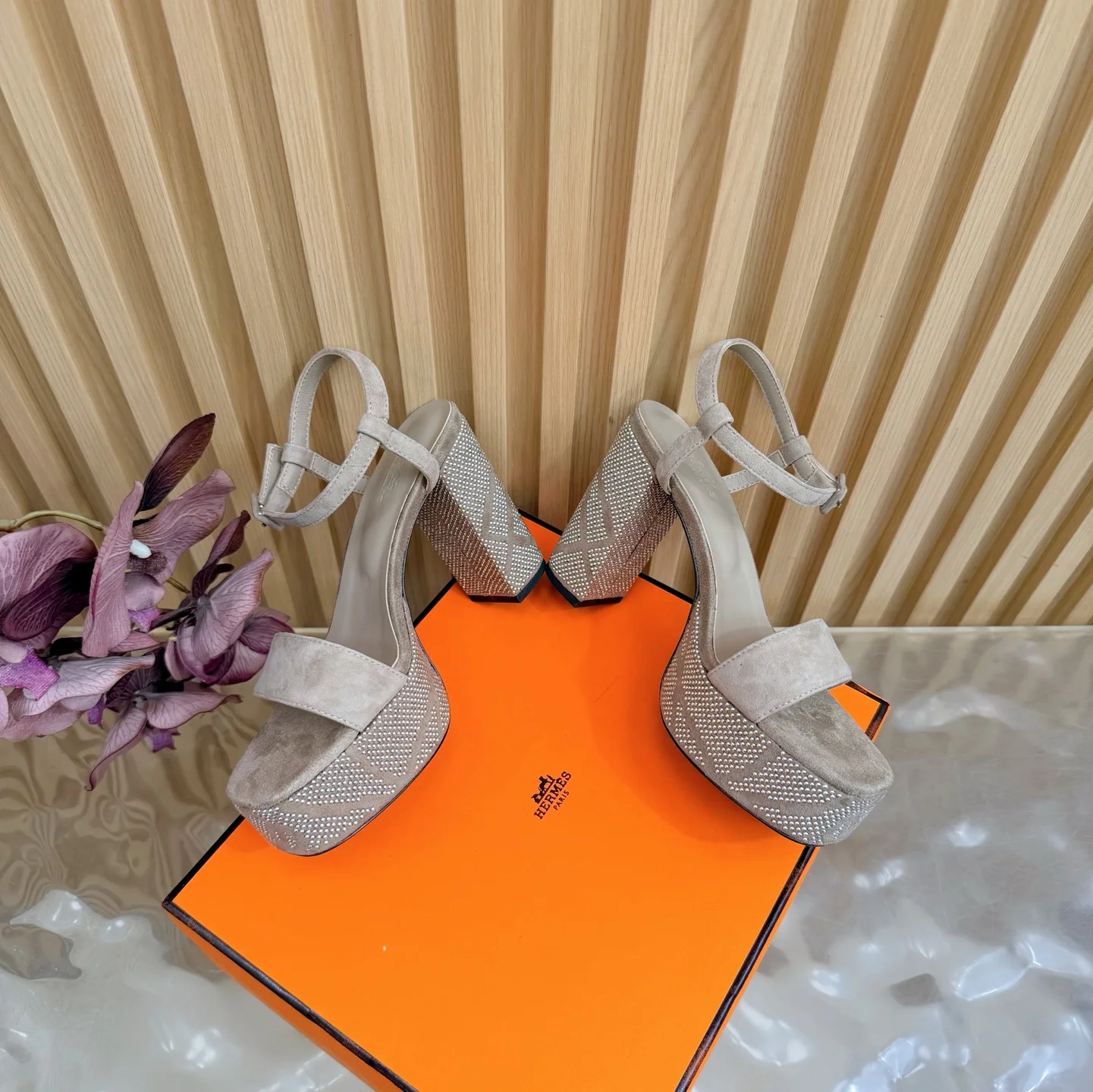 新款 2026早春新款 Hermes/爱马仕最新款 烫钻坡跟厚底凉鞋 面料采用进口羊京烫钻/牛皮
