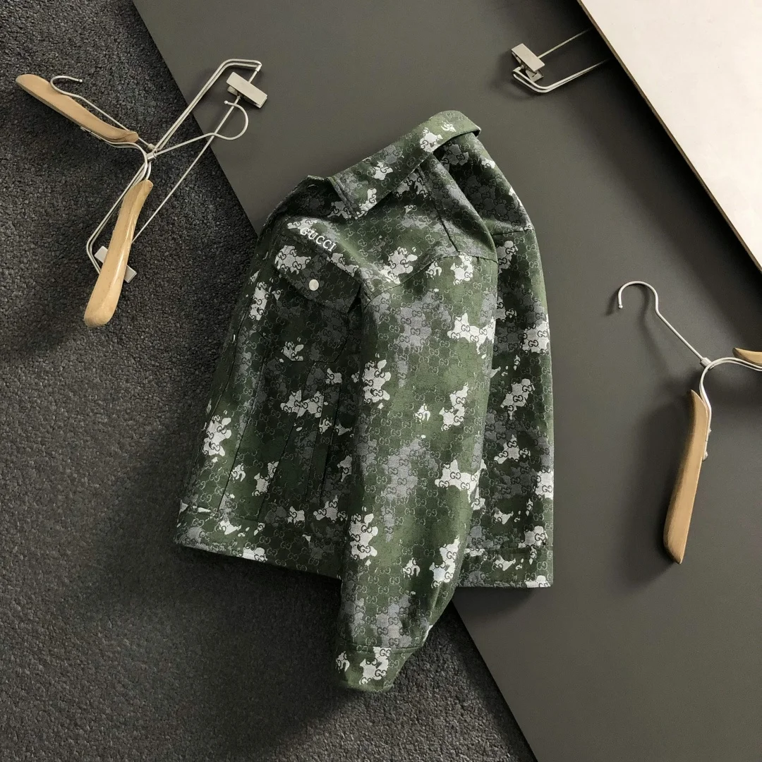 2026春夏潮牌夹克 以迷彩双G字母刺绣搭配点缀为主调 巧妙字母素 彰显个性与不羁 立体剪裁贴合身形 设计利落有型 轻松拉长腿部线条 打造随性洒脱的休闲风格 优质面料挺括耐磨 兼具透气性与舒适感 适合日常出街或轻户外场景 是秋冬过渡季不可或缺的时尚单品