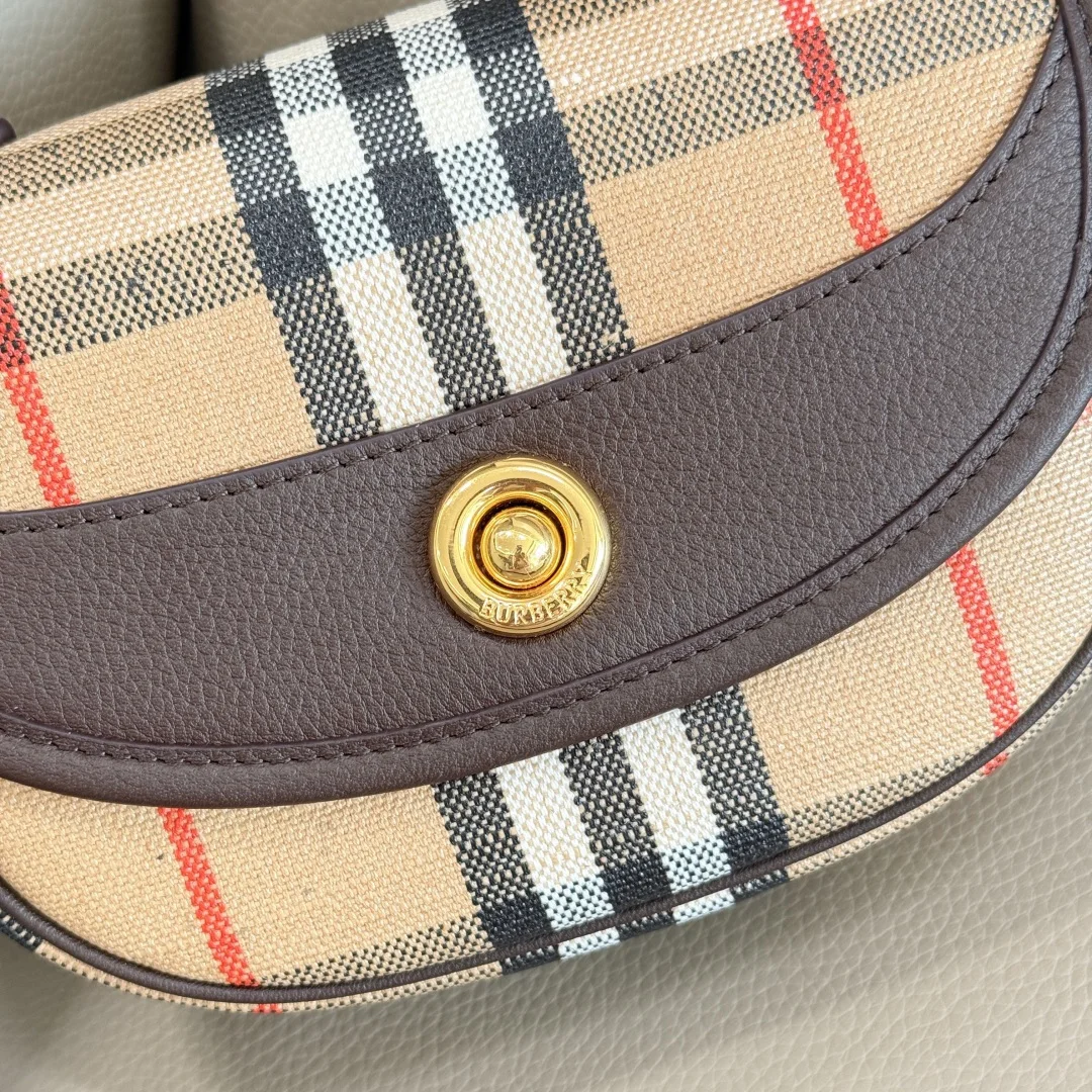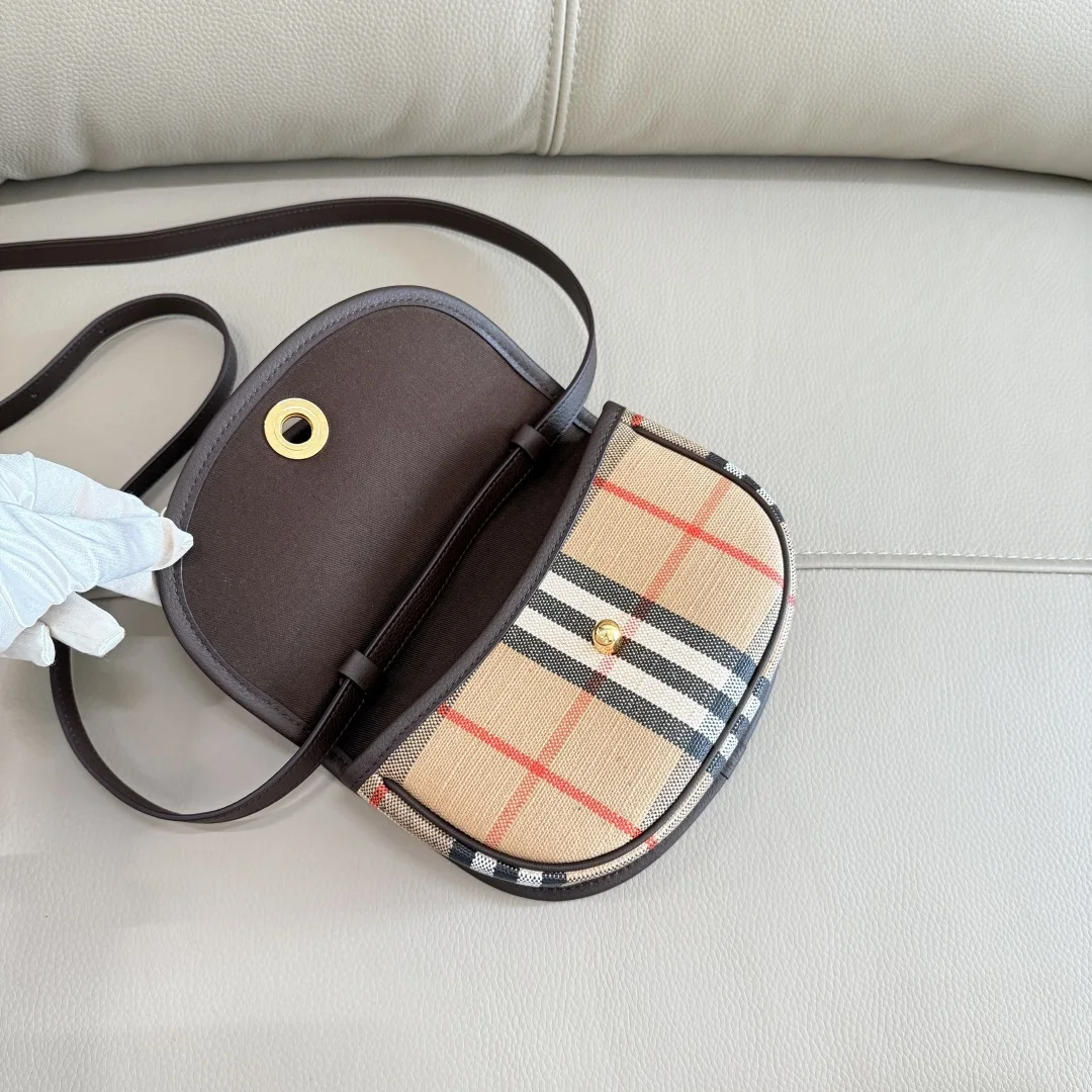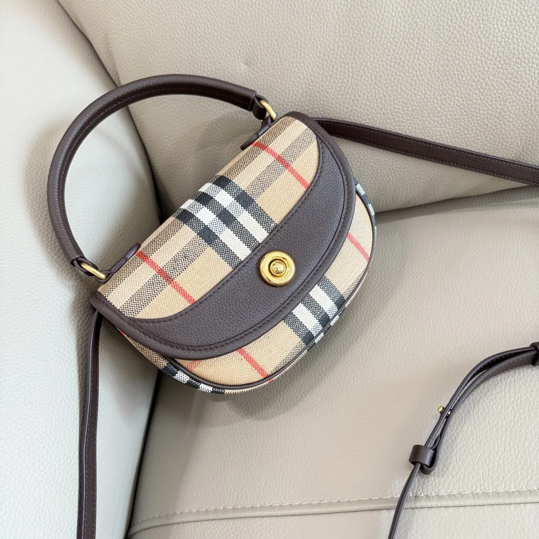 原厂 迷你 Highlands精巧包款汲取户外设计理念打造 选用棉质亚麻混纺面料 于意大利工坊精制而成 融入光滑小牛皮装饰和棉质内衬 装饰提花精纺的 Burberry 格纹 设有风衣灵感涂层饰面 可使用顶部提柄手提 亦可以肩背带缔造肩背或斜背造型 可调式皮肩背