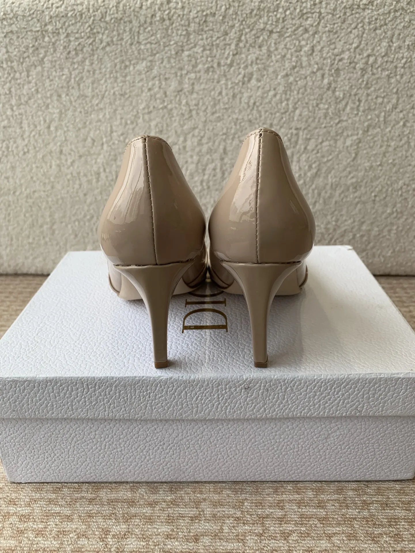 这款My Dior 高跟鞋是二零二五春夏成衣系列新品 彰显精致的优雅气质 采用牛皮革精心制作 尖头设计 点缀以金色饰面金属Christian Dior Paris标志 富有辨识度 彰显Dior 非凡的精湛工艺 镂空装饰和平跟 5 8厘米图形风格鞋跟相得益彰 令..