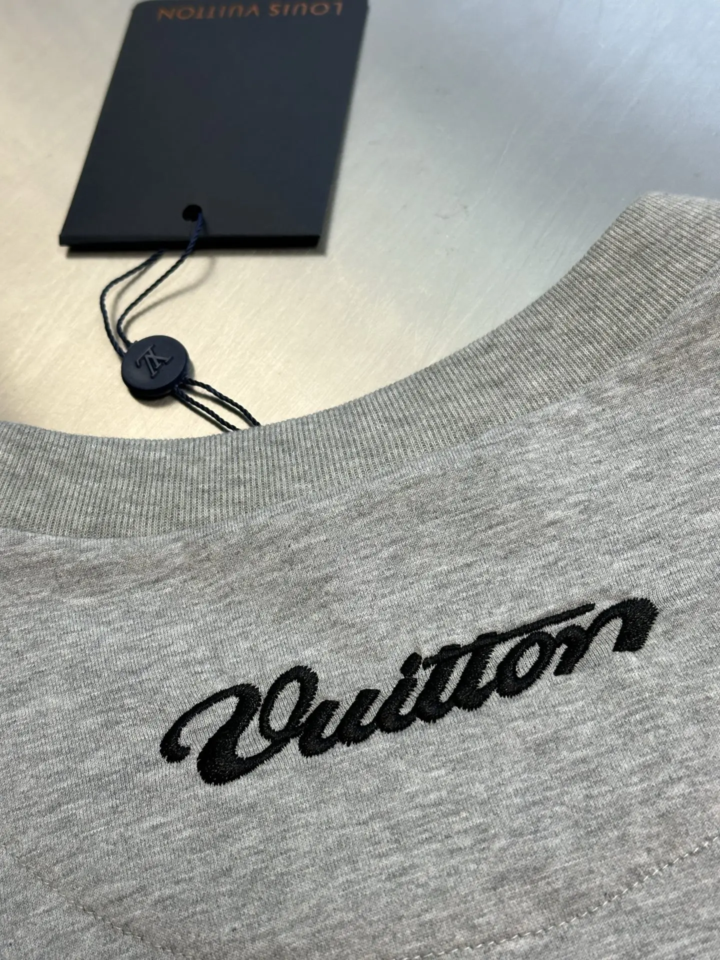 这件短袖灰色针织衫 巧妙融合了印花与刺绣的LV滑雪臂章 庆祝旅行的艺术 色彩斑斓且图案丰富的设计灵感来自滑雪学校徽章 细节丰富 带有学院的签名 这件休闲单品为冬日度假造型增添了精致的点缀