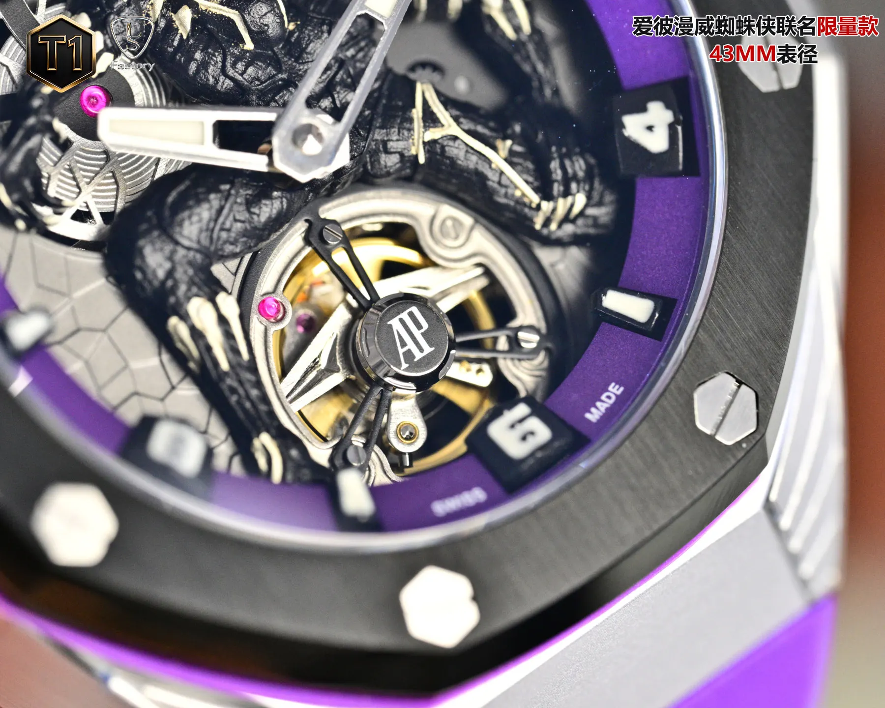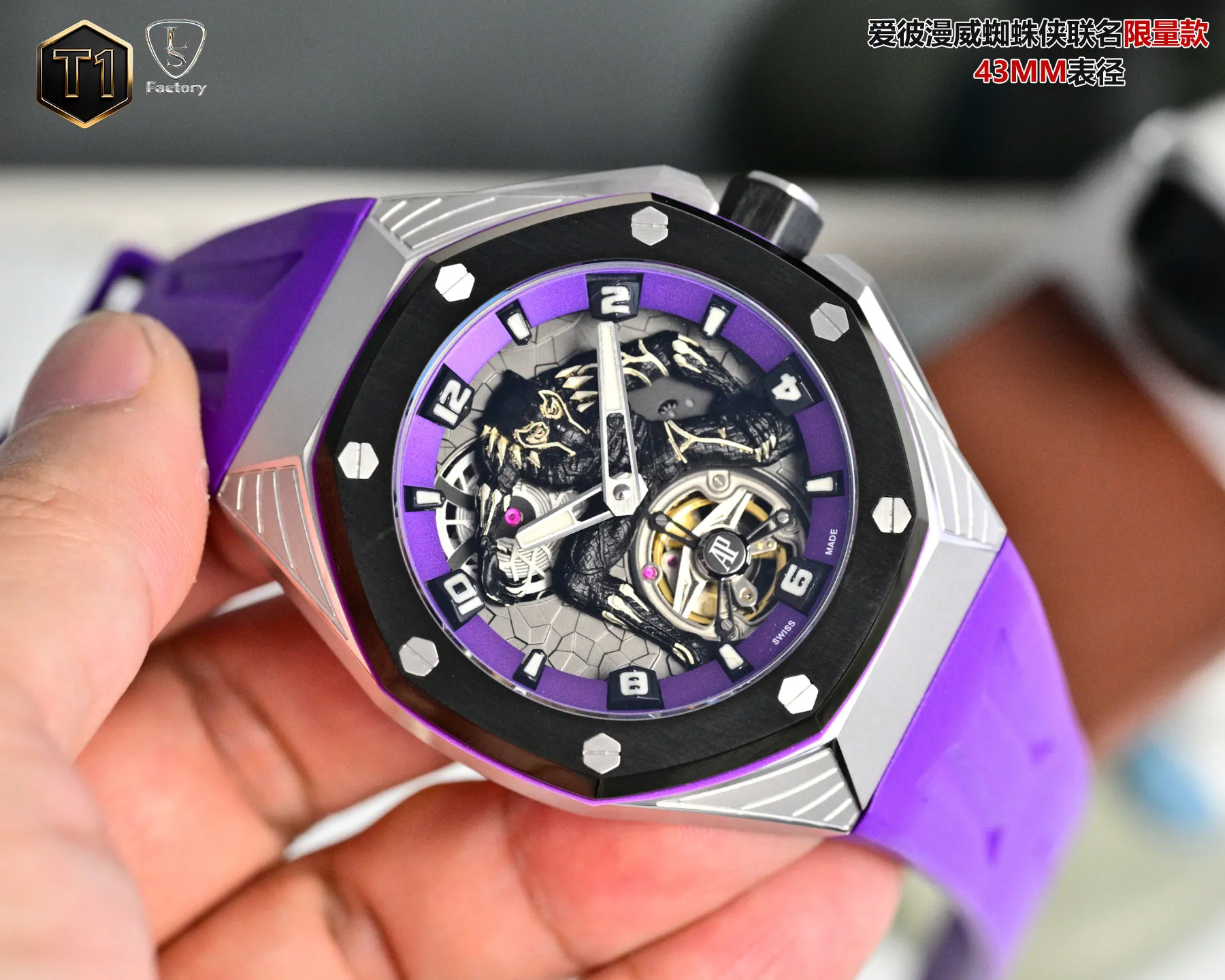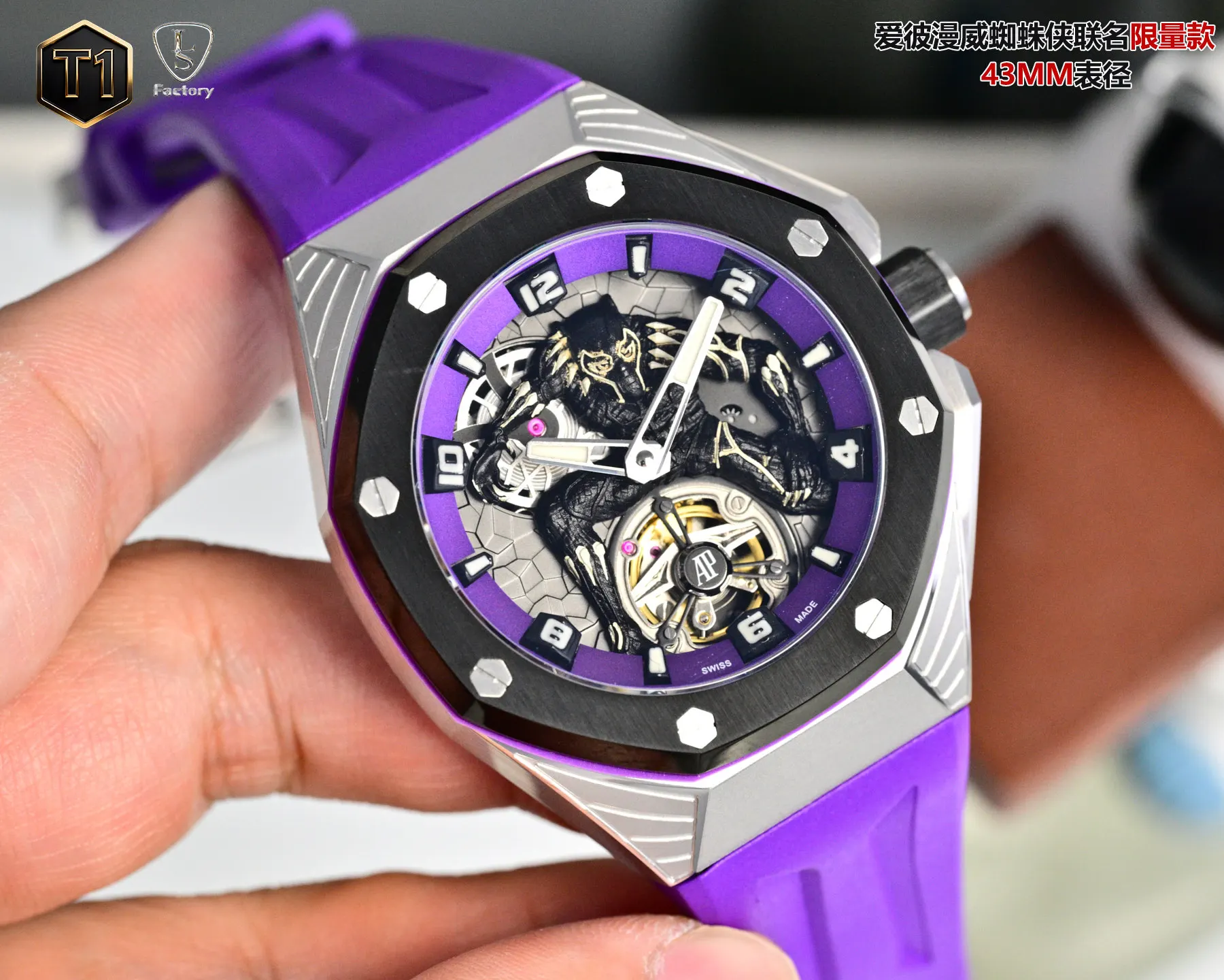 LS .Factory 爱彼 Audemars Piguet 漫威黑豹联名限量款 皇家橡树概念系列26620lO.OO.D077CA.011 新开模43 毫米表壳 采用全新设计 更符合人体工学的表壳 更精致的表壳细节 它具有较大的抛光倒角 尺寸 43MM 14MM 43毫米宽的表壳经过精心修饰 以容纳直径稍大的新机芯2 机芯采用进口订制手动陀飞轮机芯 更佳美观 质量更稳定 3 表壳采用日本 316 精钢打造 显示出钢壳更佳鲜亮 非市场用普通 306 钢 4 镜面采用进口蓝宝石玻璃镜面5 表带采用帆布带包皮 配带起来更加舒服 手感更好 非皮革压制而出 扣子采用折叠蝴蝶扣 6 现在下单送随身携带订制方便盒子一个 先到先得 送完为止