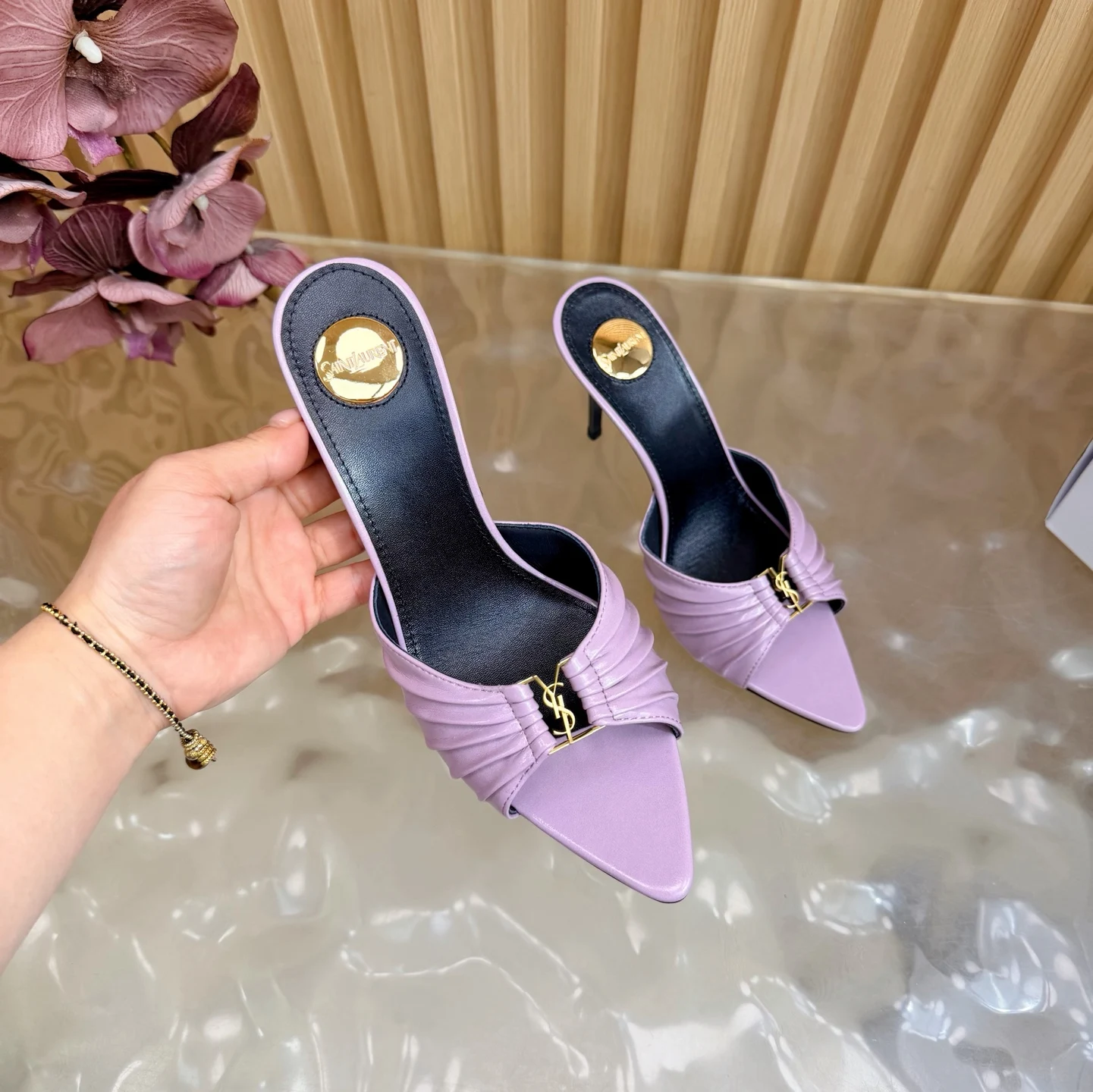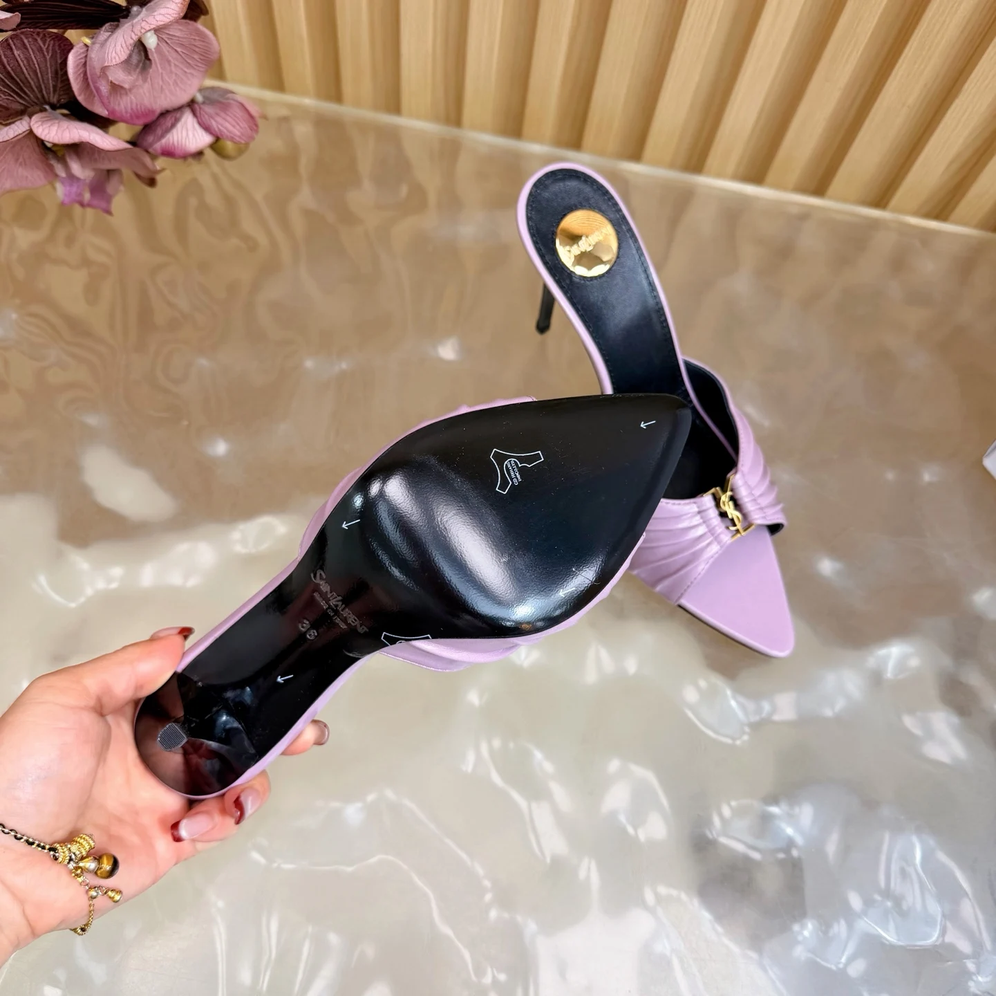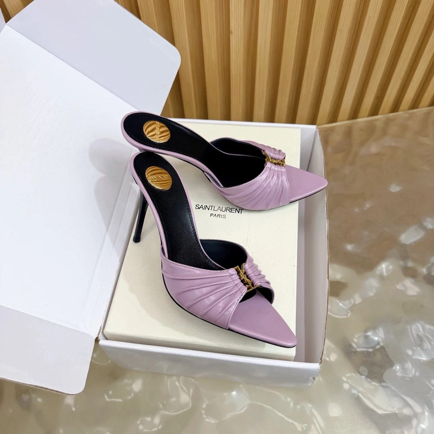YSL 顶级品质 配高档飞机盒 26s 春夏新款尖头链条五金扣穆勒鞋极简风细跟高跟凉拖鞋