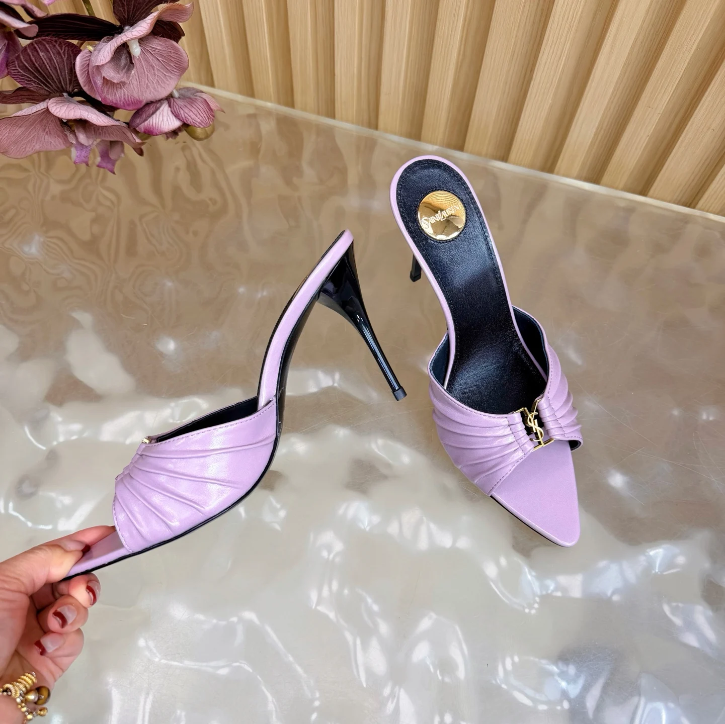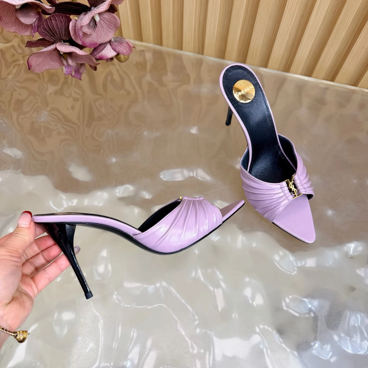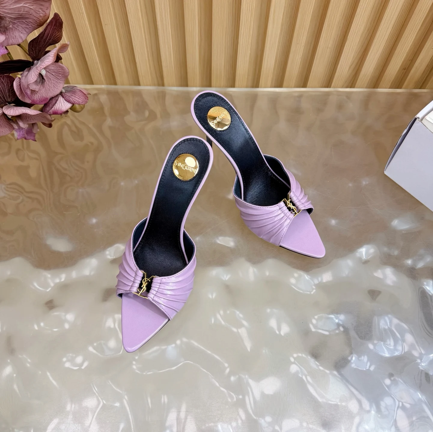 YSL 顶级品质 配高档飞机盒 26s 春夏新款尖头链条五金扣穆勒鞋极简风细跟高跟凉拖鞋
