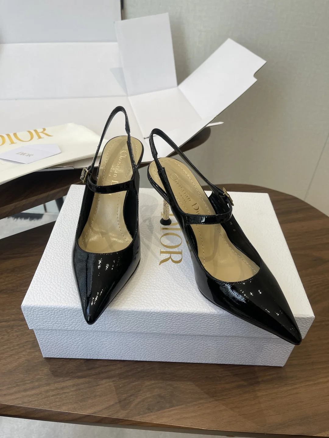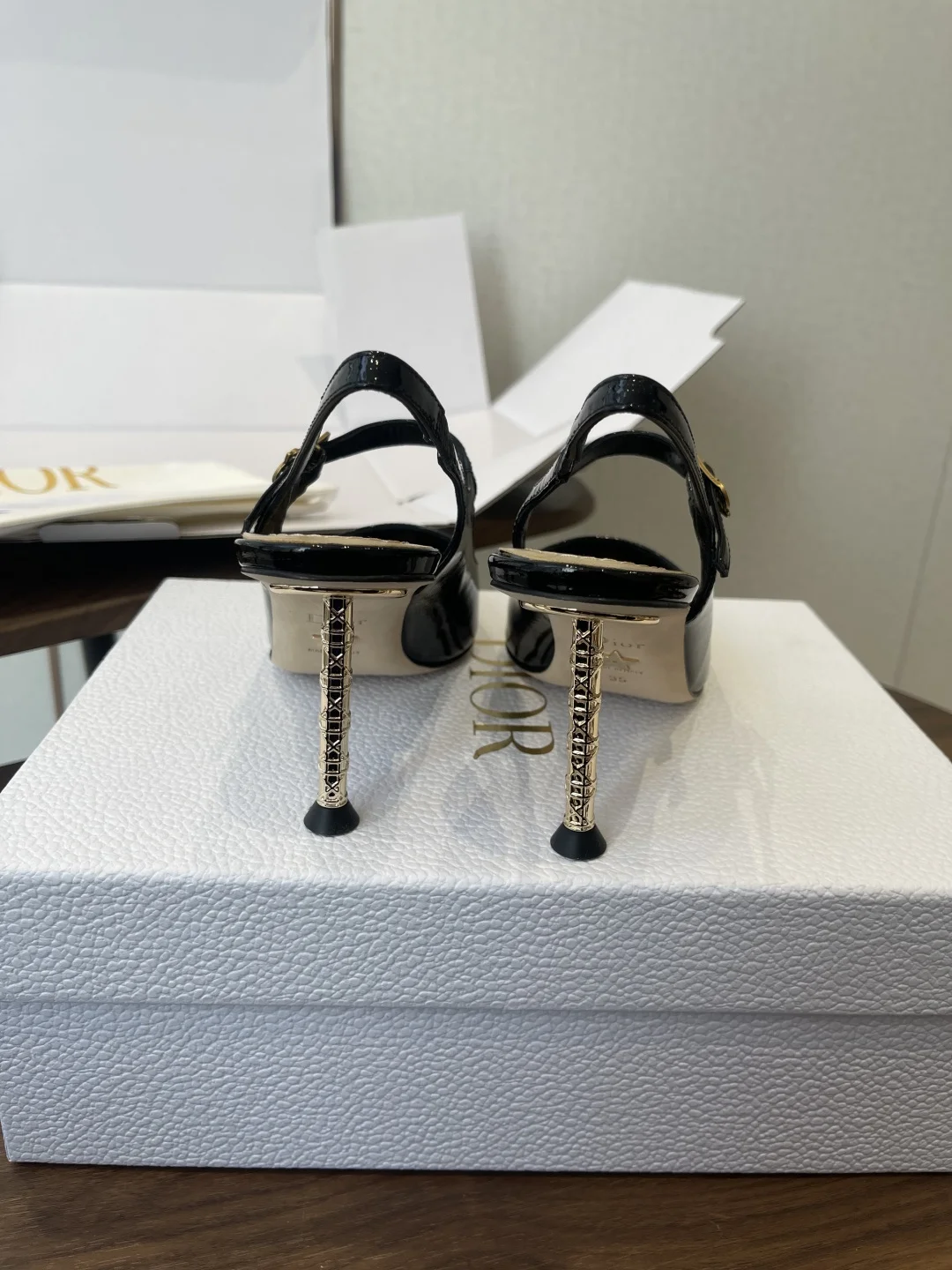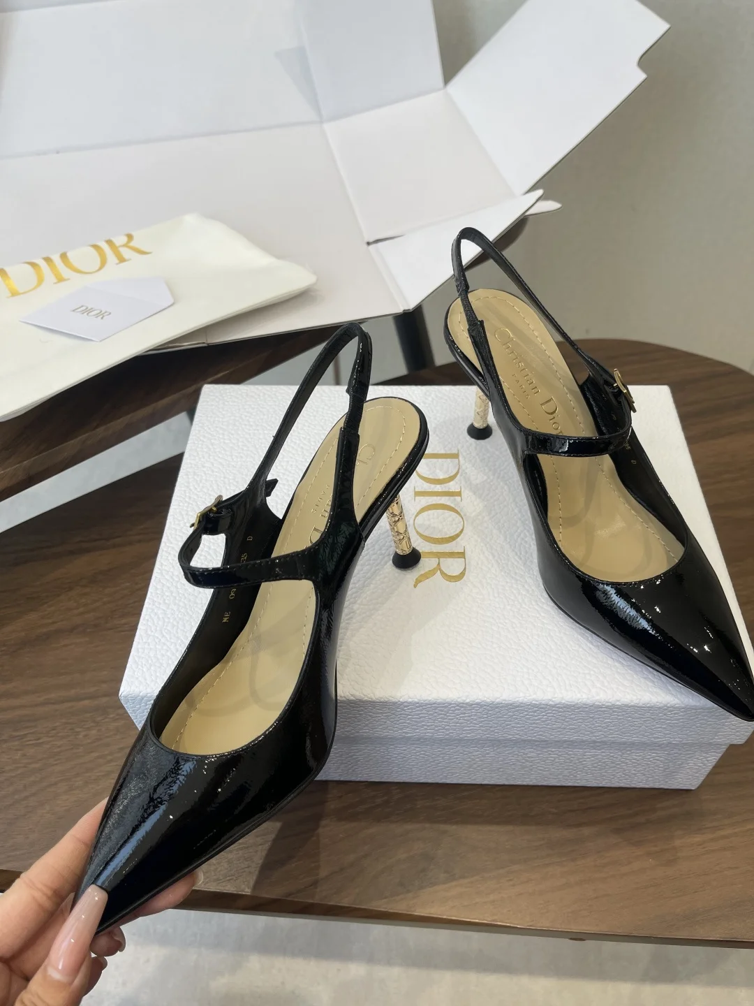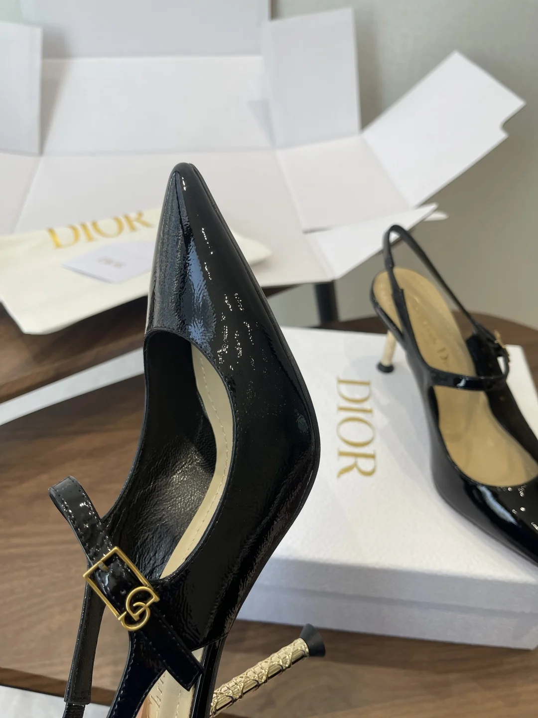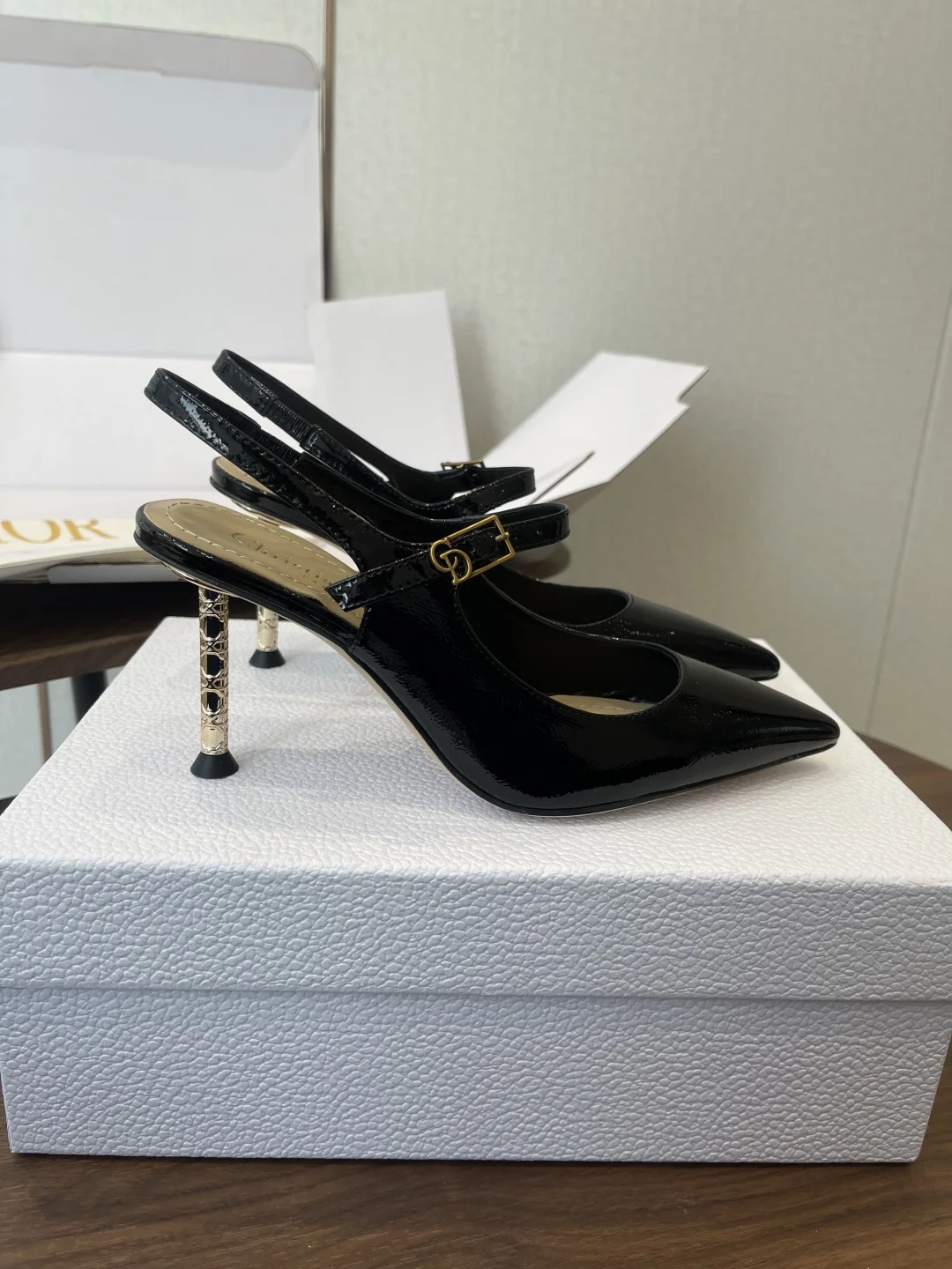 这款Dior Icon露跟高跟鞋向Dior的高订精神致敬 黑色褶皱漆皮牛皮革鞋面搭配尖头 可调节正面系带点缀以灵感源自Dior档案的相扣的CD标志 搭配8厘米金色饰面金属藤格纹图案圆柱形细鞋跟 增添高雅的点睛之笔 彰显精致的美学风格