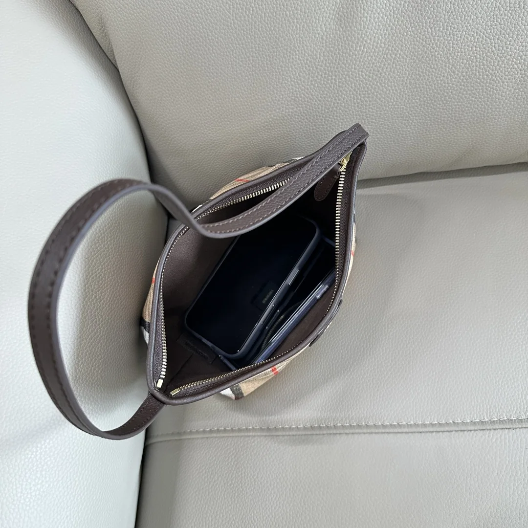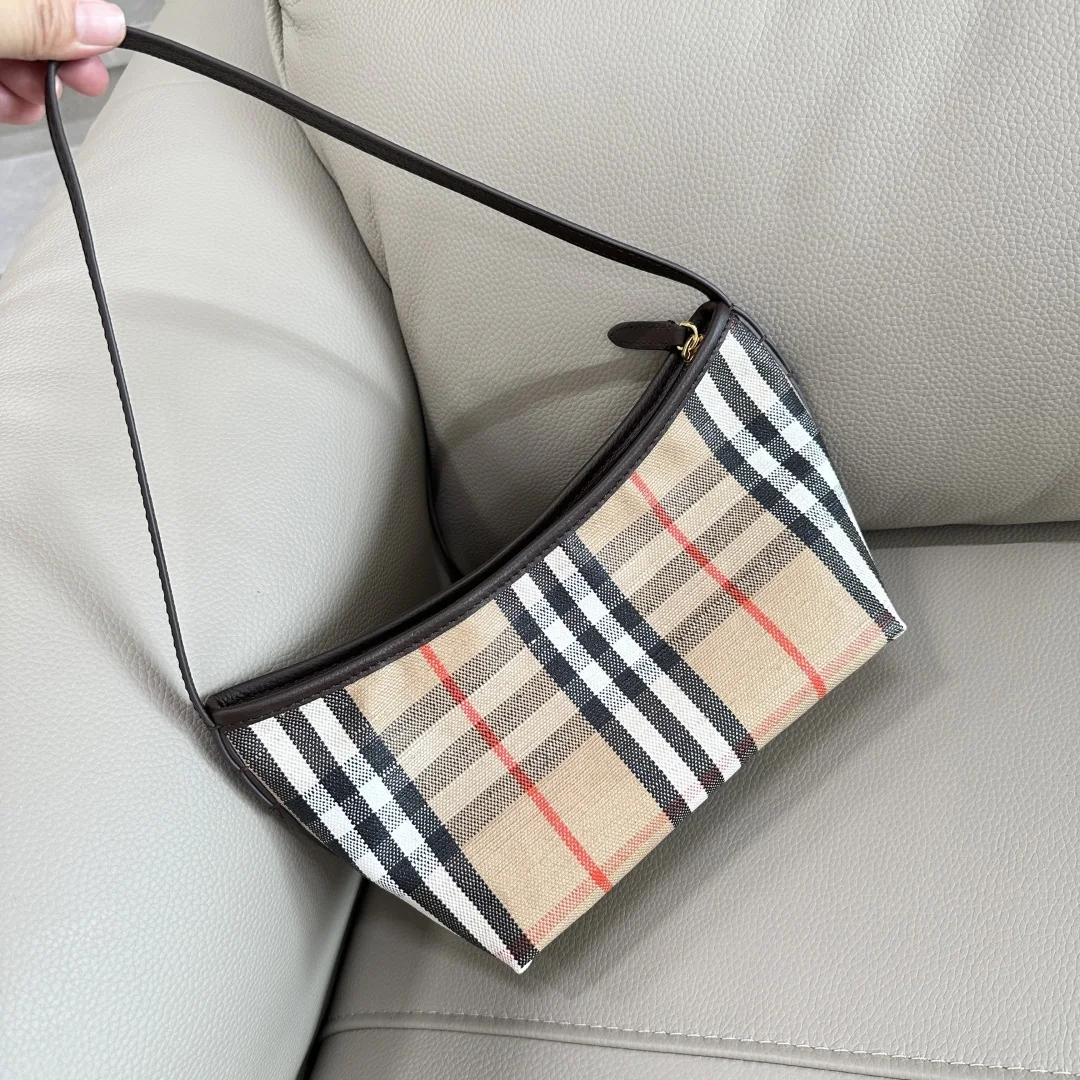 原厂 B家新款肩背包 汲取户外设计理念打造 选用棉质亚麻混纺面料 于意大利工坊精制而成 融入光滑小牛皮装饰和纯色内衬 装饰提花精纺的 Burberry 格纹 设有风衣灵感涂层饰面 轻盈款式搭配纤细肩背带 点缀骑士印章 源自 1980年代品牌包款的典藏图案