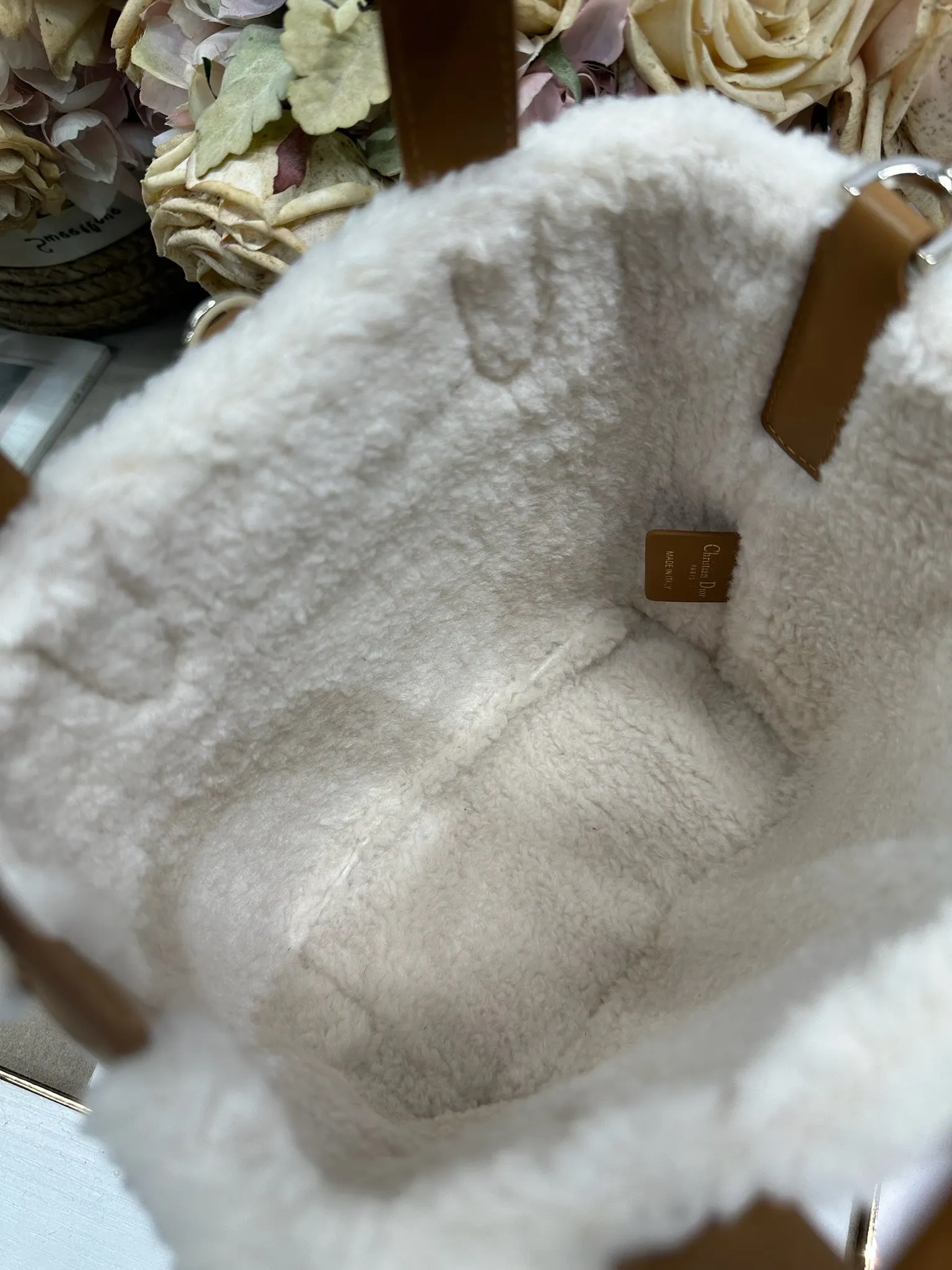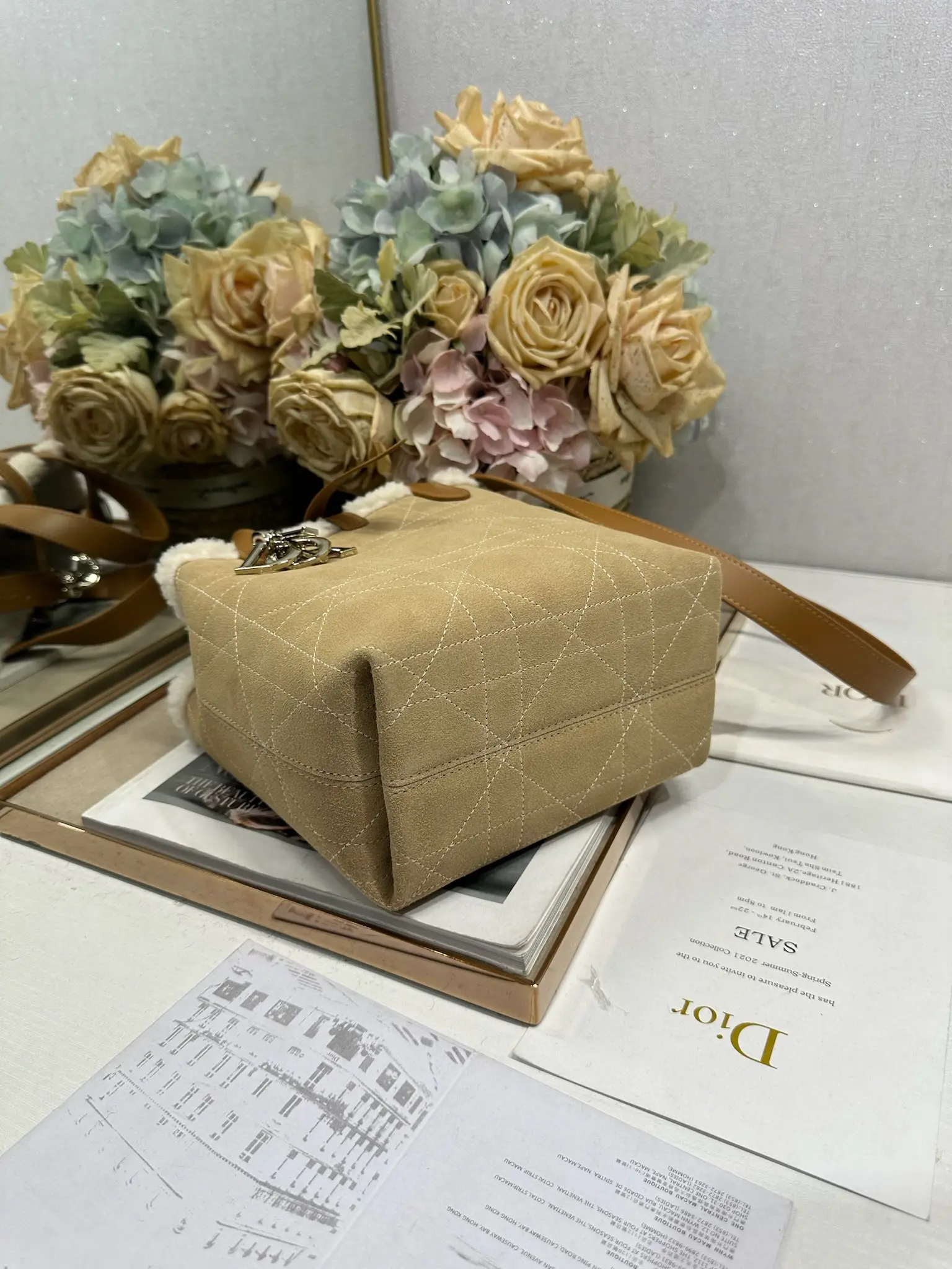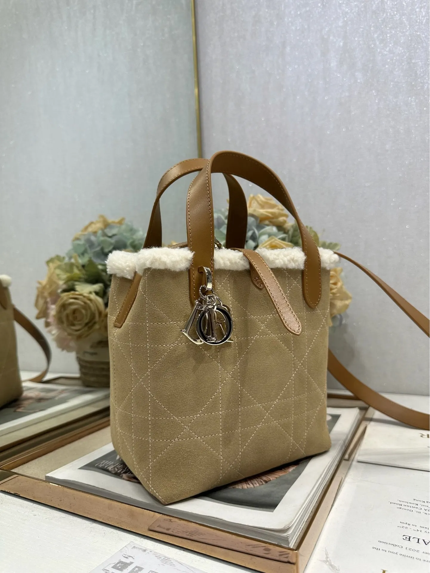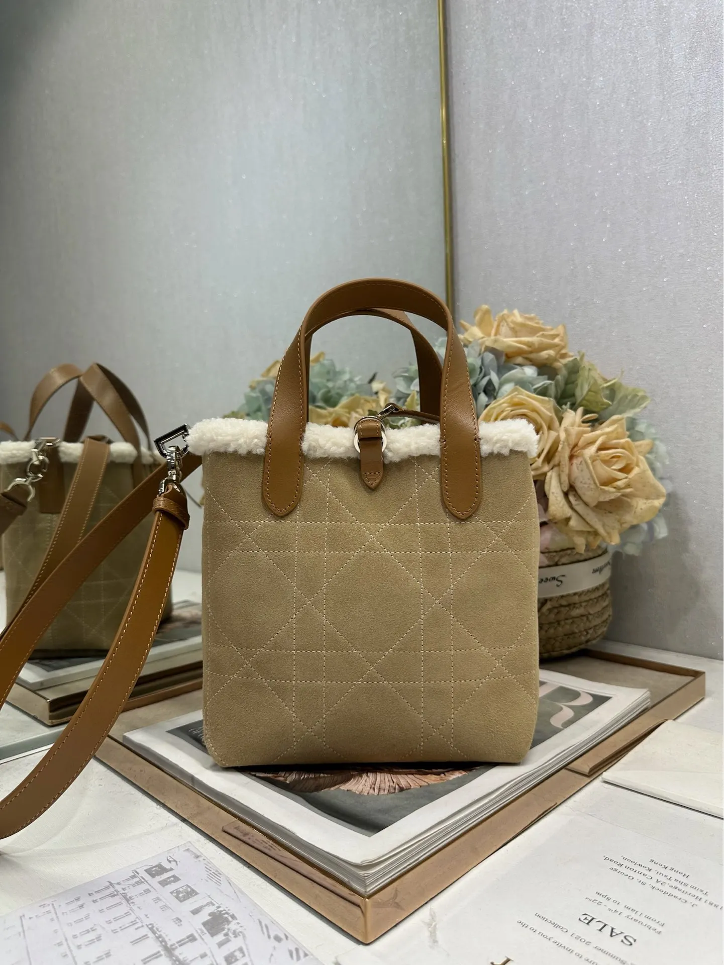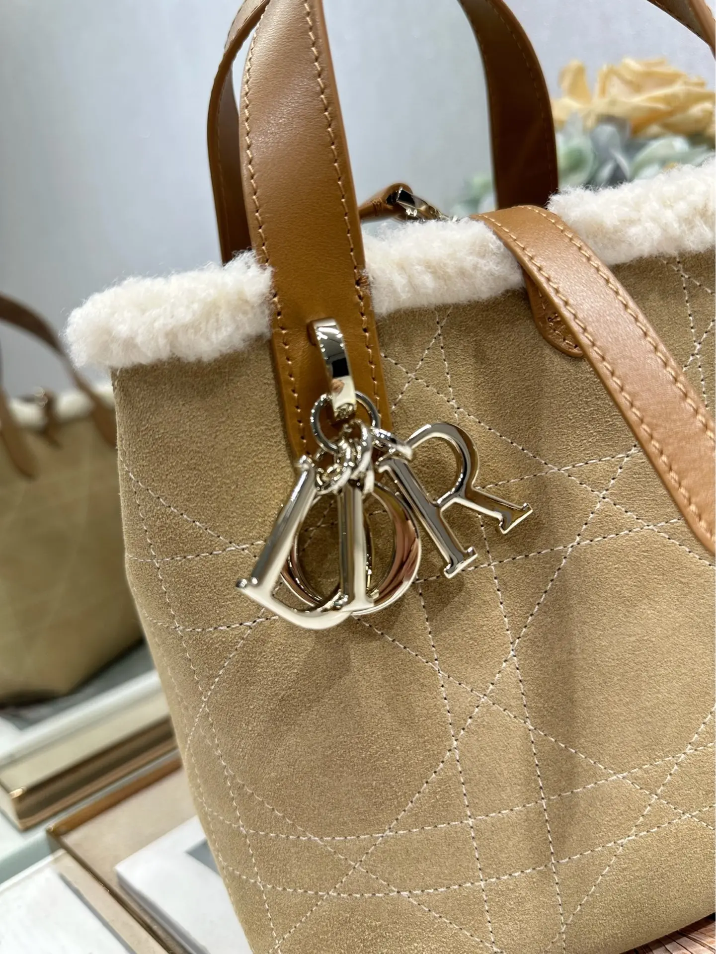 小号 DiorAlps Dior Toujours 竖版手袋 杏绒拼皮 这款 Dior Toujours 竖版手袋来自 DiorAlps 限定系列 时尚实用 别具一格 采用米色做旧效果绒面牛皮革精心制作 饰以超大藤格纹缉面线 搭配米白色羊毛 彰显 Dior 非凡的精湛工艺 可调节两侧 彰显廓形 型号 2836
