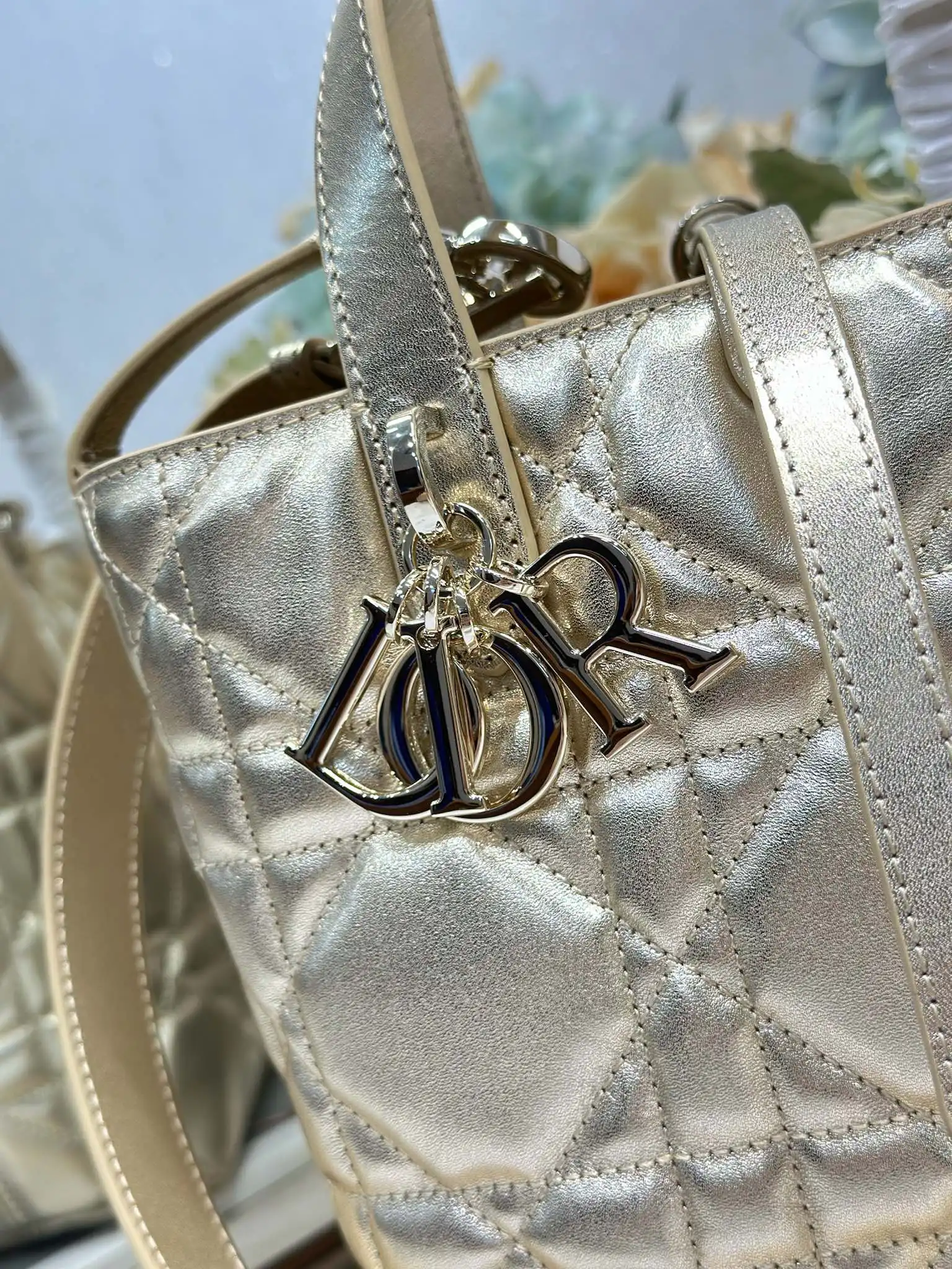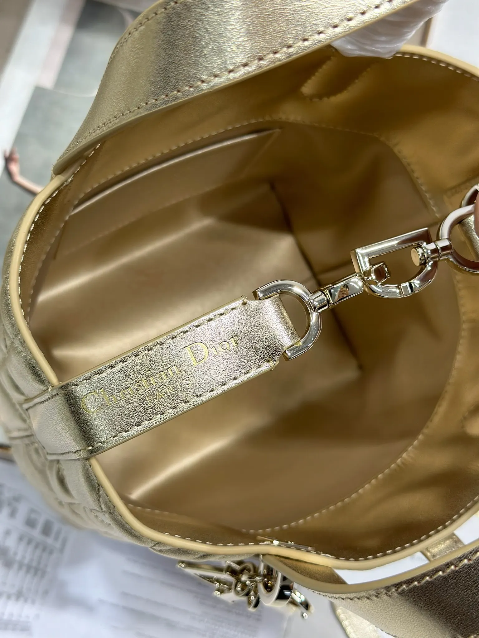 Dior Toujours 竖版手袋 金色 这款 Dior Toujours 竖版手袋时尚实用 别具一格 采用金色牛皮革精心制作 饰以超大藤格纹缉面线 宽敞的内部隔层可收纳各种日常用品 设有纤细皮革系带开合 可安全收纳各种物品 另有 CD Lock 字母 D 旋钮式扣环 可调节两侧 提升格调 小号款式 顶部皮革手柄搭配可拆卸的皮革肩带 可手提 肩背或斜挎 型号 2836