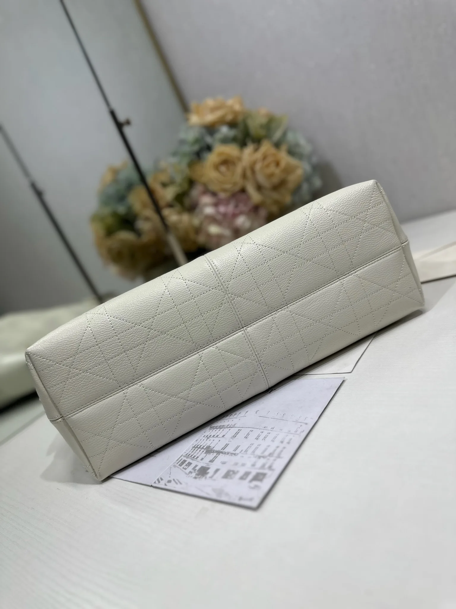 这款 Dior Voyage 手袋是二零二六早春成衣系列新品 采用白色荔面牛皮革精心制作 饰以扁平超大藤格纹缉面线 焕新演绎 Dior 的经典图案 大号款式 顶部手柄搭配可调节搭扣 可肩背 是日常造型的理想良伴 型号 2844