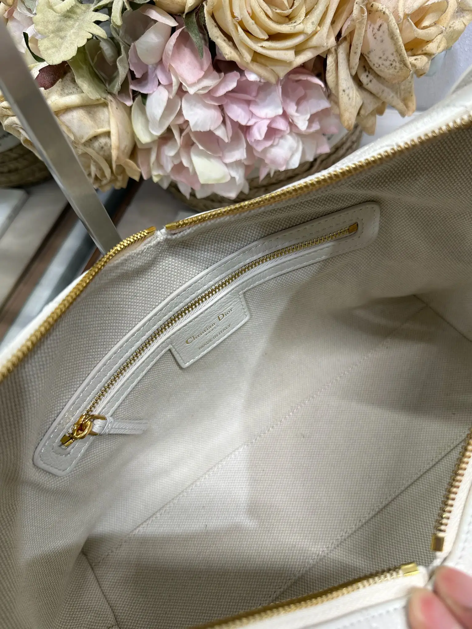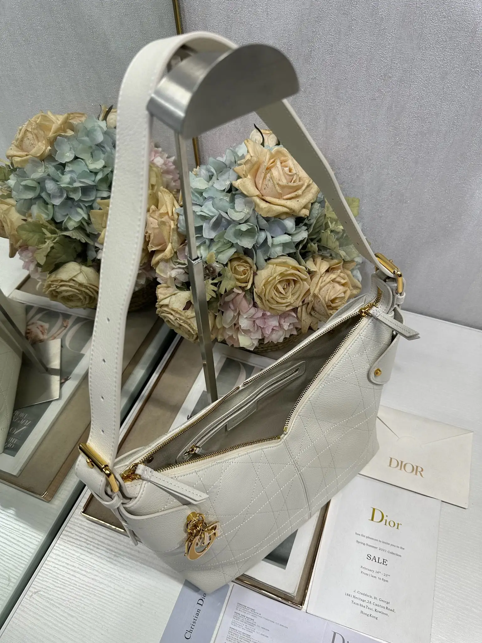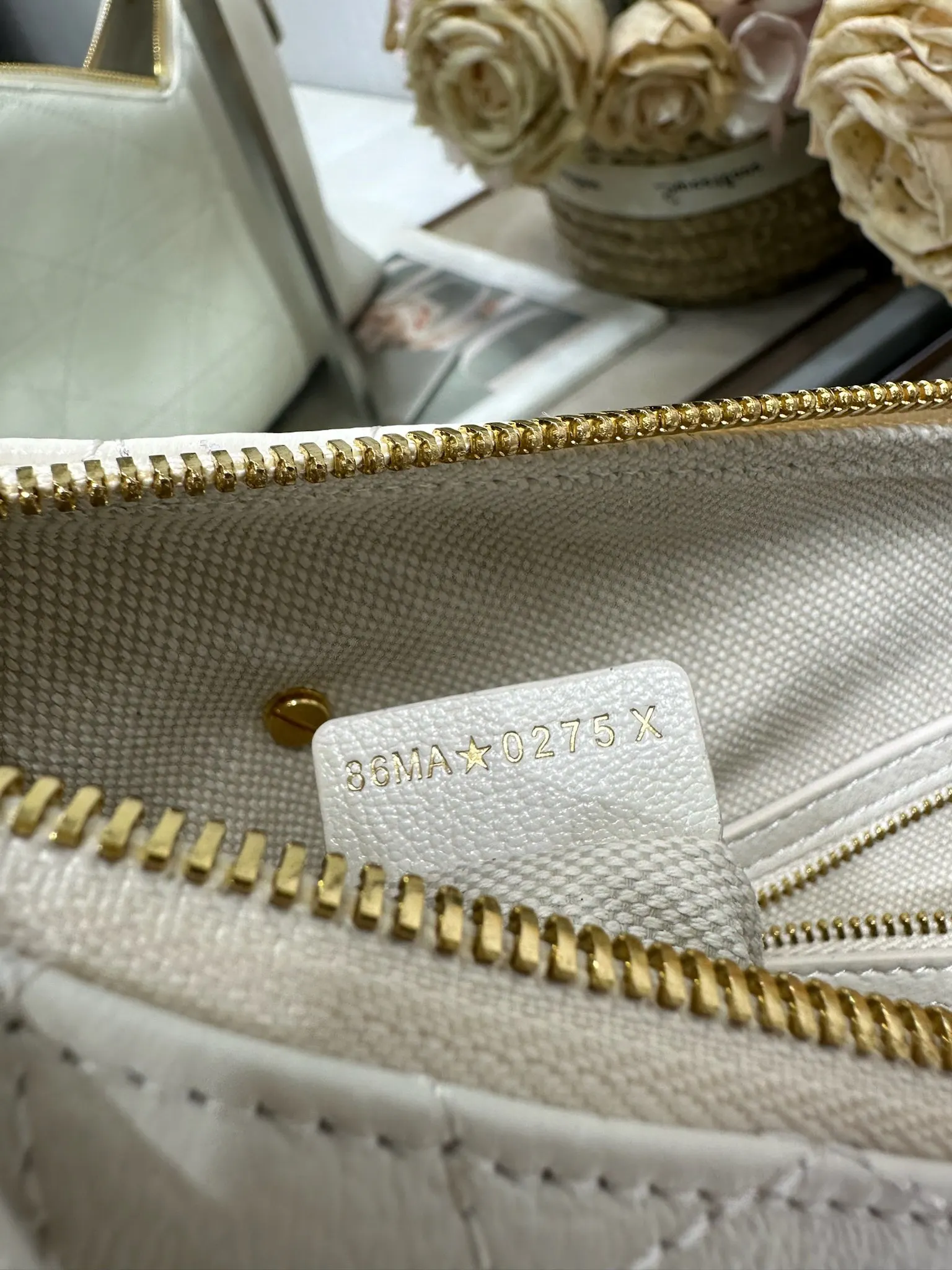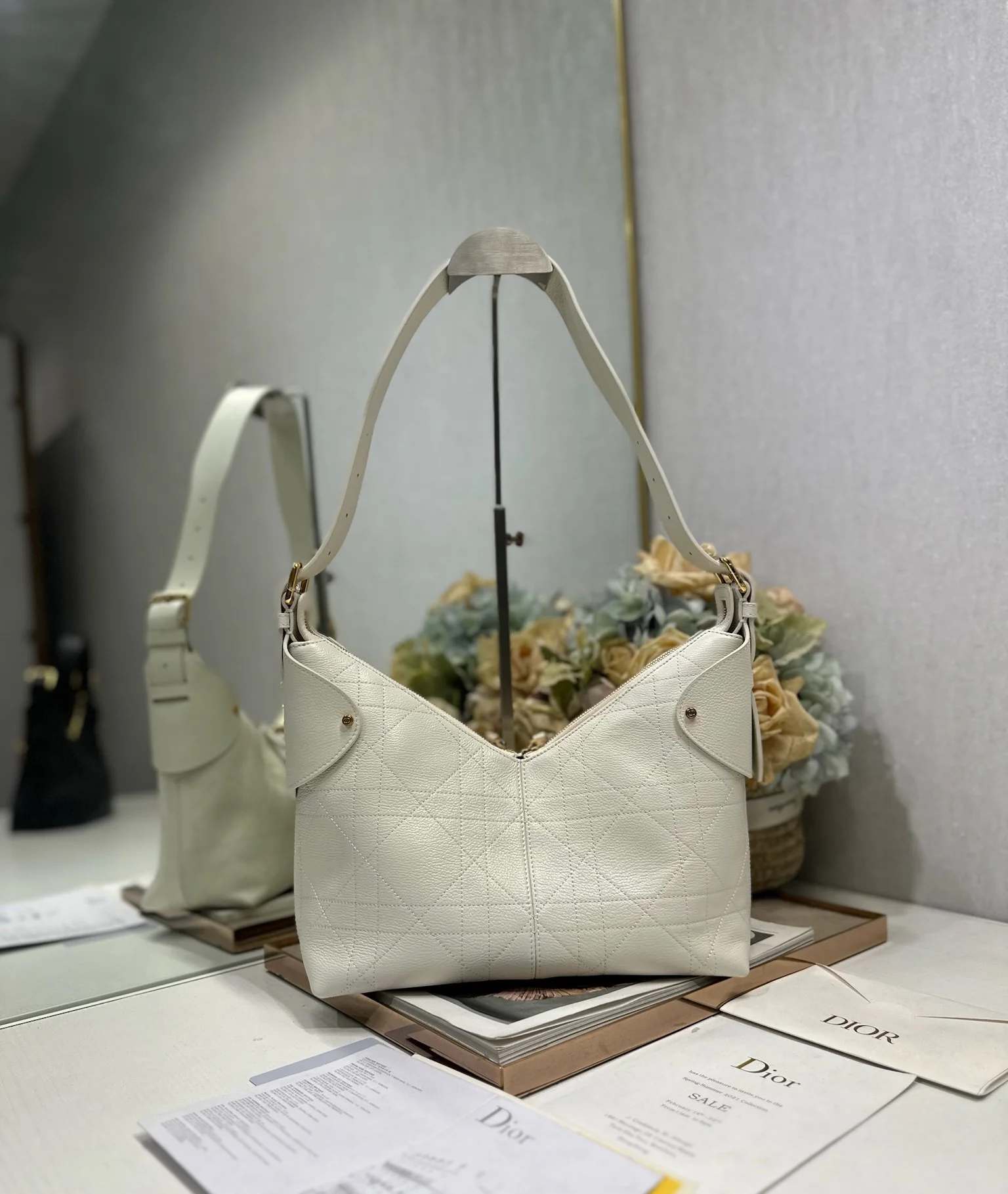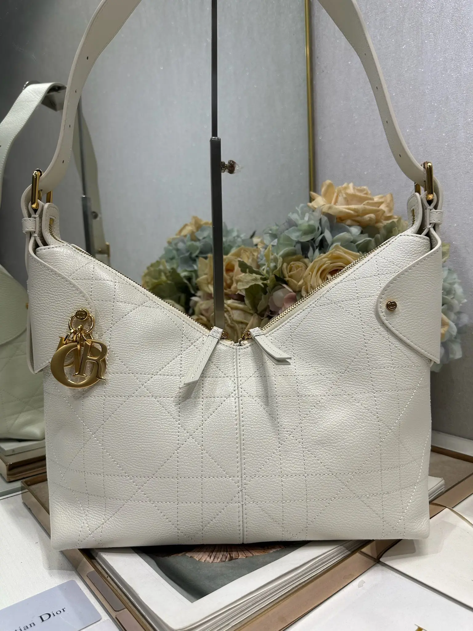 中号 Dior Voyage 手袋 山羊纹白色 采用白色荔面牛皮革精心制作 饰以扁平超大藤格纹缉面线 焕新演绎 Dior 的经典图案 中号款式 顶部手柄搭配可调节搭扣 可肩背 是日常造型的理想良伴 型号 2845