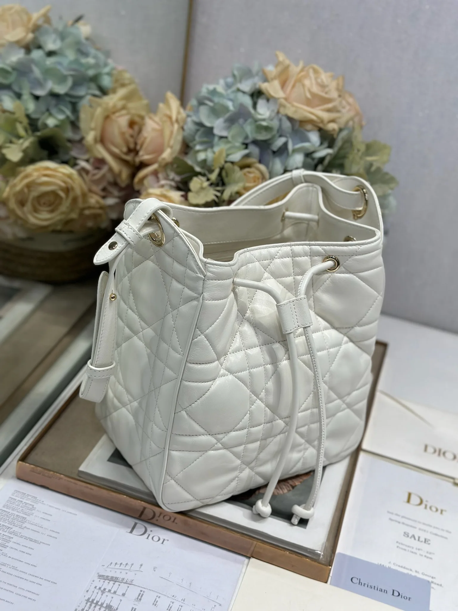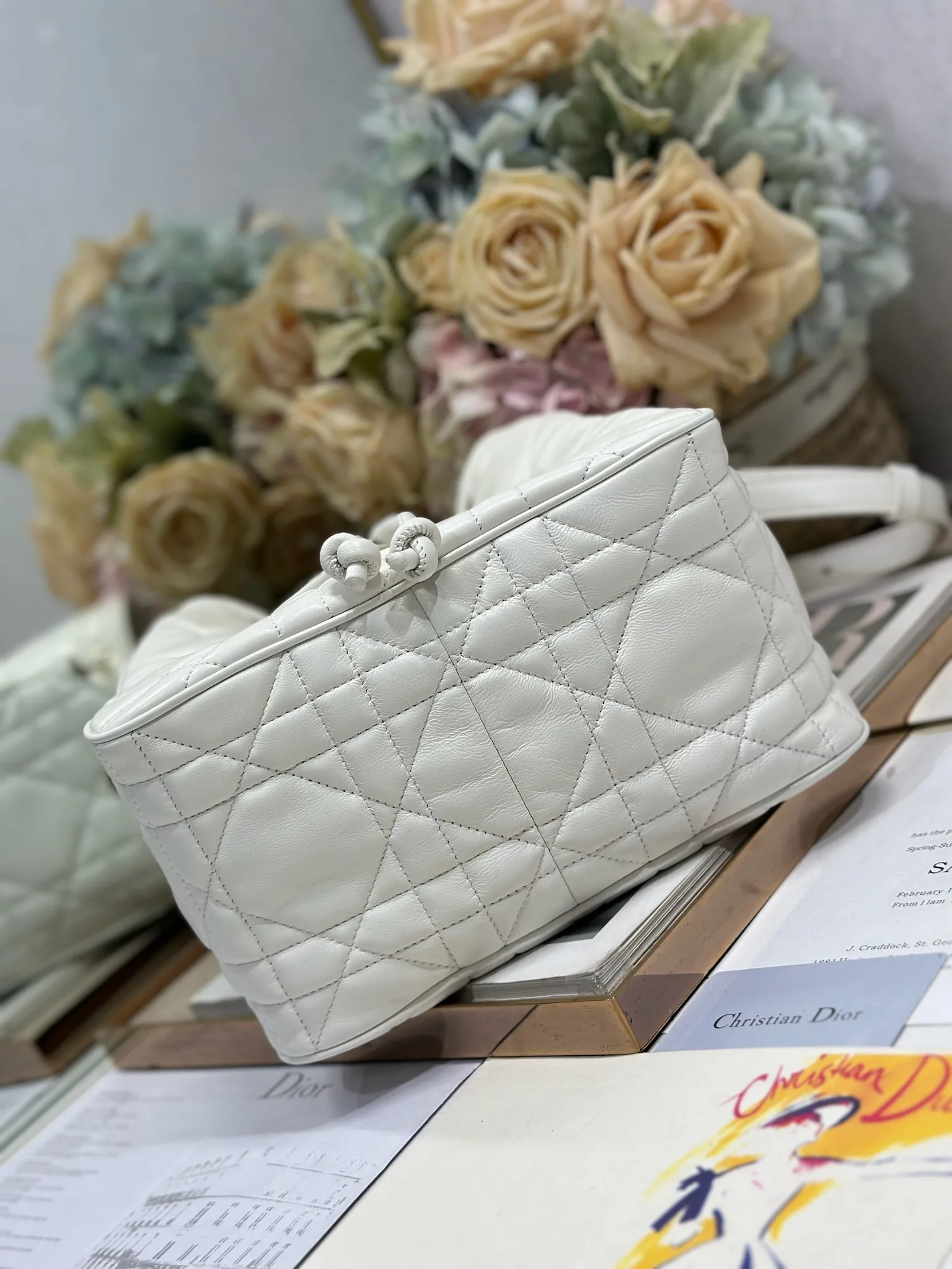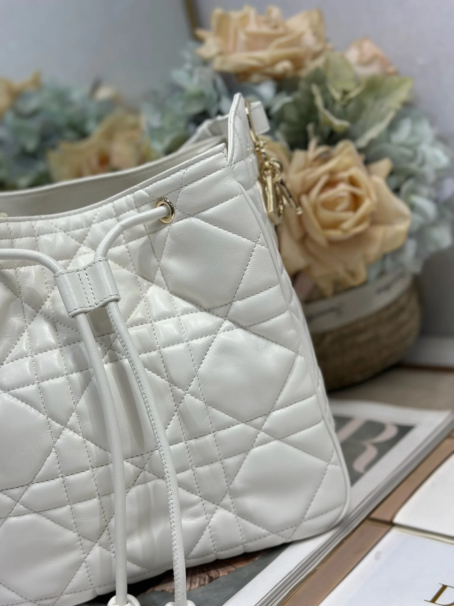 中号 D-Motion 手袋 白色 带可扫描高版本163变码芯片 这款 D-Motion 手袋冬季成衣系列新品 时尚实用的桶式设计 别具一格 采用白色羊皮革等材质精心制作 饰以藤格纹缉面线 柔软的版型搭配抽绳开合 带有宽敞的内部隔层 拉链口袋及两个侧面插袋 可收纳各种日常用品 中号款式 饰以浅金色饰面金属 D.I.O.R. 吊饰更显精致 搭配滑动设计的可调节肩带 可肩背或斜挎 型号 2852