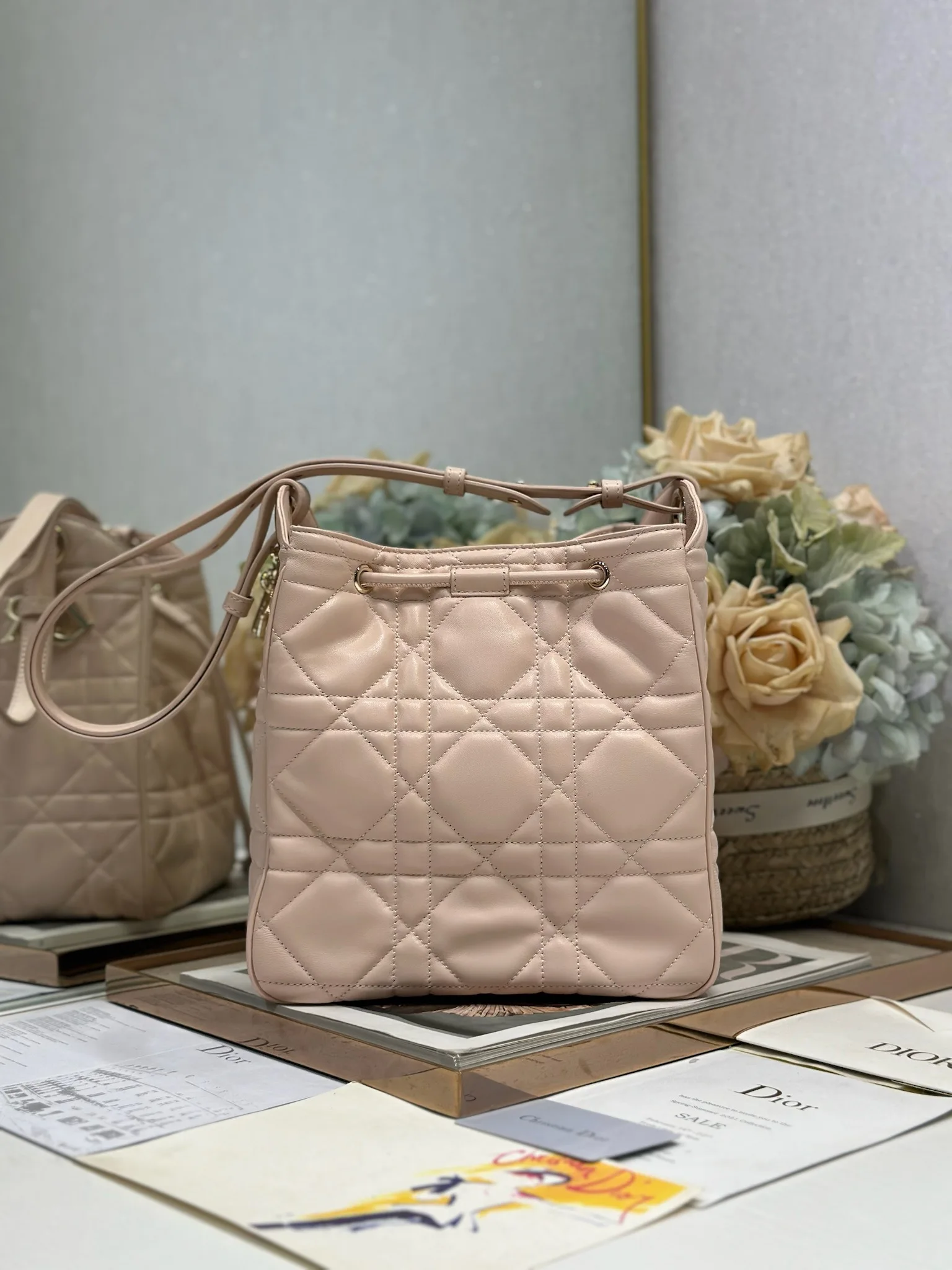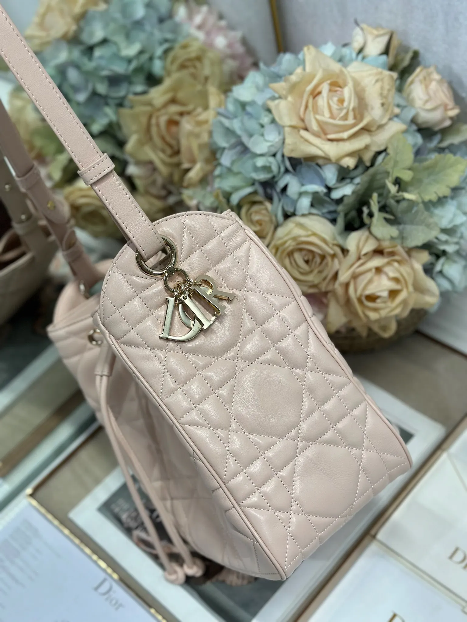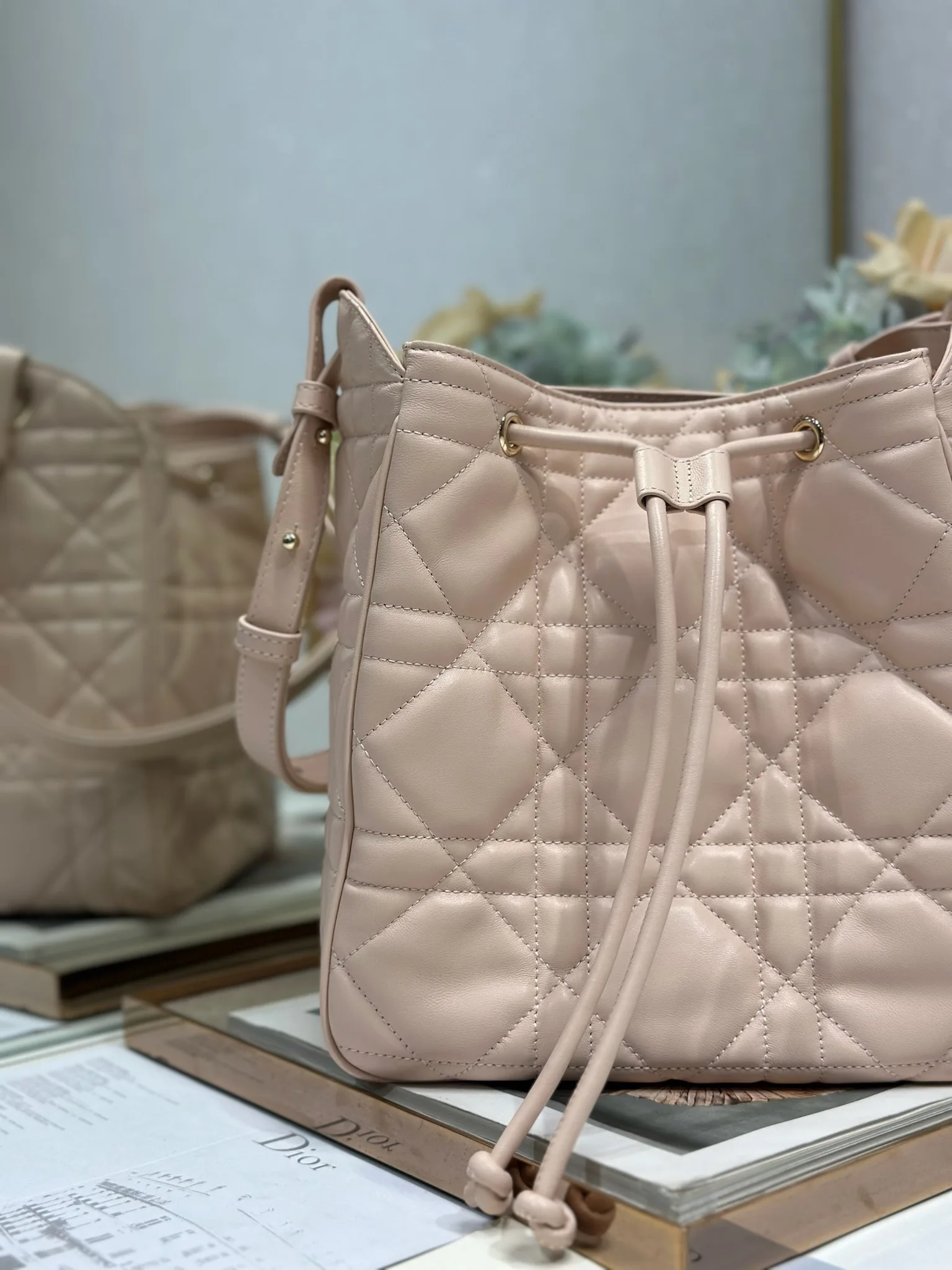 中号 D-Motion 手袋 粉色 带可扫描高版本163变码芯片 这款 D-Motion 手袋冬季成衣系列新品 时尚实用的桶式设计 别具一格 采用粉色羊皮革等材质精心制作 饰以藤格纹缉面线 柔软的版型搭配抽绳开合 带有宽敞的内部隔层 拉链口袋及两个侧面插袋 可收纳各种日常用品 中号款式 饰以浅金色饰面金属 D.I.O.R. 吊饰更显精致 搭配滑动设计的可调节肩带 可肩背或斜挎 型号 2852