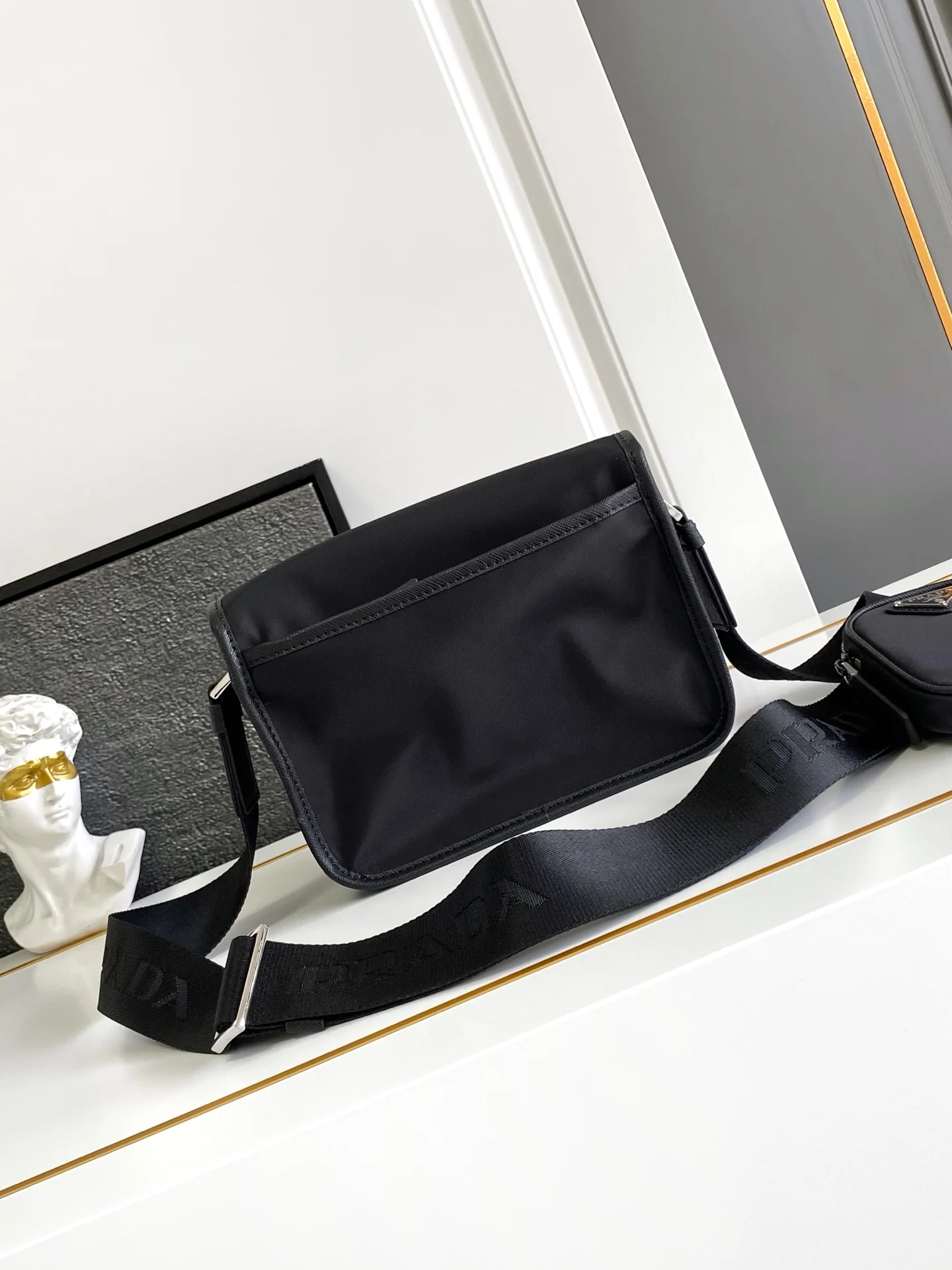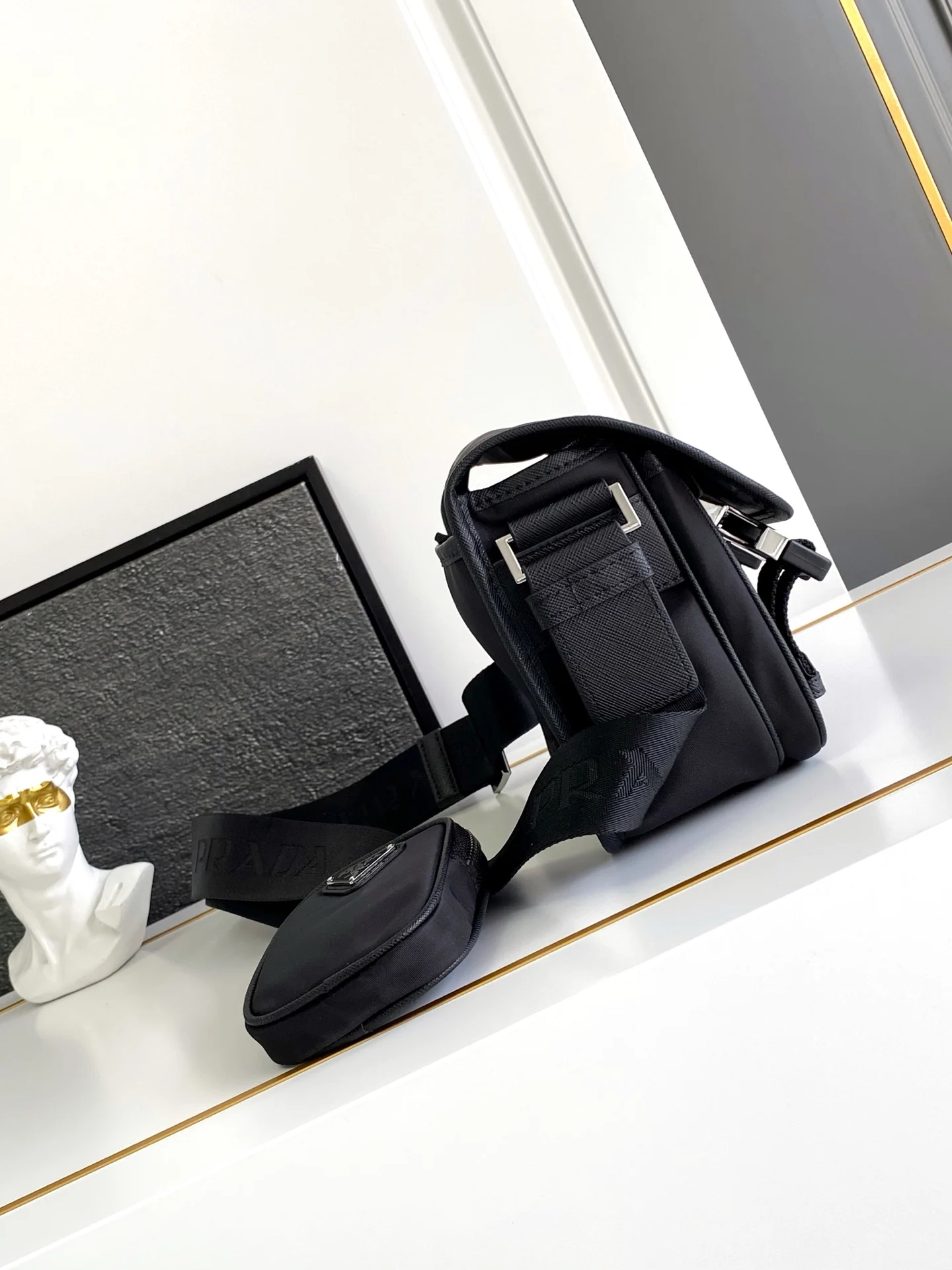 极具代表性的尼龙三角标素 简单的最新三角标装饰 而且不压缩空间 超能装同时肩带还挂着小挂饰小包 也可以把它挂在裤头当饰品呼应整体低调奢华又百搭 通勤包型可休闲可酷背起来又实用又时尚,超级有品味男女共用款