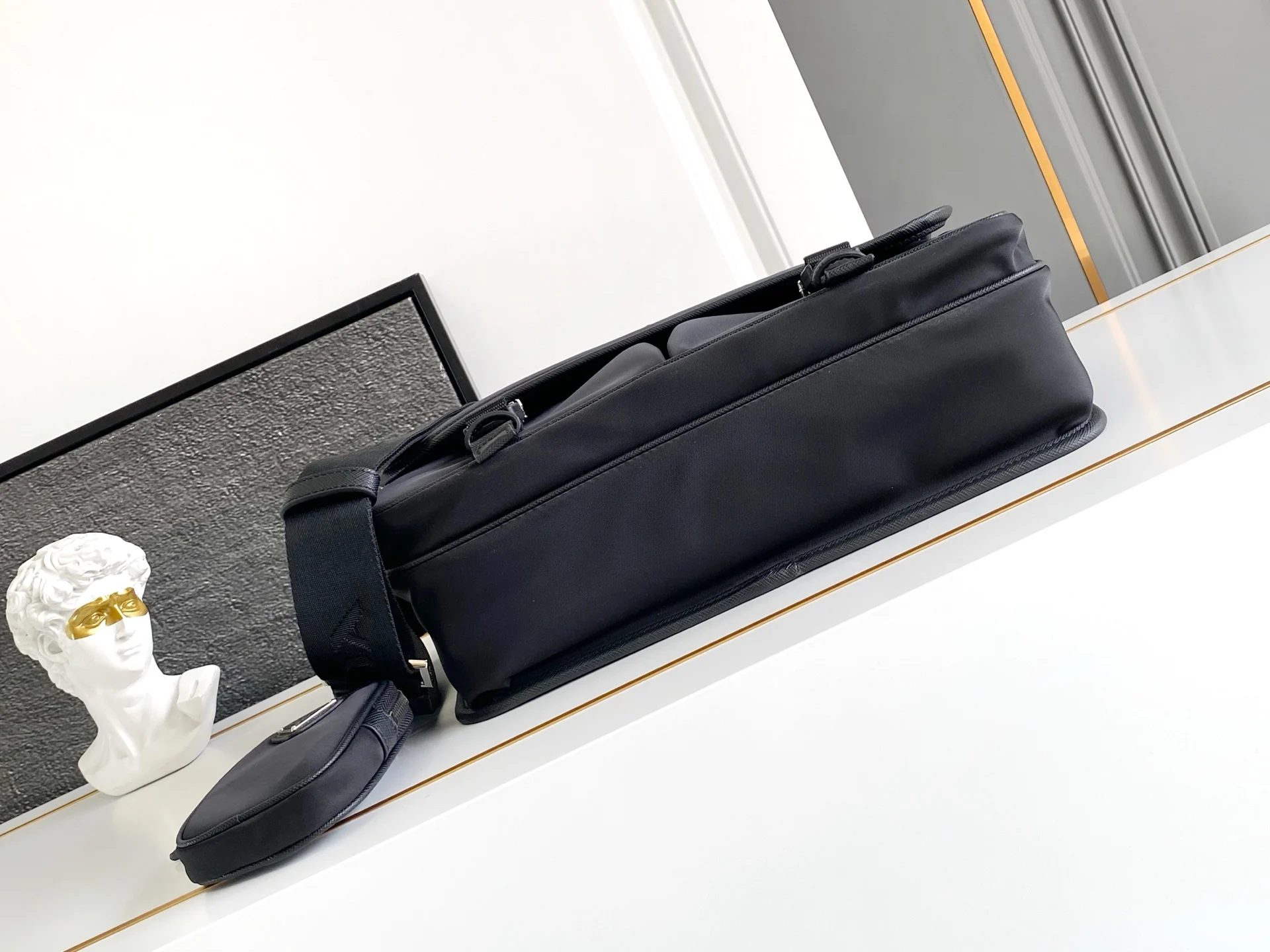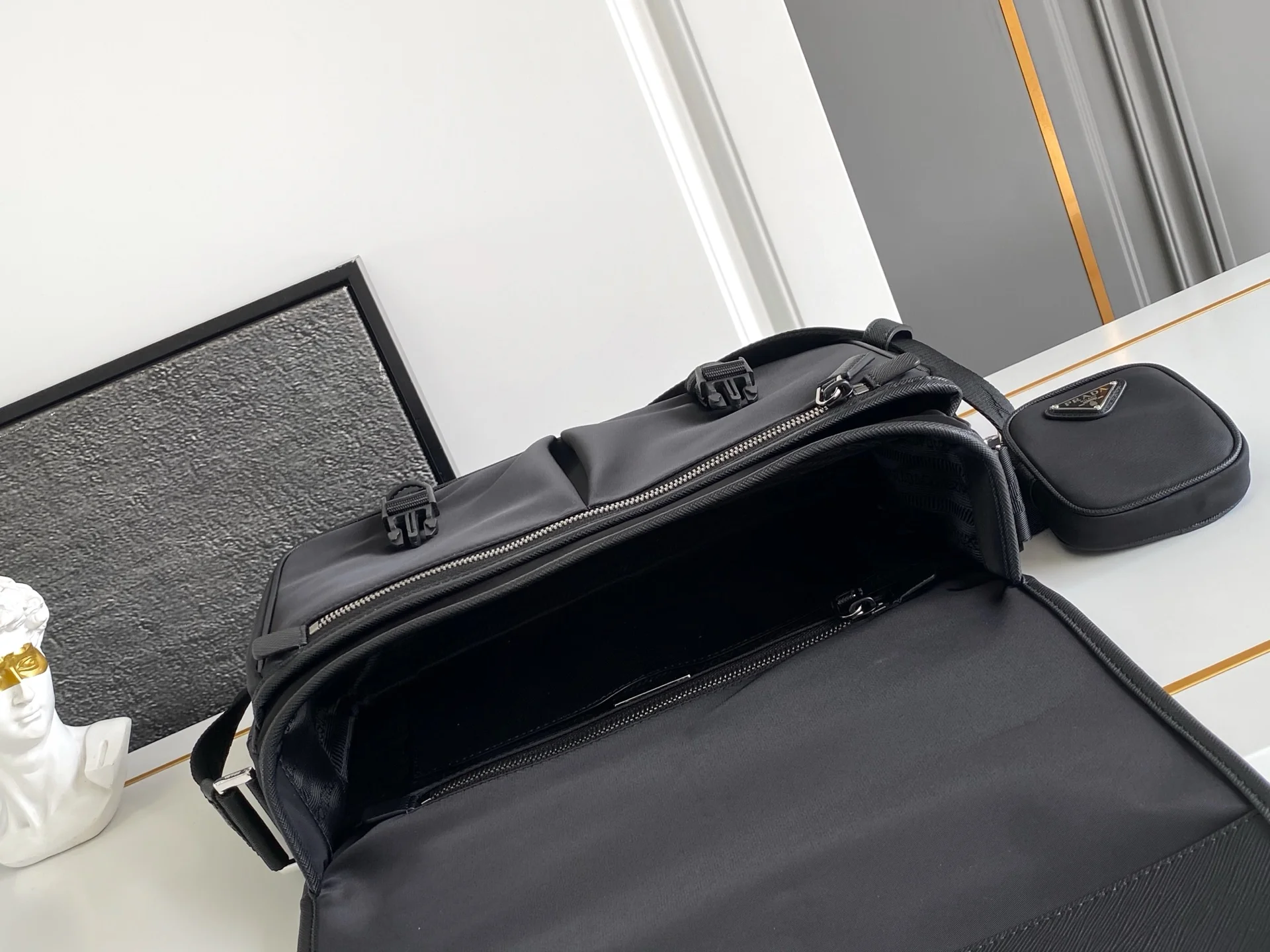 原单货这款尼龙翻盖手袋饰有经典的Saffiano皮革饰边 配有两枚旁开扣 并饰有标志性的三角形金属徽标 彰显时尚设计格调 采用进口尼龙和Saffiano皮革材质 两个正面口袋 其中一个带拉链背面拉链袋 两个内部手机袋 又可调式尼龙徽标提花肩带 经典又时尚的邮差包男土们最爱