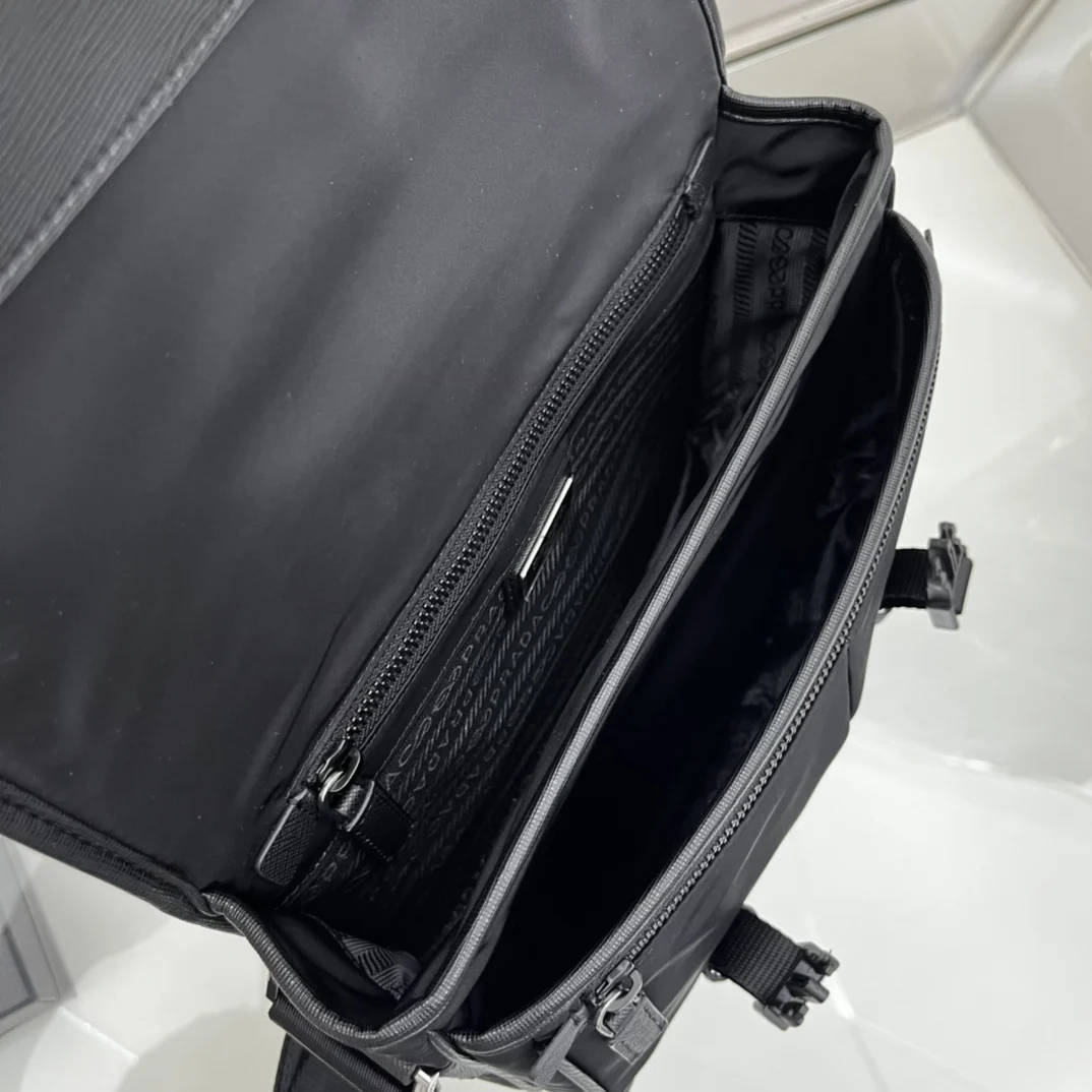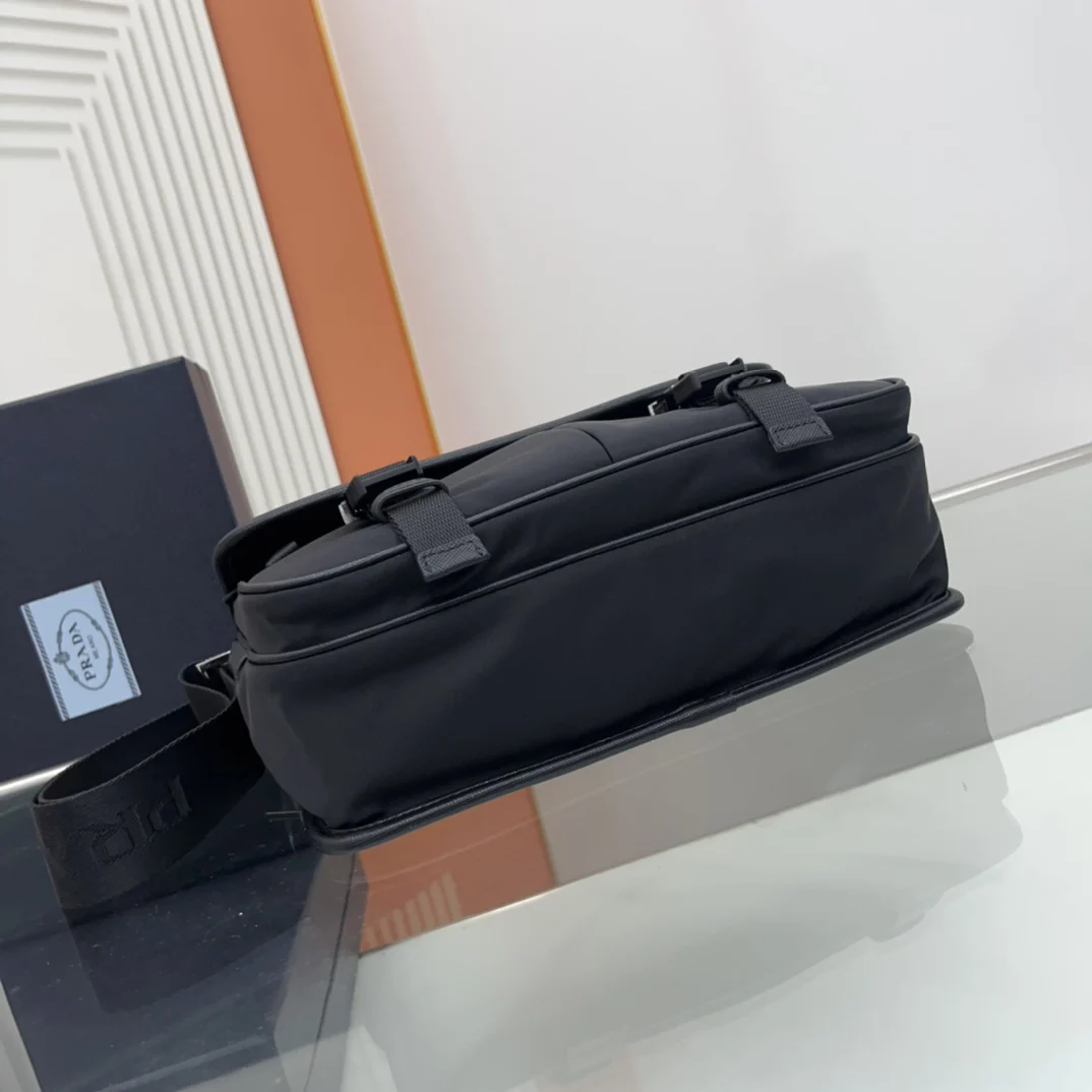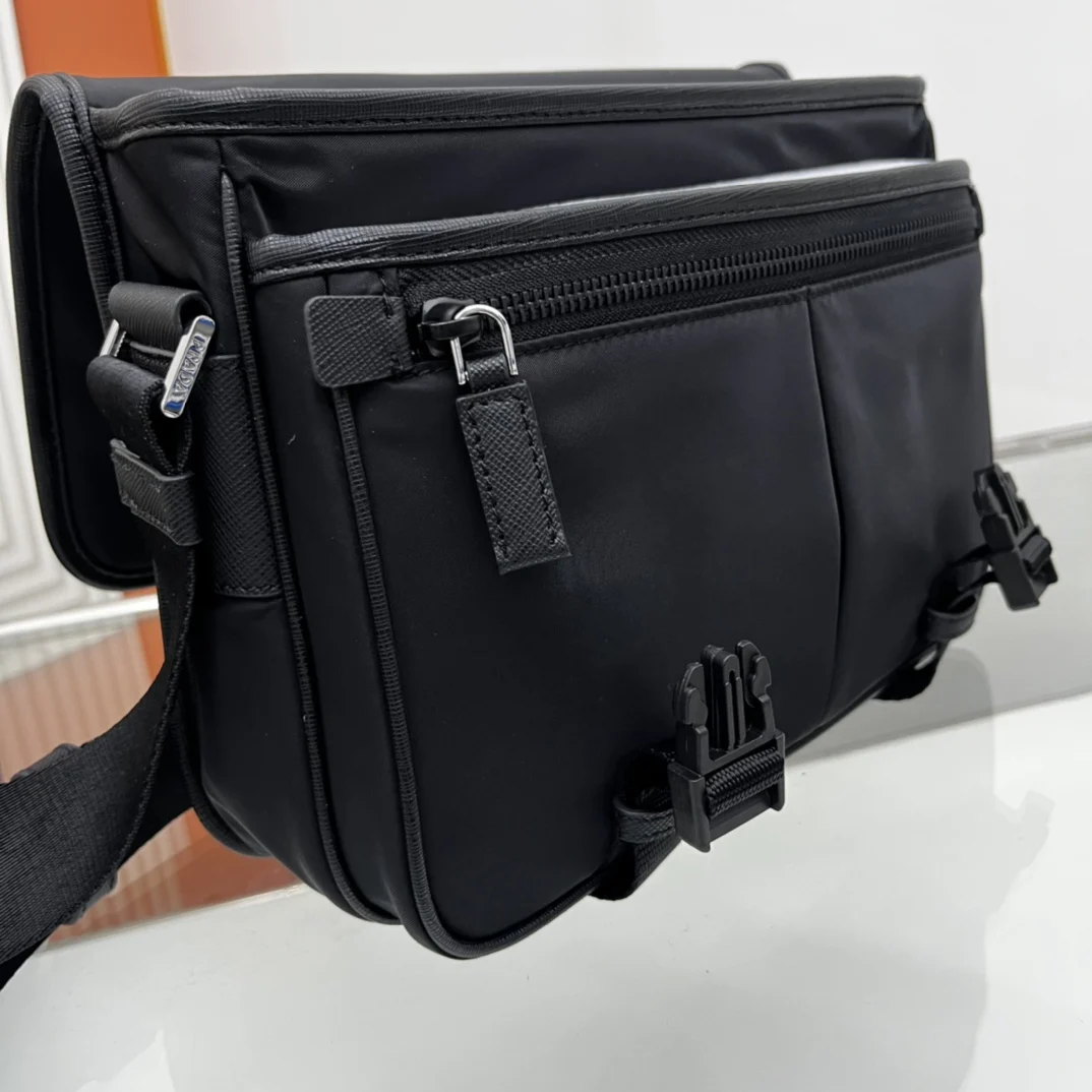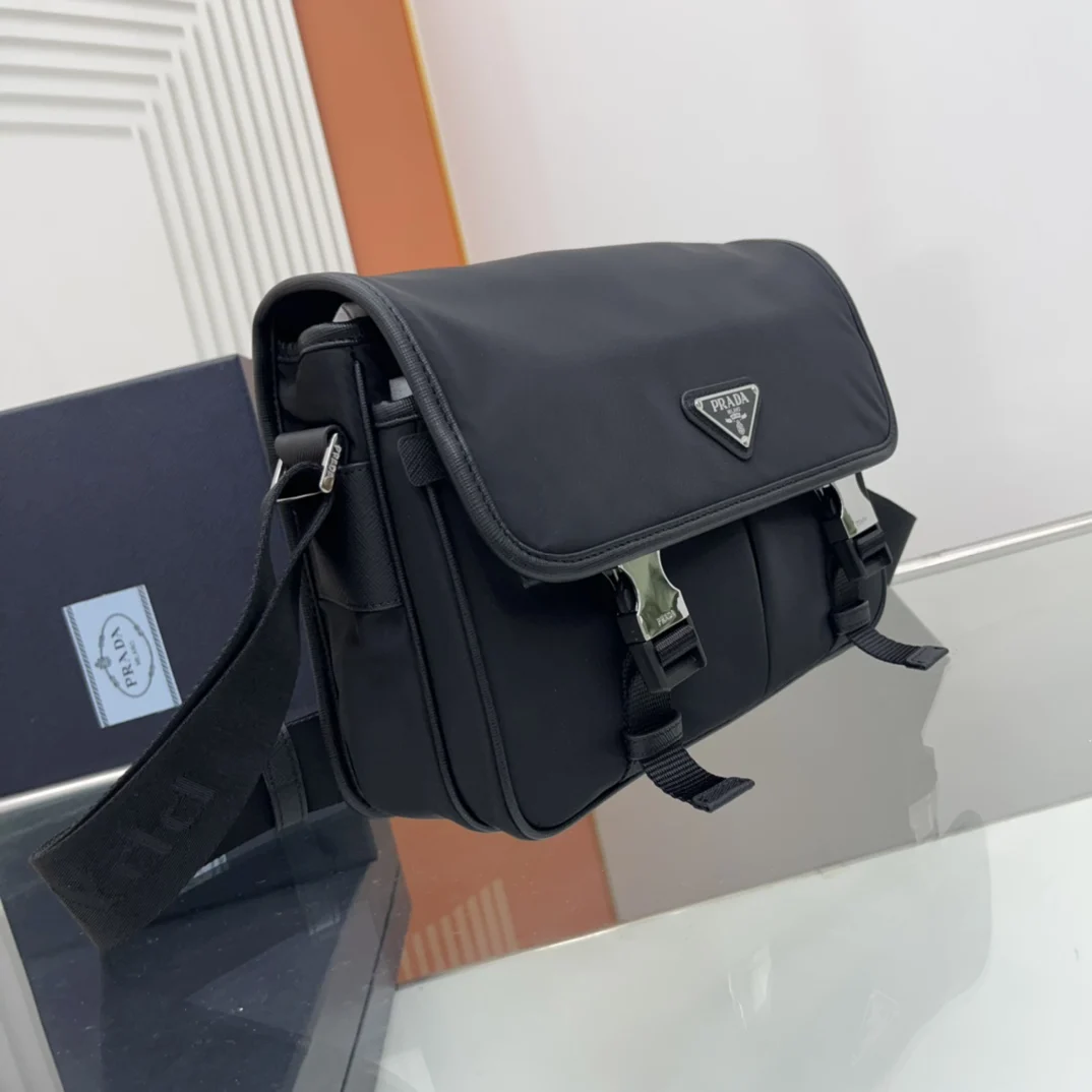 原单Prada新款邮差包尼龙材质和Saffiano皮革装饰 可调式肩带 带两个带扣的翻盖 背面拉链袋 翻盖下方两个口袋 分别为拉链袋和贴面口袋 带Prada徽标衬里的内部隔层和拉链袋 外部三角形徽标