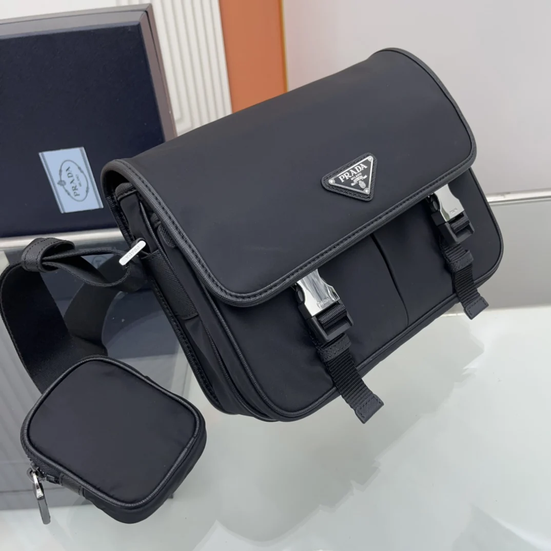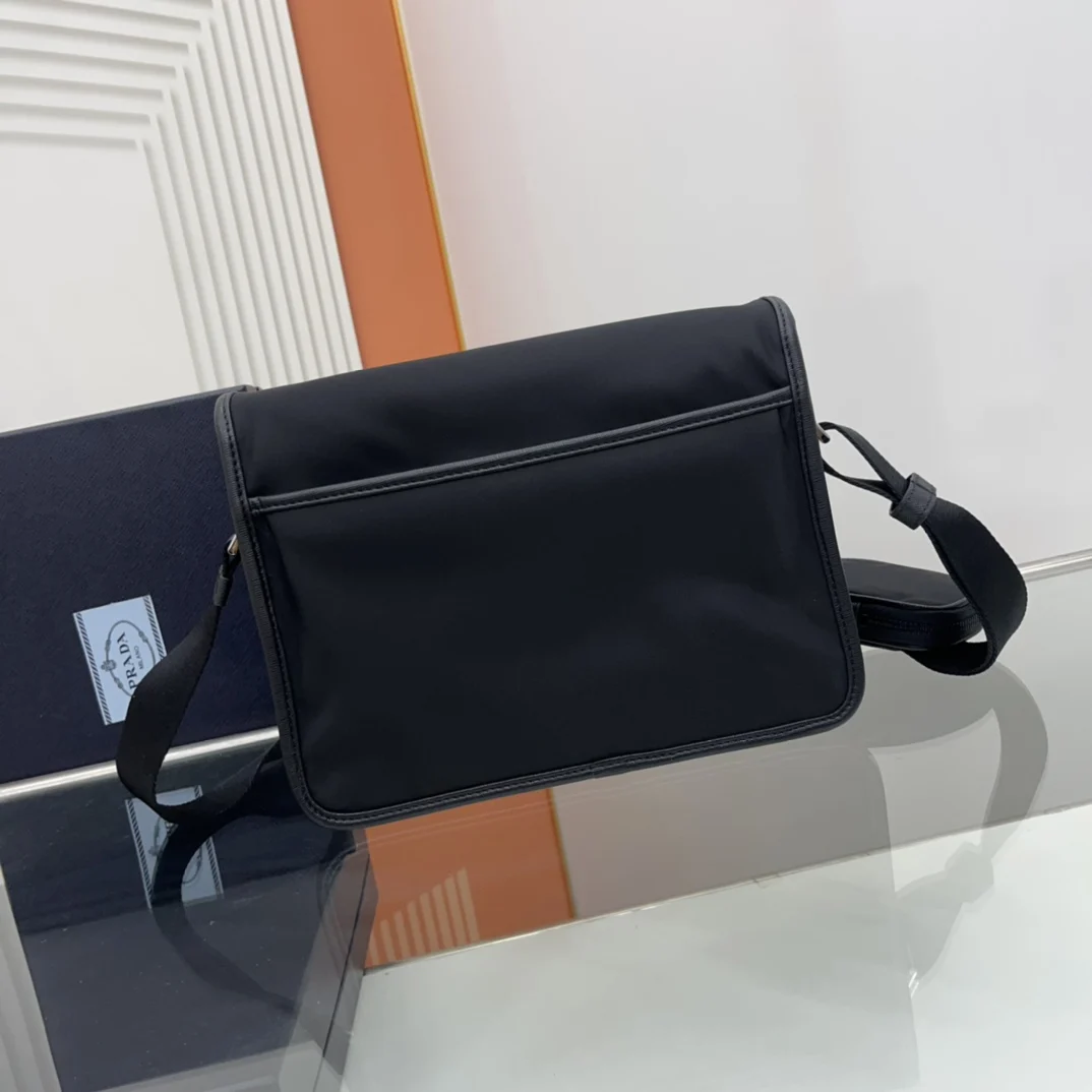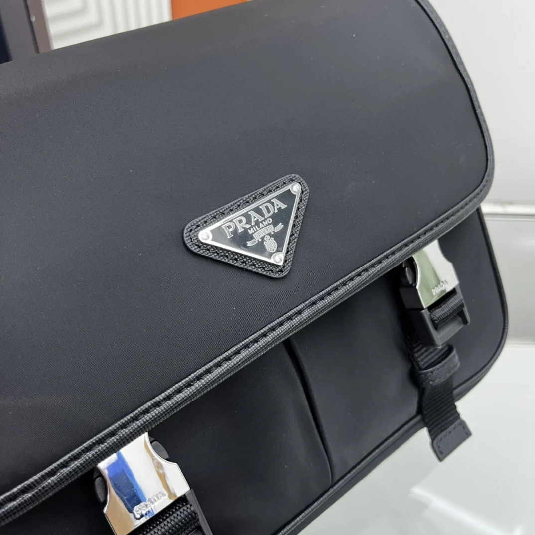 邮差包原单货这款尼龙翻盖手袋饰有经典的Saffiano皮革饰边 配有两枚旁开扣 并饰有标志性的三角形金属徽标 彰显时尚设计格调 采用进口尼龙和Saffiano皮革材质 两个正面口袋 其中一个带拉链背面拉链袋 两个内部手机袋 又可调式尼龙徽标提花肩带 经典又时尚的邮差包男土们最爱