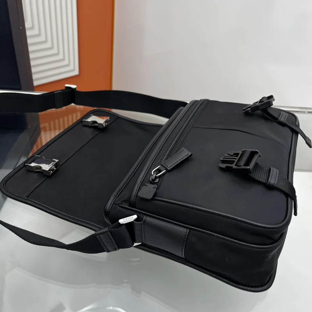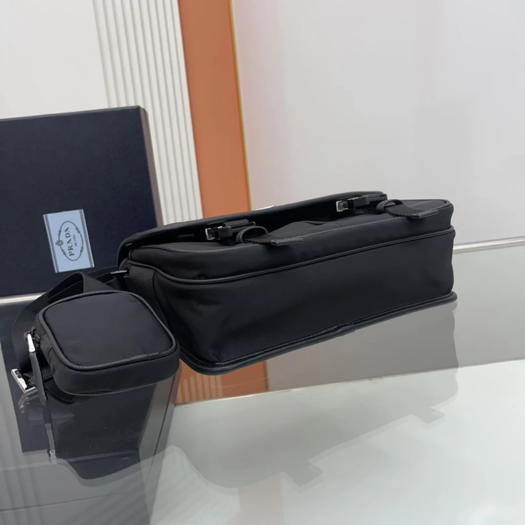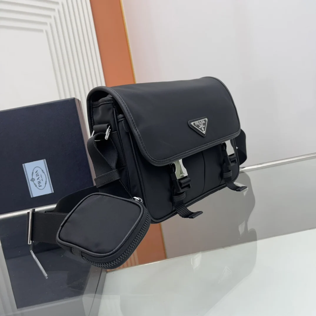 邮差包原单货这款尼龙翻盖手袋饰有经典的Saffiano皮革饰边 配有两枚旁开扣 并饰有标志性的三角形金属徽标 彰显时尚设计格调 采用进口尼龙和Saffiano皮革材质 两个正面口袋 其中一个带拉链背面拉链袋 两个内部手机袋 又可调式尼龙徽标提花肩带 经典又时尚的邮差包男土们最爱