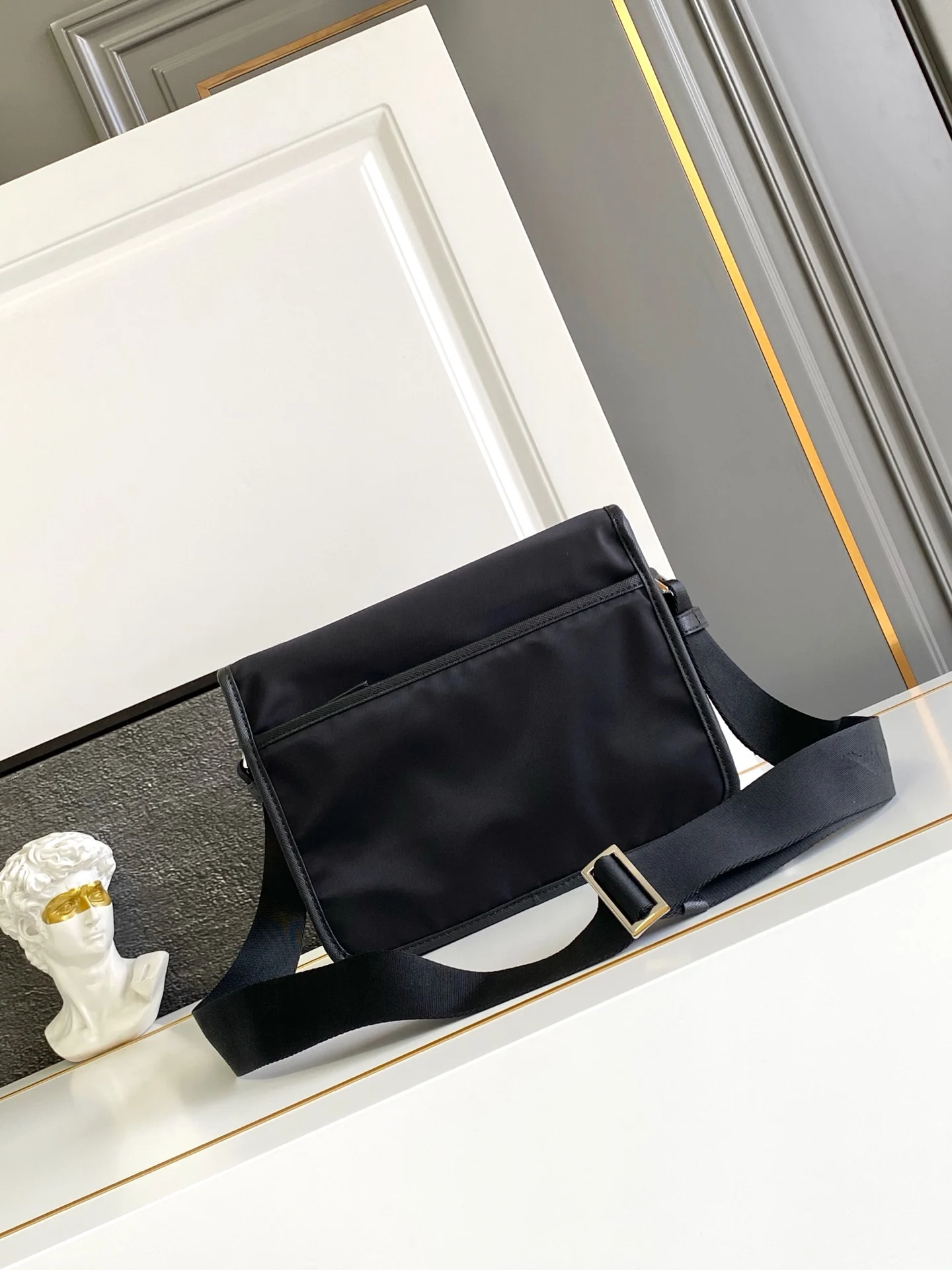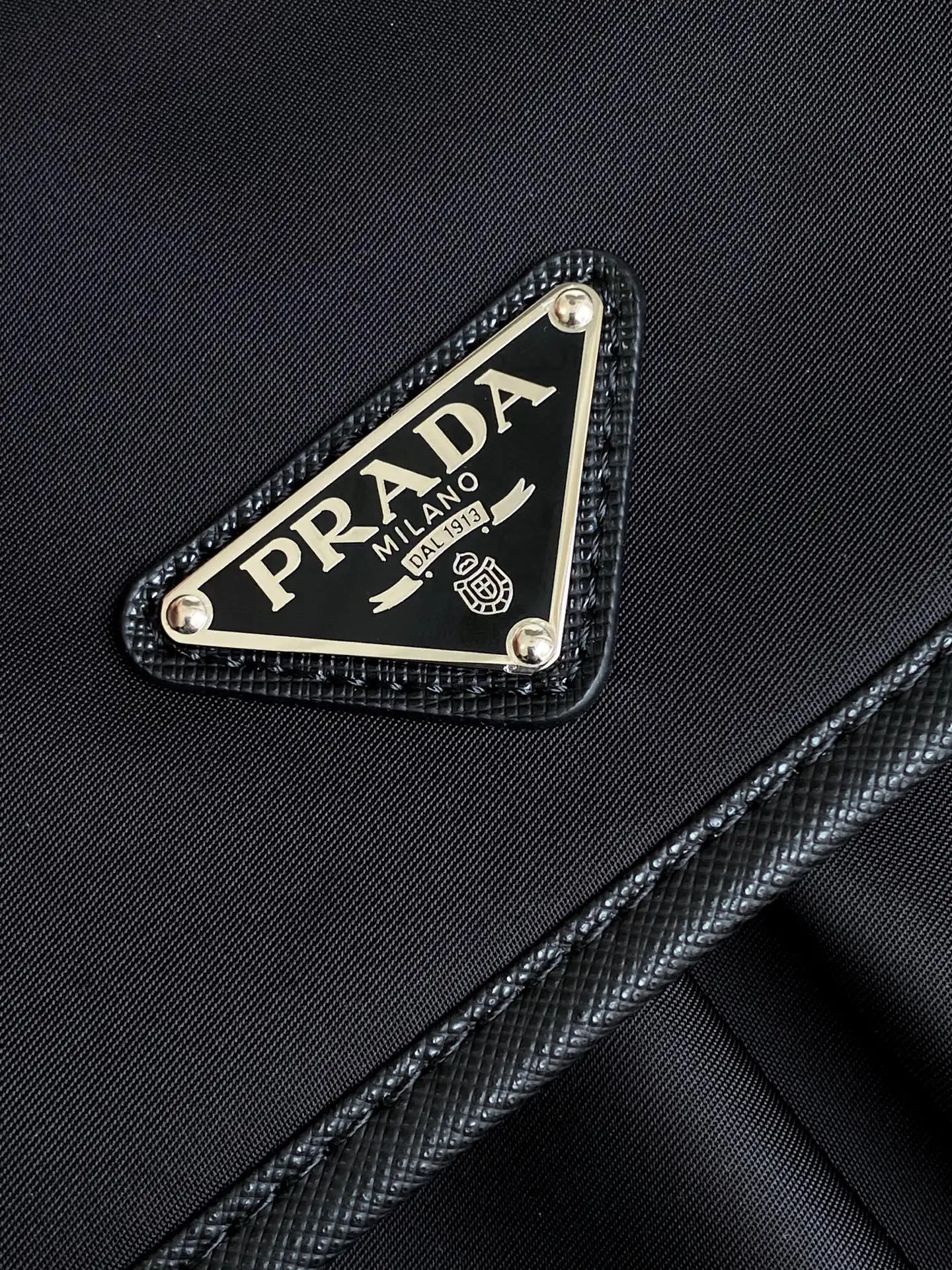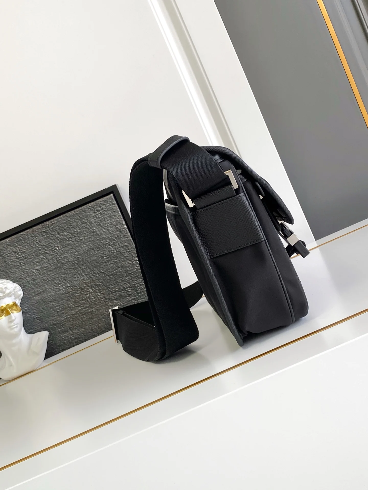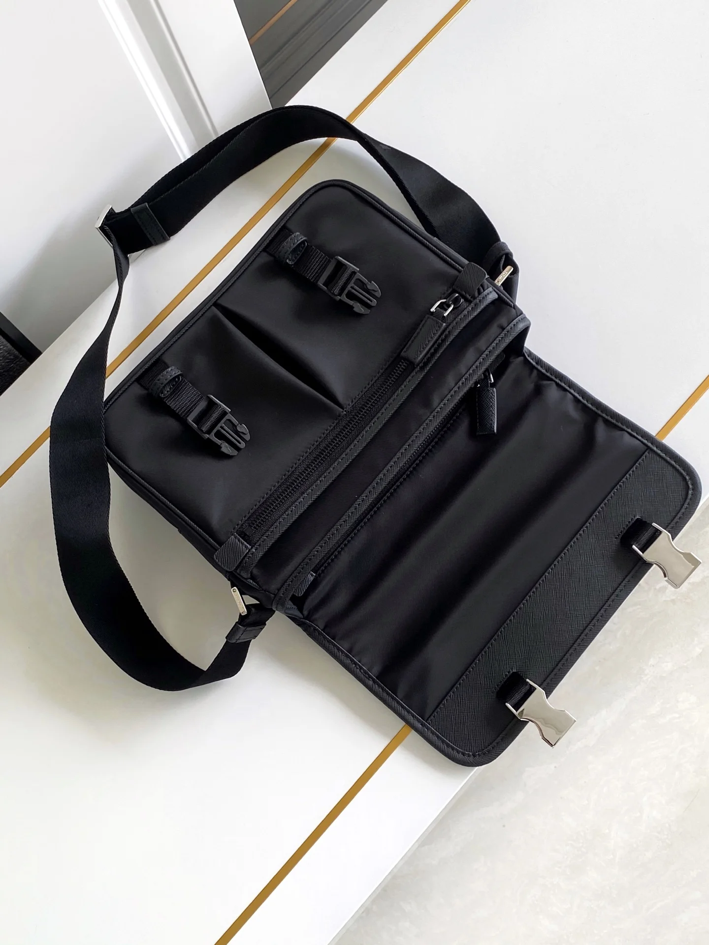 原单Prada新款邮差包尼龙材质和Saffiano皮革装饰 可调式肩带 带两个带扣的翻盖 背面拉链袋 翻盖下方两个口袋 分别为拉链袋和贴面口袋 带Prada徽标衬里的内部隔层和拉链袋 外部三角形徽标