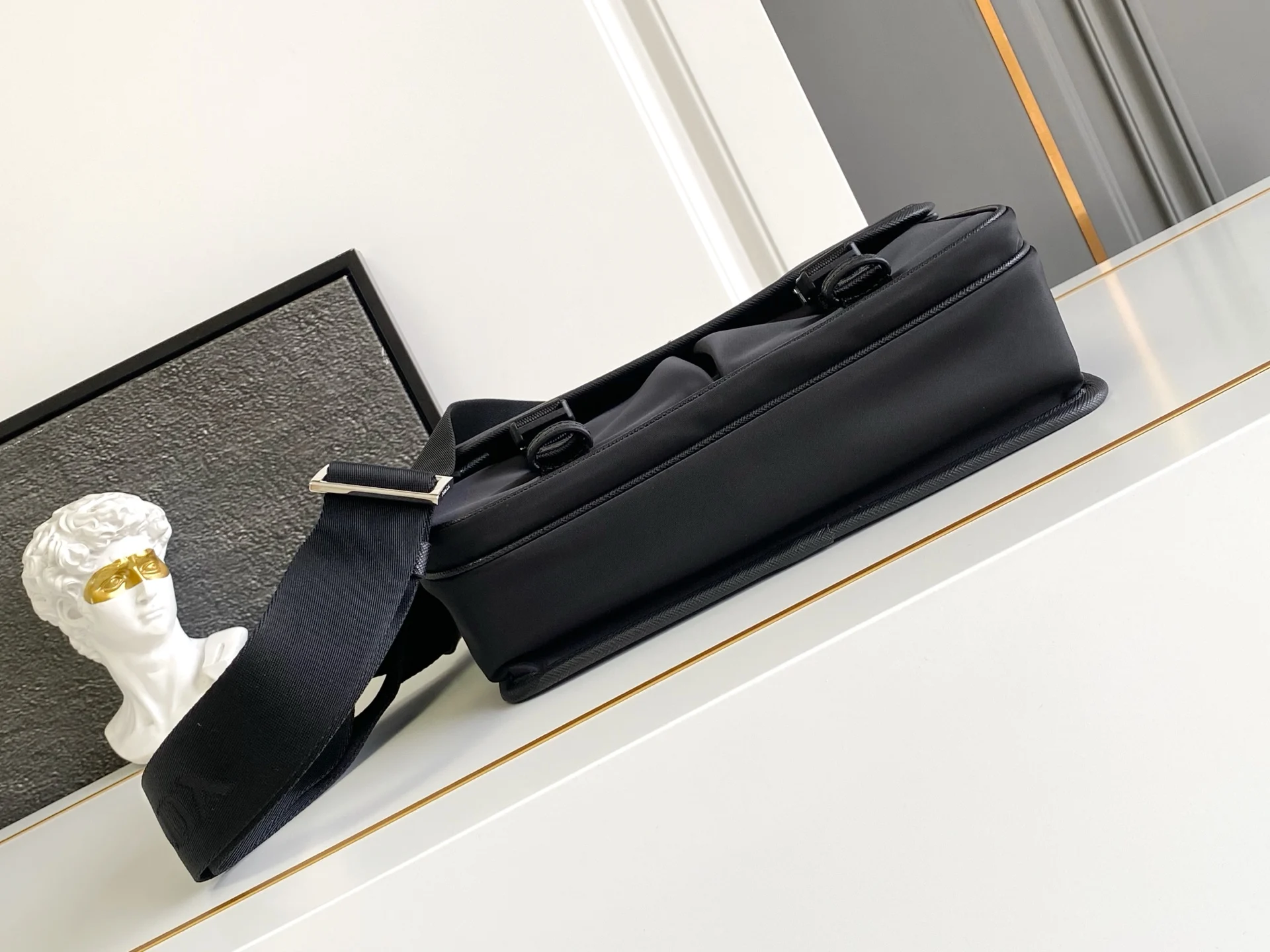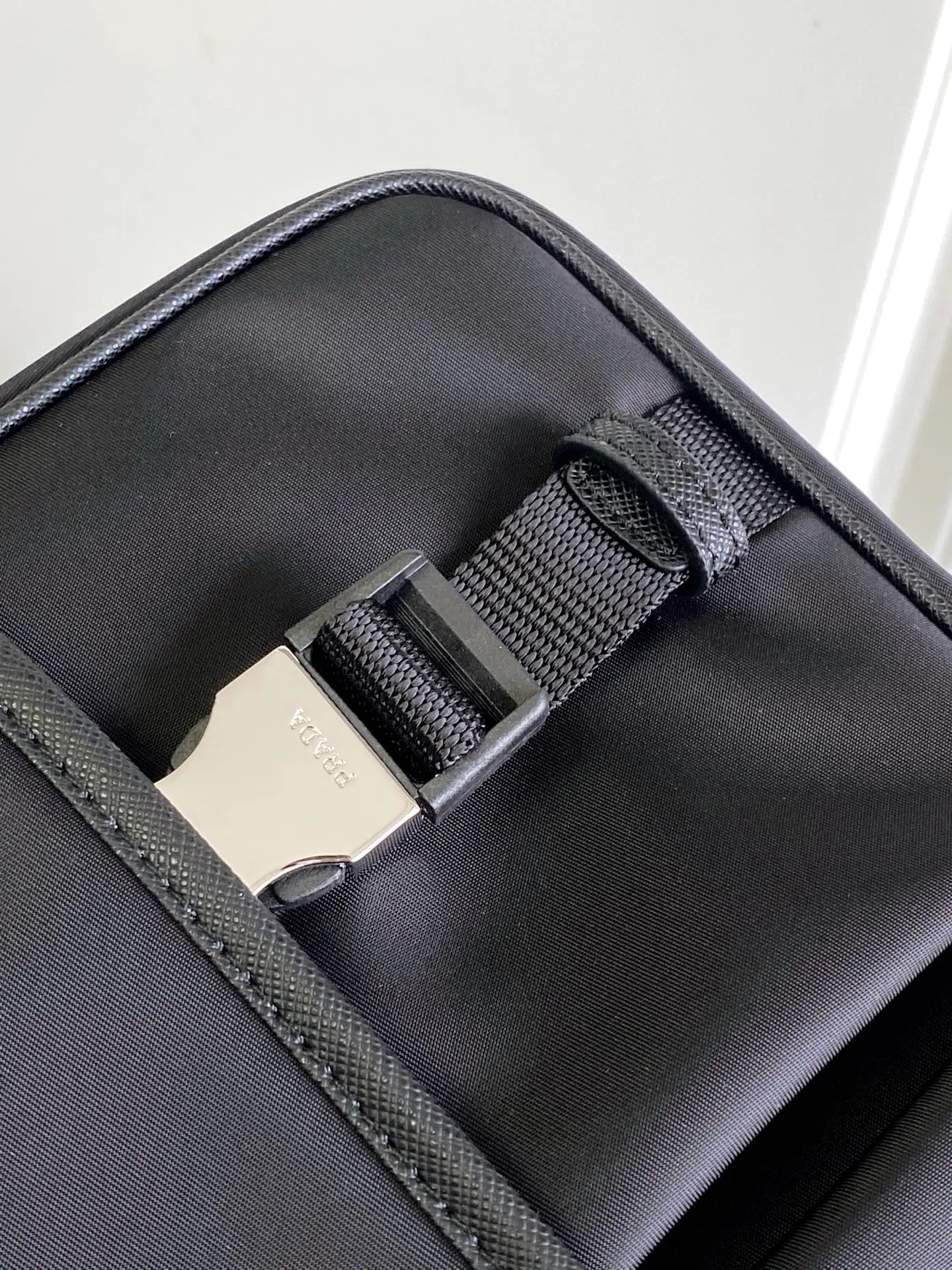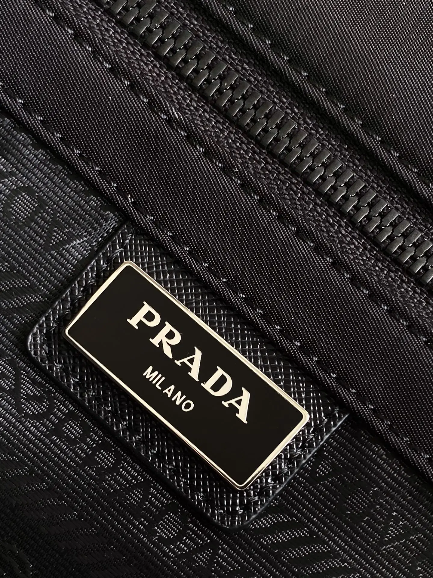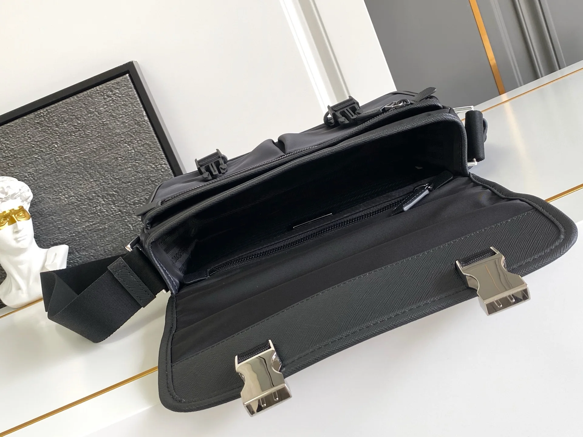 原单Prada新款邮差包尼龙材质和Saffiano皮革装饰 可调式肩带 带两个带扣的翻盖 背面拉链袋 翻盖下方两个口袋 分别为拉链袋和贴面口袋 带Prada徽标衬里的内部隔层和拉链袋 外部三角形徽标