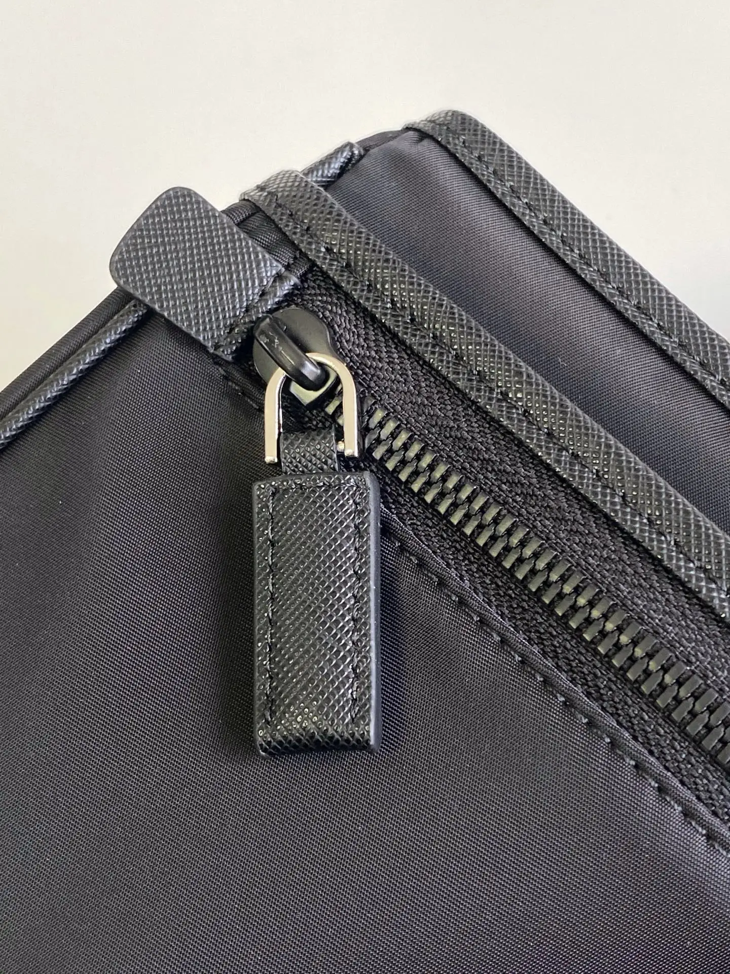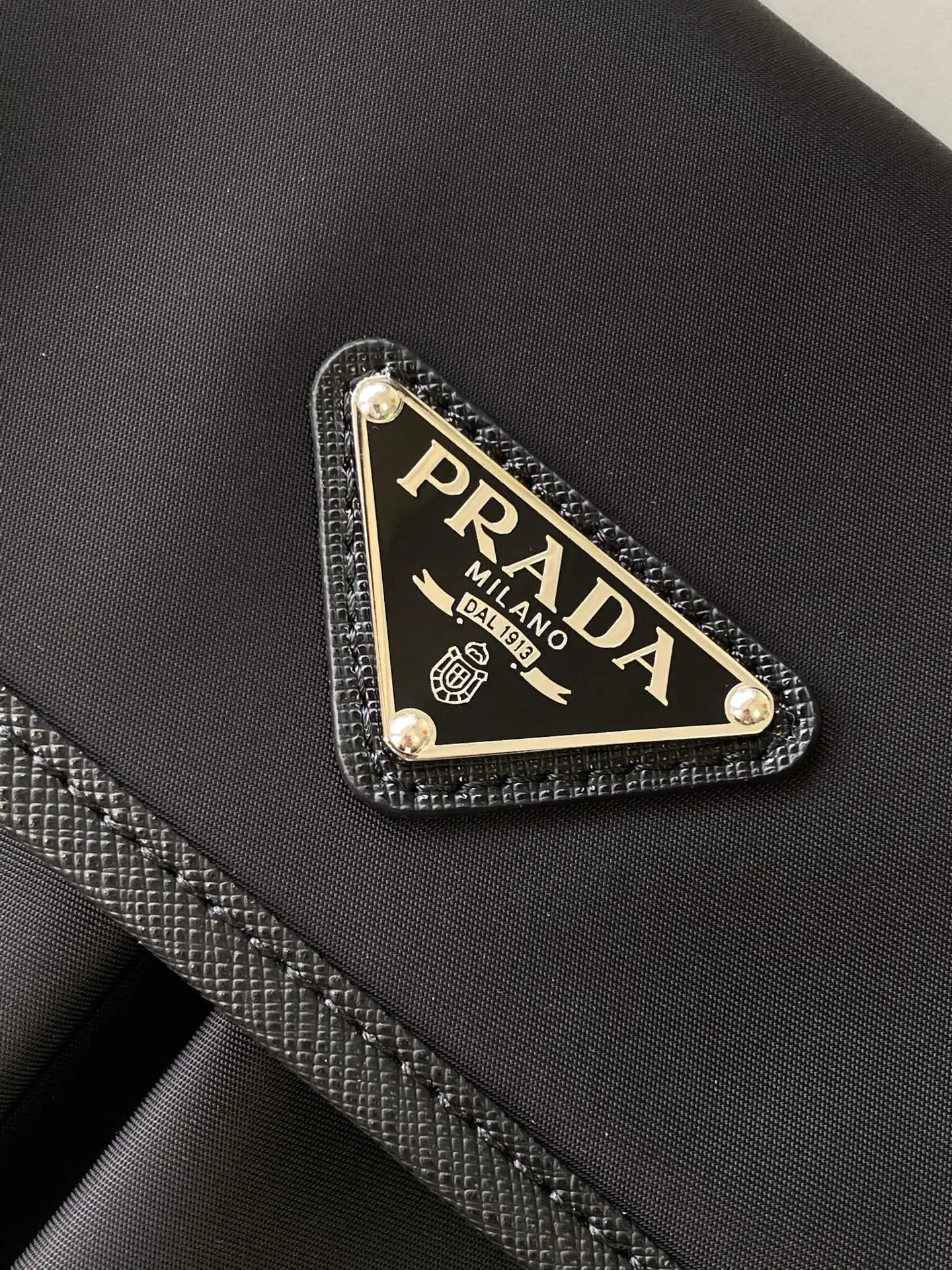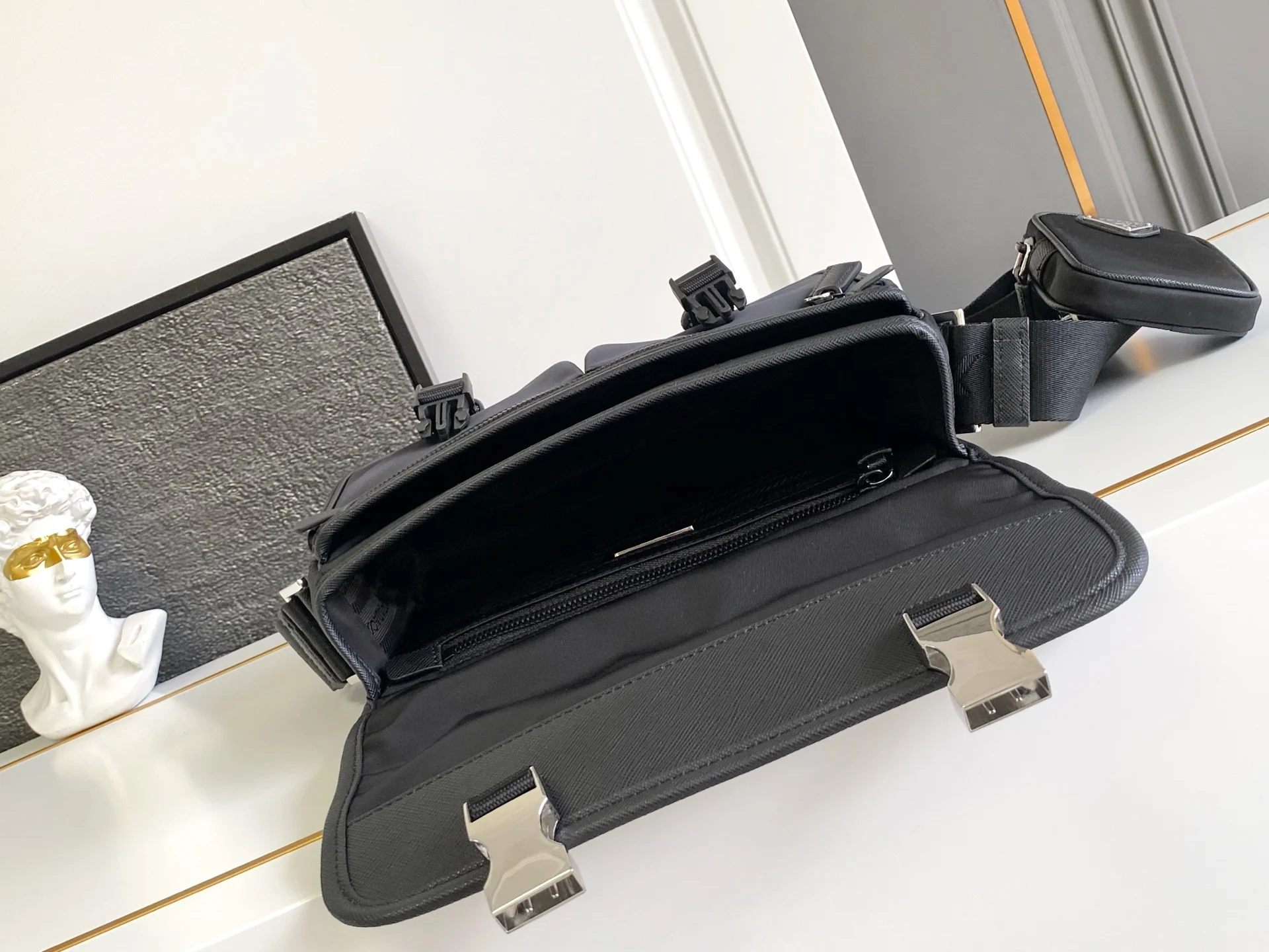 邮差包原单货这款尼龙翻盖手袋饰有经典的Saffiano皮革饰边 配有两枚旁开扣 并饰有标志性的三角形金属徽标 彰显时尚设计格调 采用进口尼龙和Saffiano皮革材质 两个正面口袋 其中一个带拉链背面拉链袋 两个内部手机袋 又可调式尼龙徽标提花肩带 经典又时尚的邮差包男土们最爱