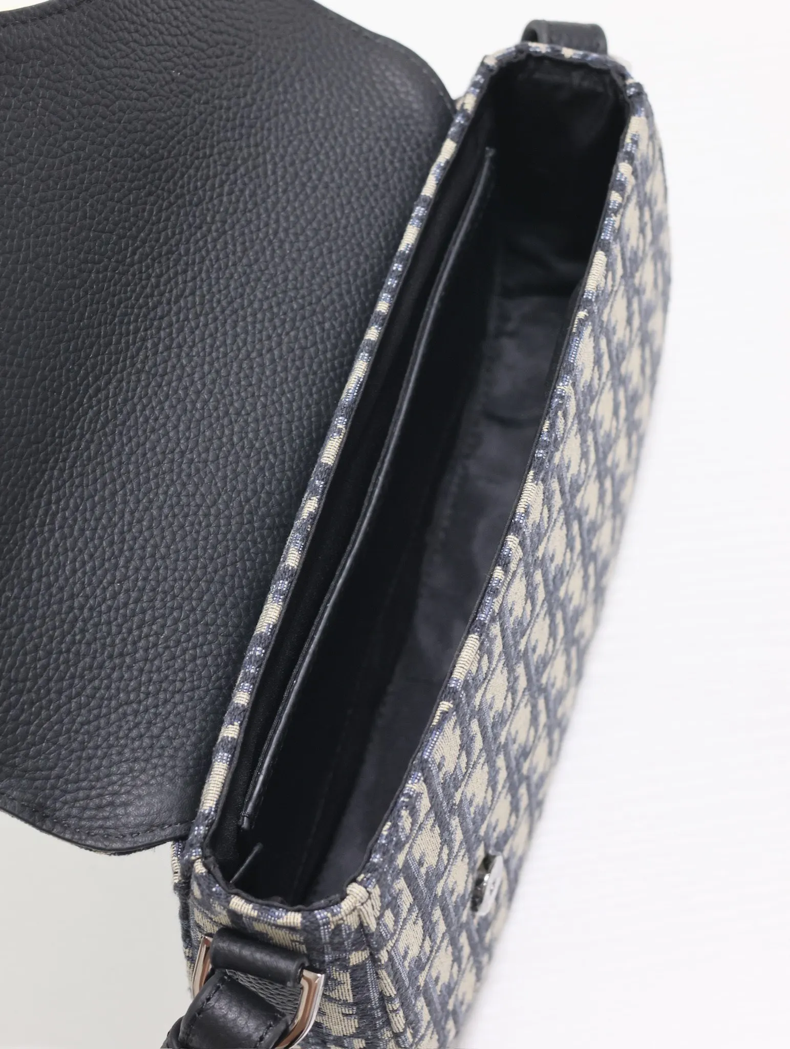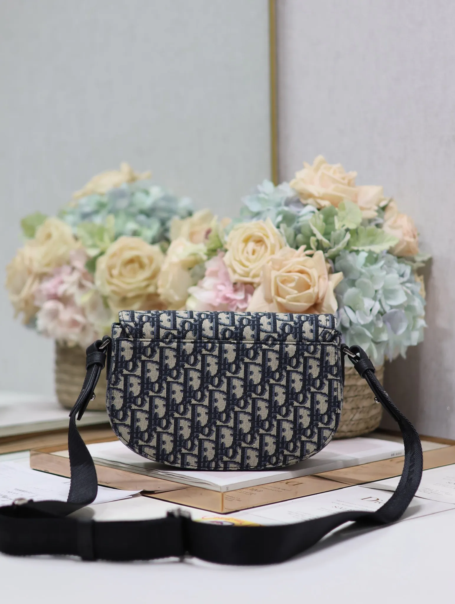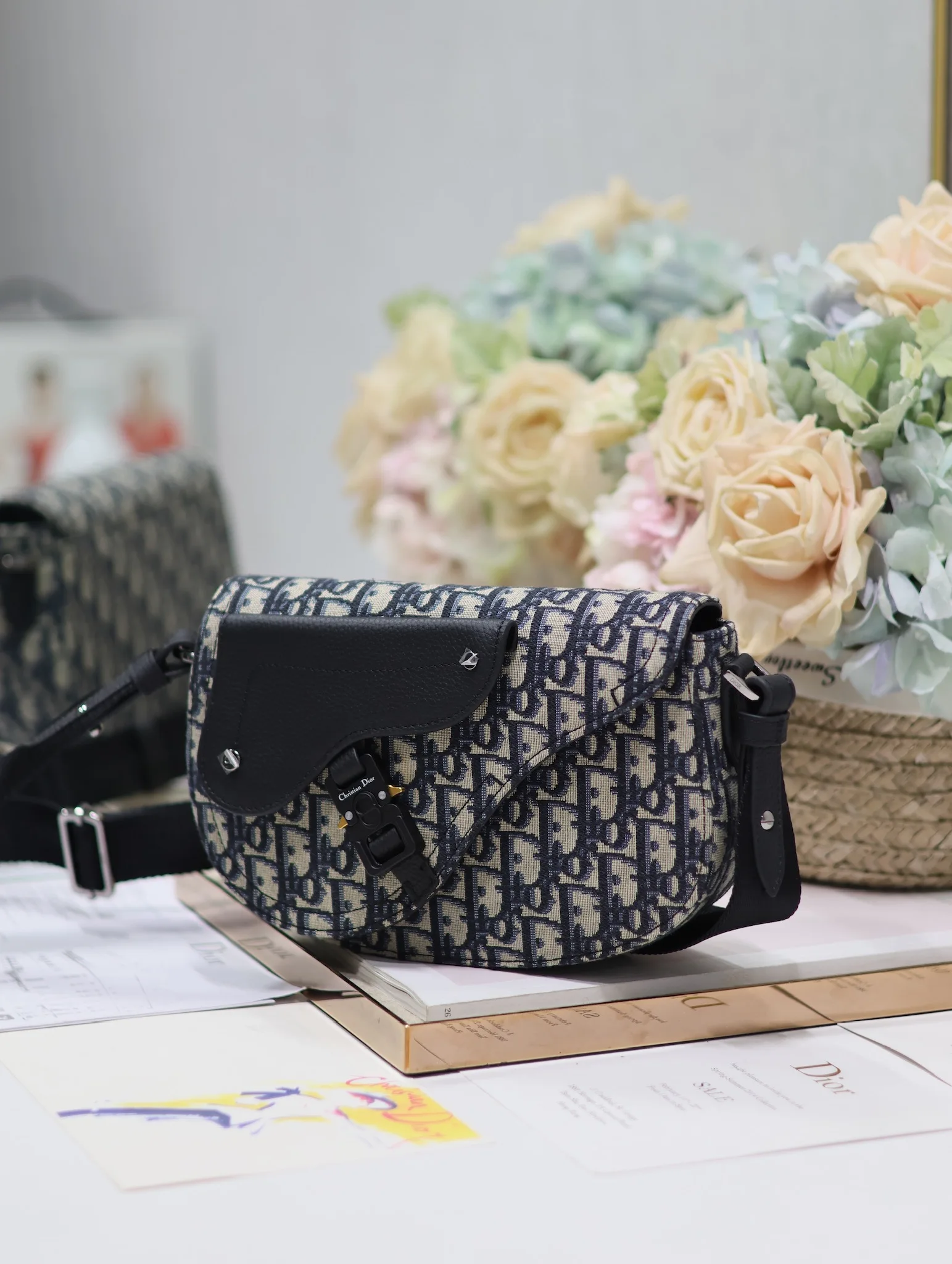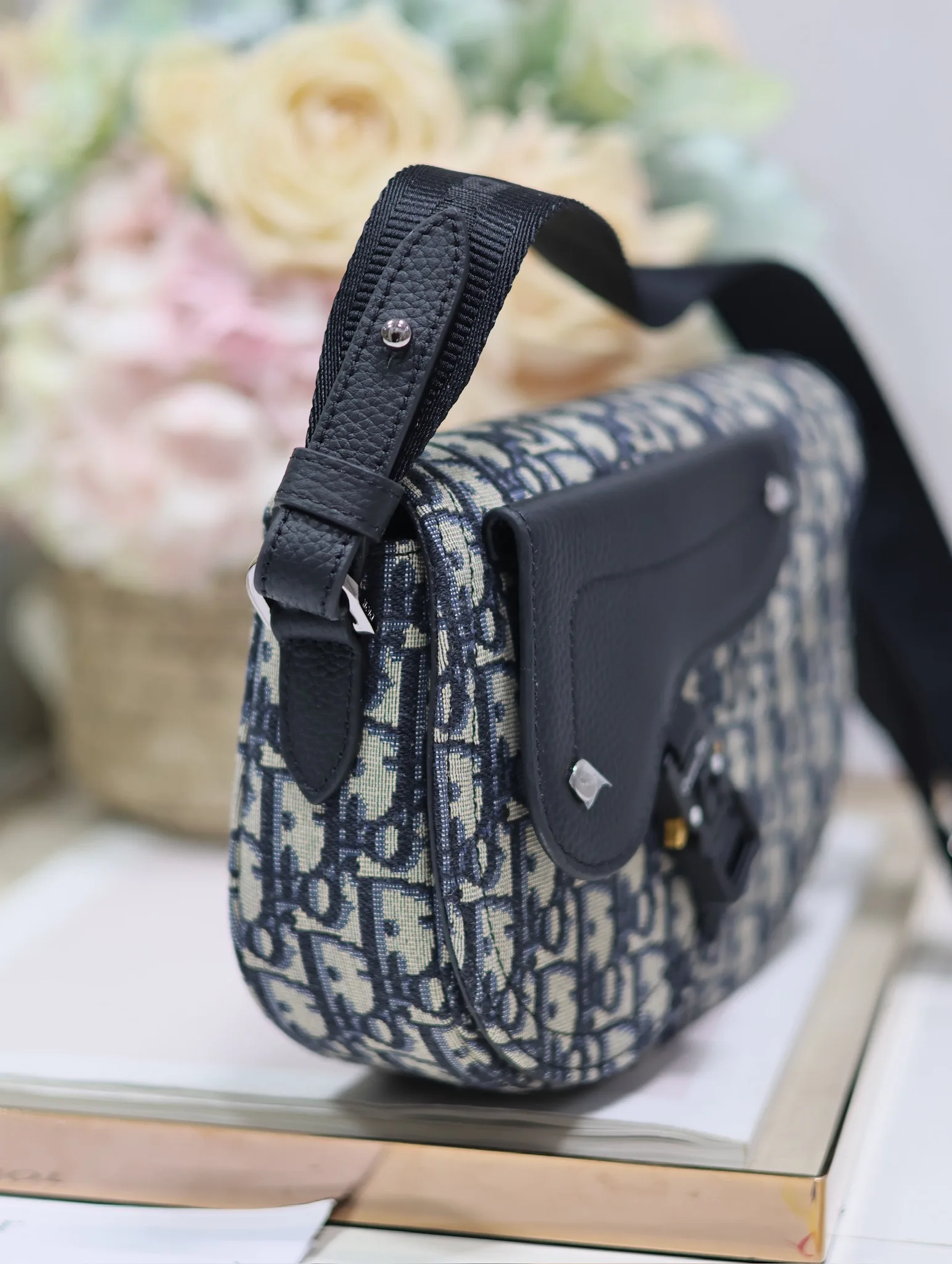 Dior马鞍信使包 蓝布 这款马鞍信使包是二零二四秋季男装系列新品 精巧时尚 采用米色和黑色 Oblique 印花面料精心制作 搭配黑色粒面牛皮革马鞍翻盖 点缀以铝扣提升格调 可肩背或斜挎 内侧饰有 Dior 压花标志型号 325尺寸 24 x 16.5 x 5.5 厘米 长 x 高 x 宽