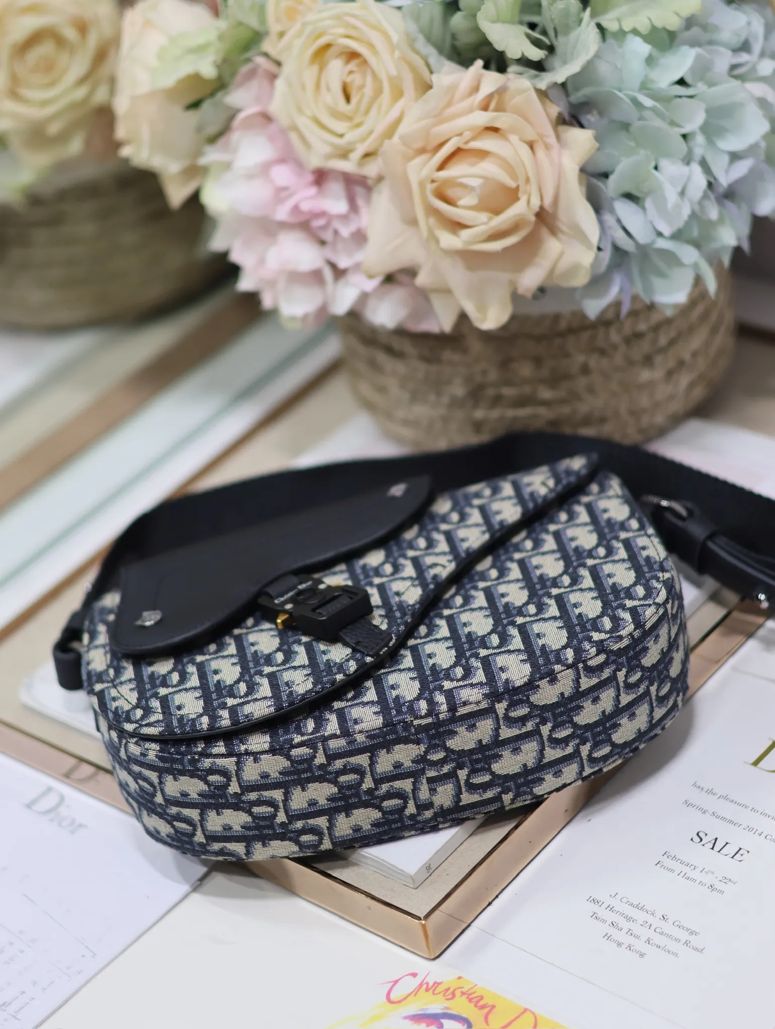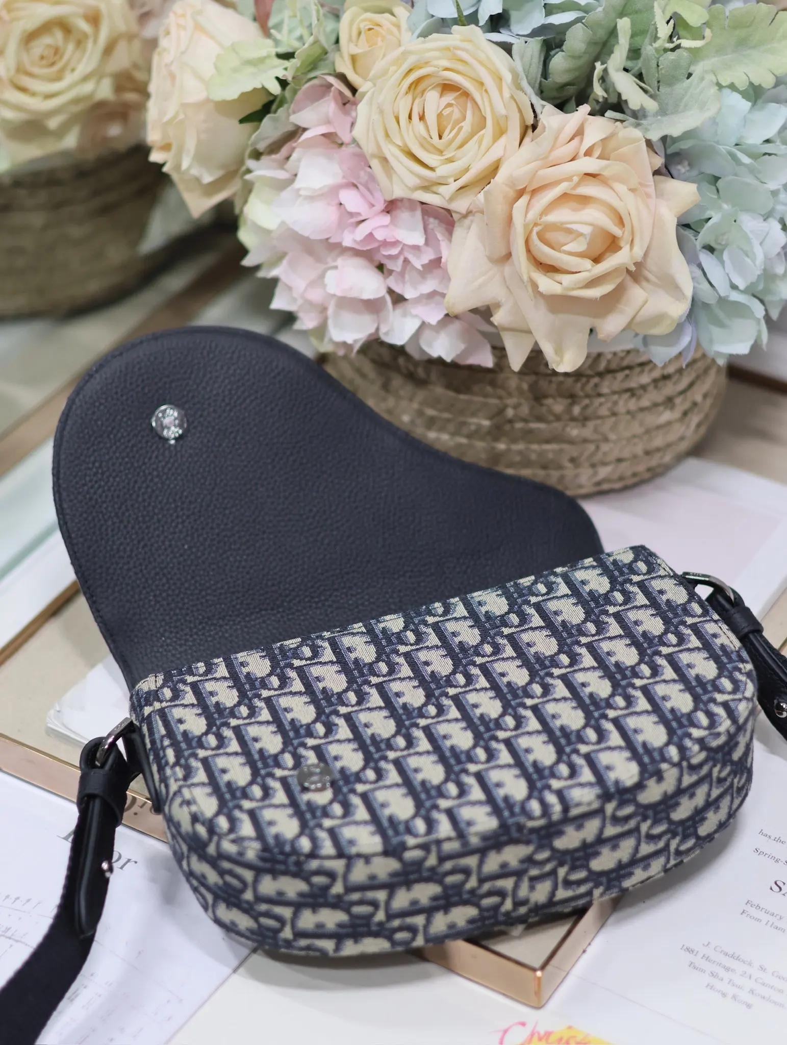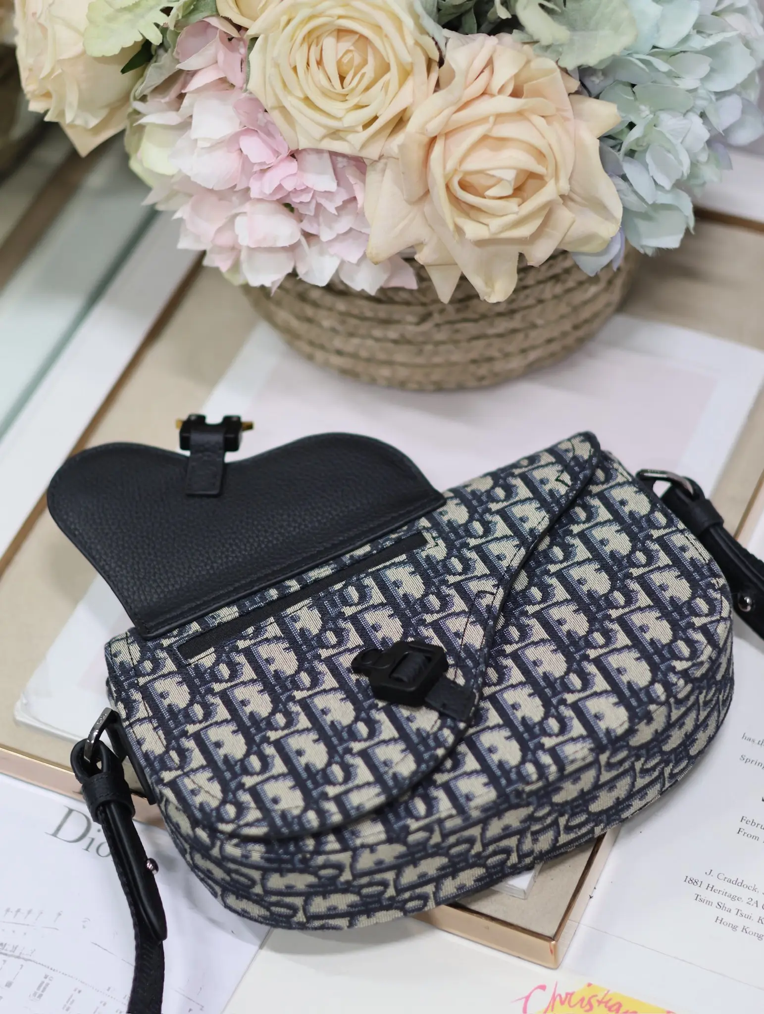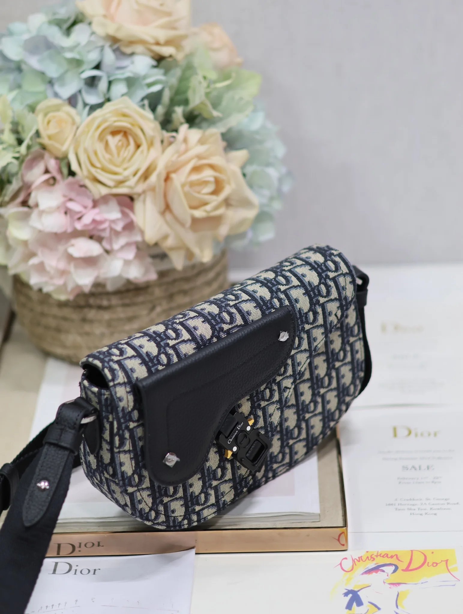 Dior马鞍信使包 蓝布 这款马鞍信使包是二零二四秋季男装系列新品 精巧时尚 采用米色和黑色 Oblique 印花面料精心制作 搭配黑色粒面牛皮革马鞍翻盖 点缀以铝扣提升格调 可肩背或斜挎 内侧饰有 Dior 压花标志型号 325尺寸 24 x 16.5 x 5.5 厘米 长 x 高 x 宽