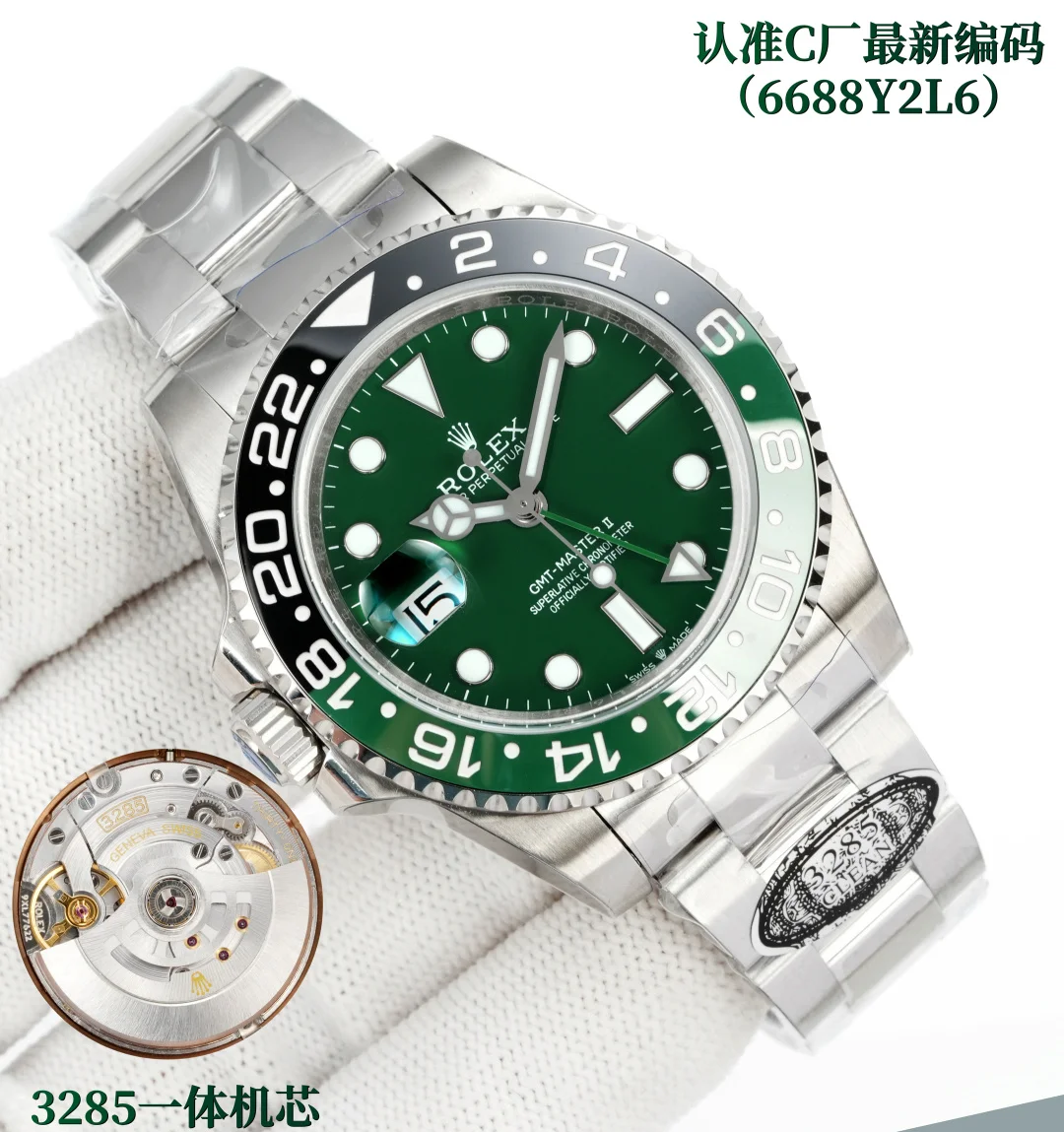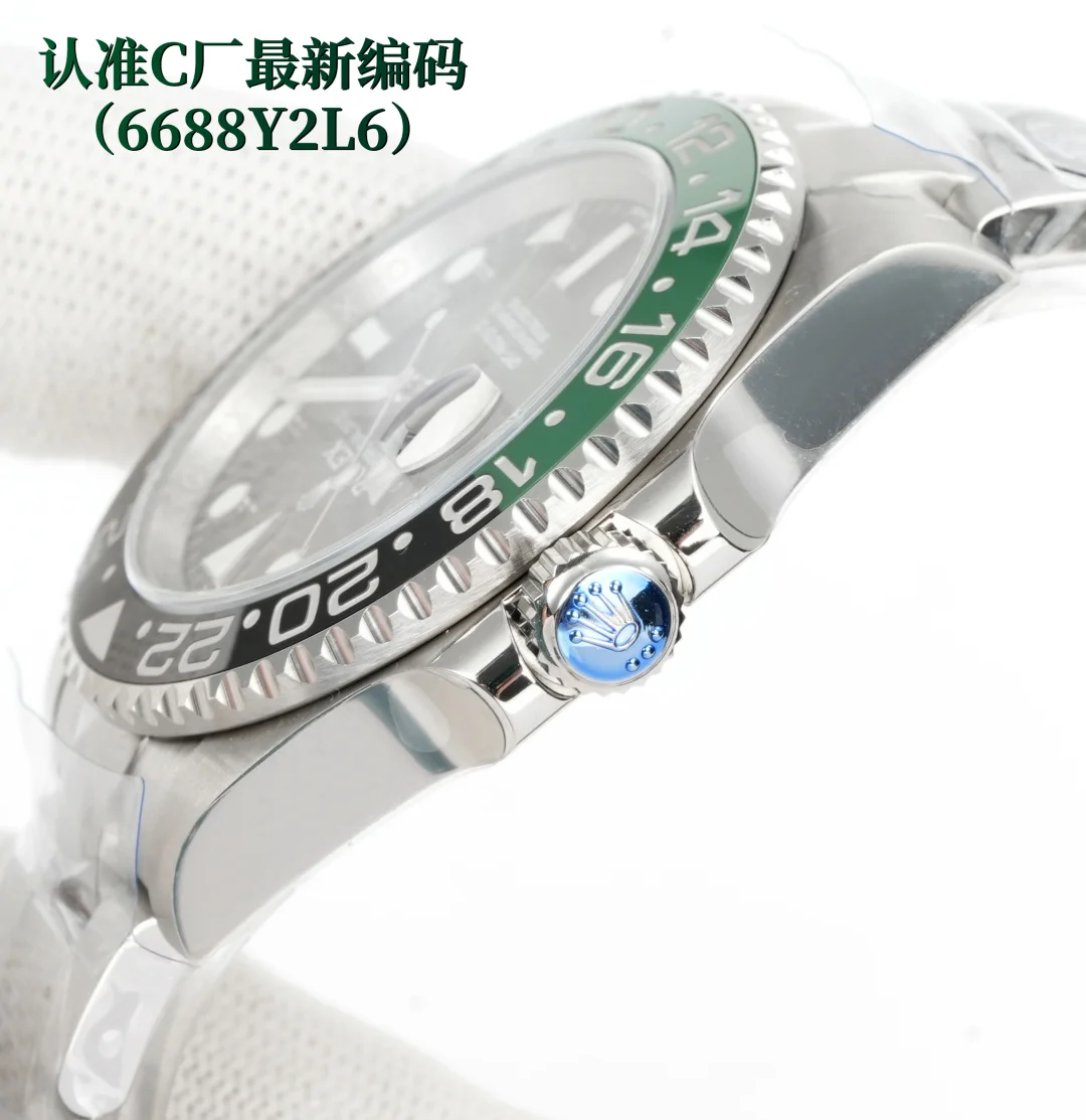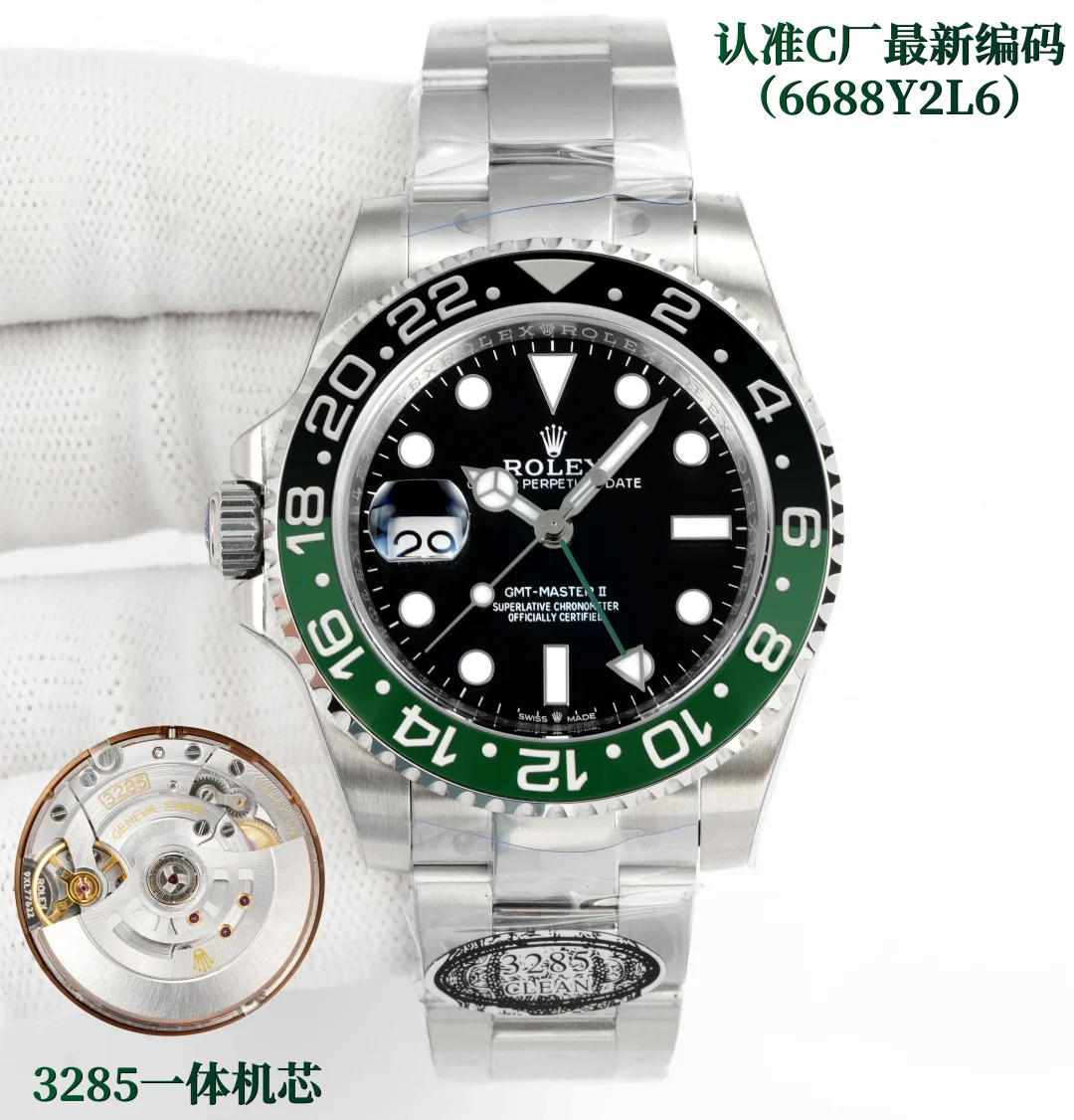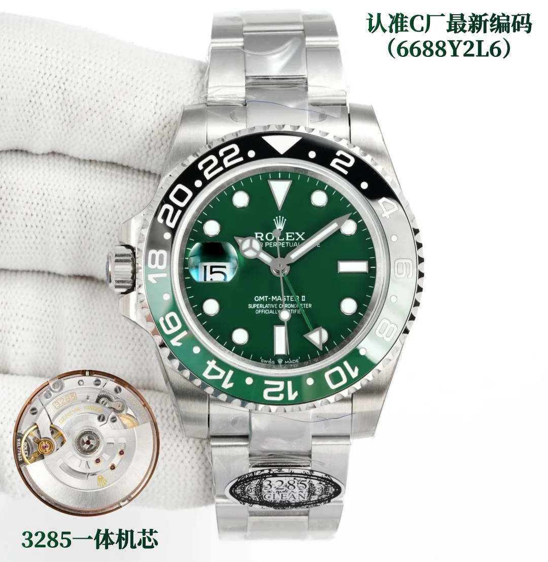 C 劳力士 ROLEX CM3 配重 C厂跳码 GMT格林尼治升级版 采用正品一致904L钢材 一体成形的陶瓷白金字体圈口与正品一致 全新3285一体机芯 同步正品GMT针通过正反调时间及日历 配件通用原装 904L钢表壳表链 蓝宝石镜面 超级夜光 双向陶瓷旋转表圈 折叠表扣