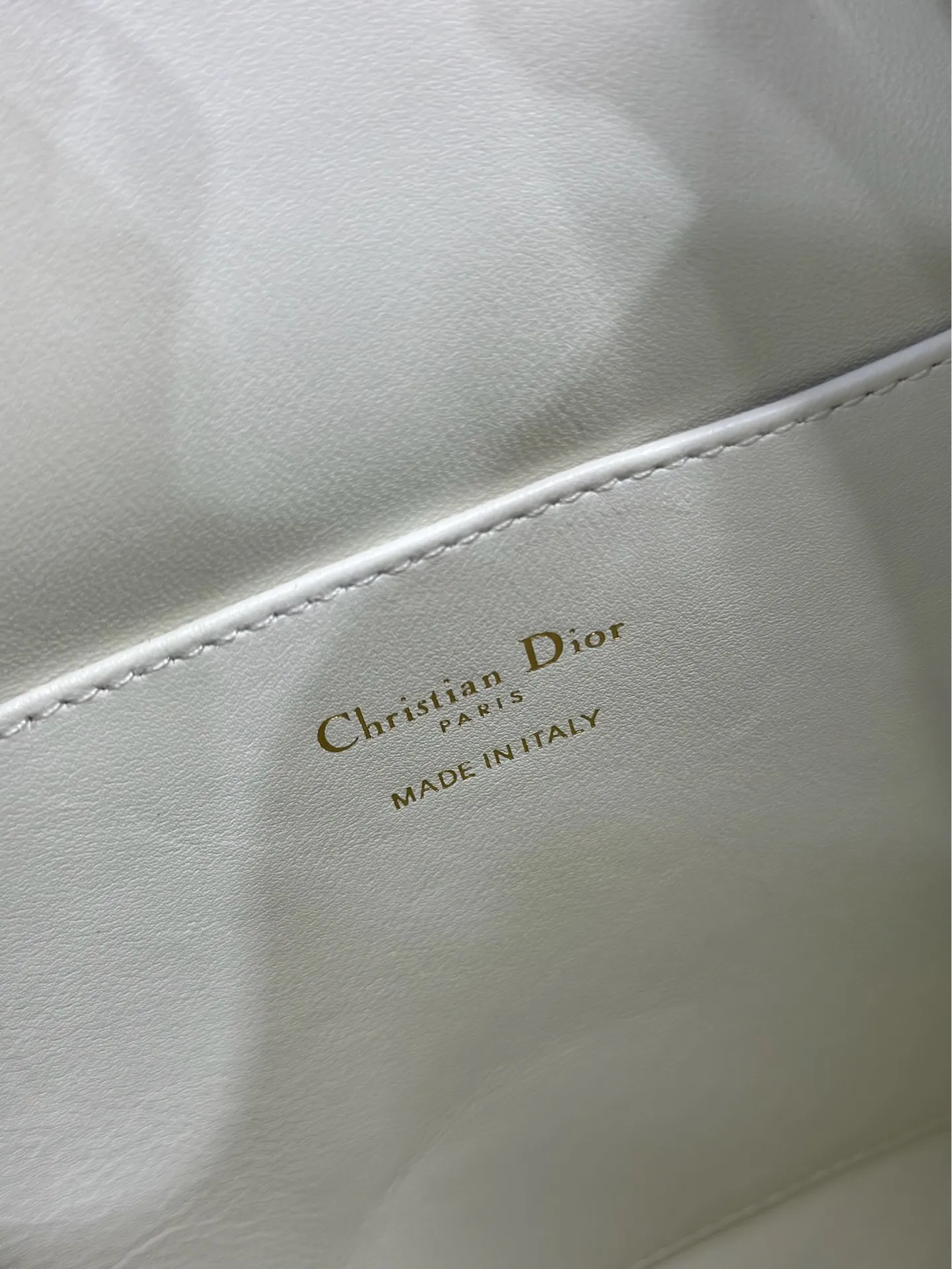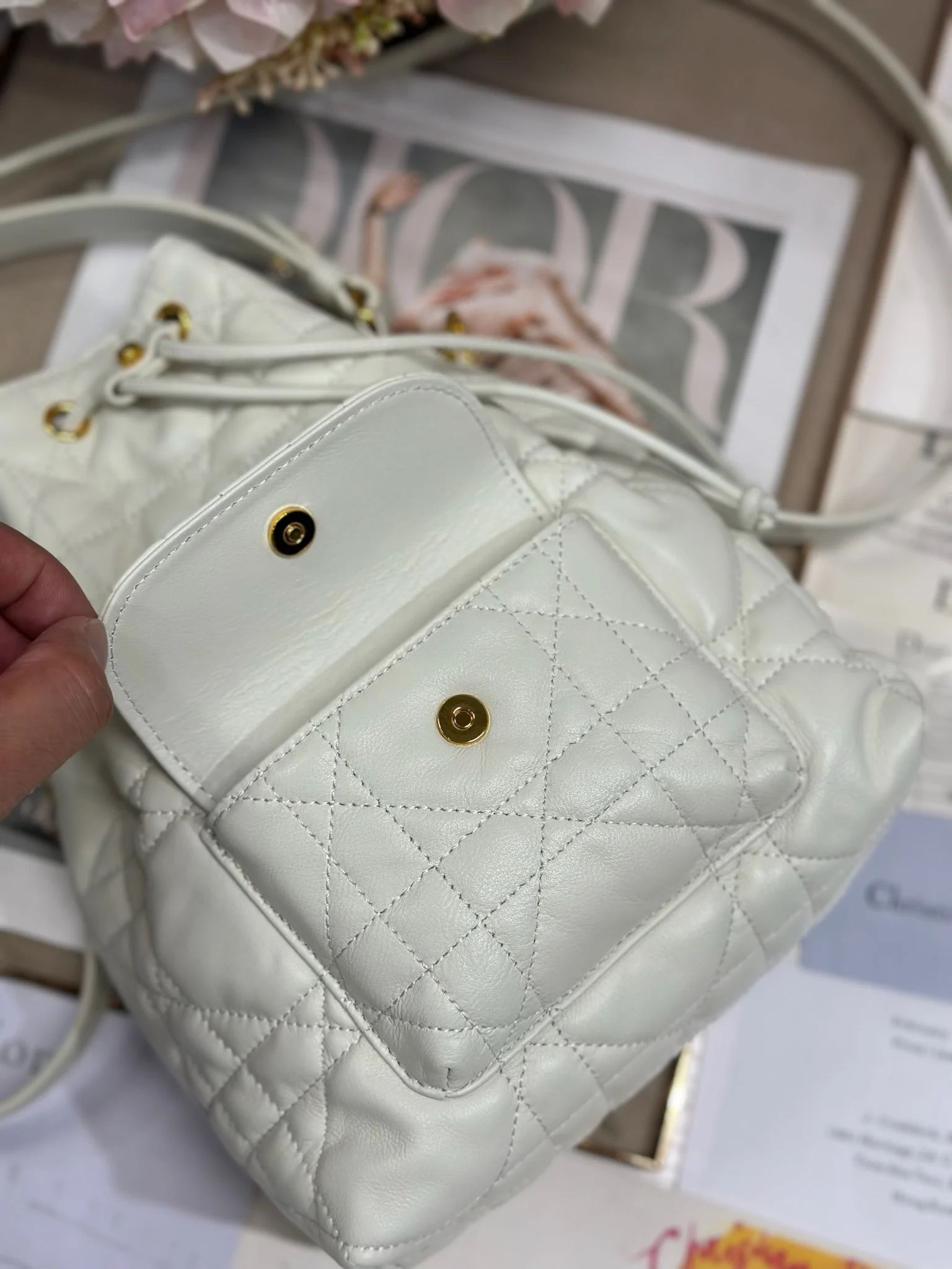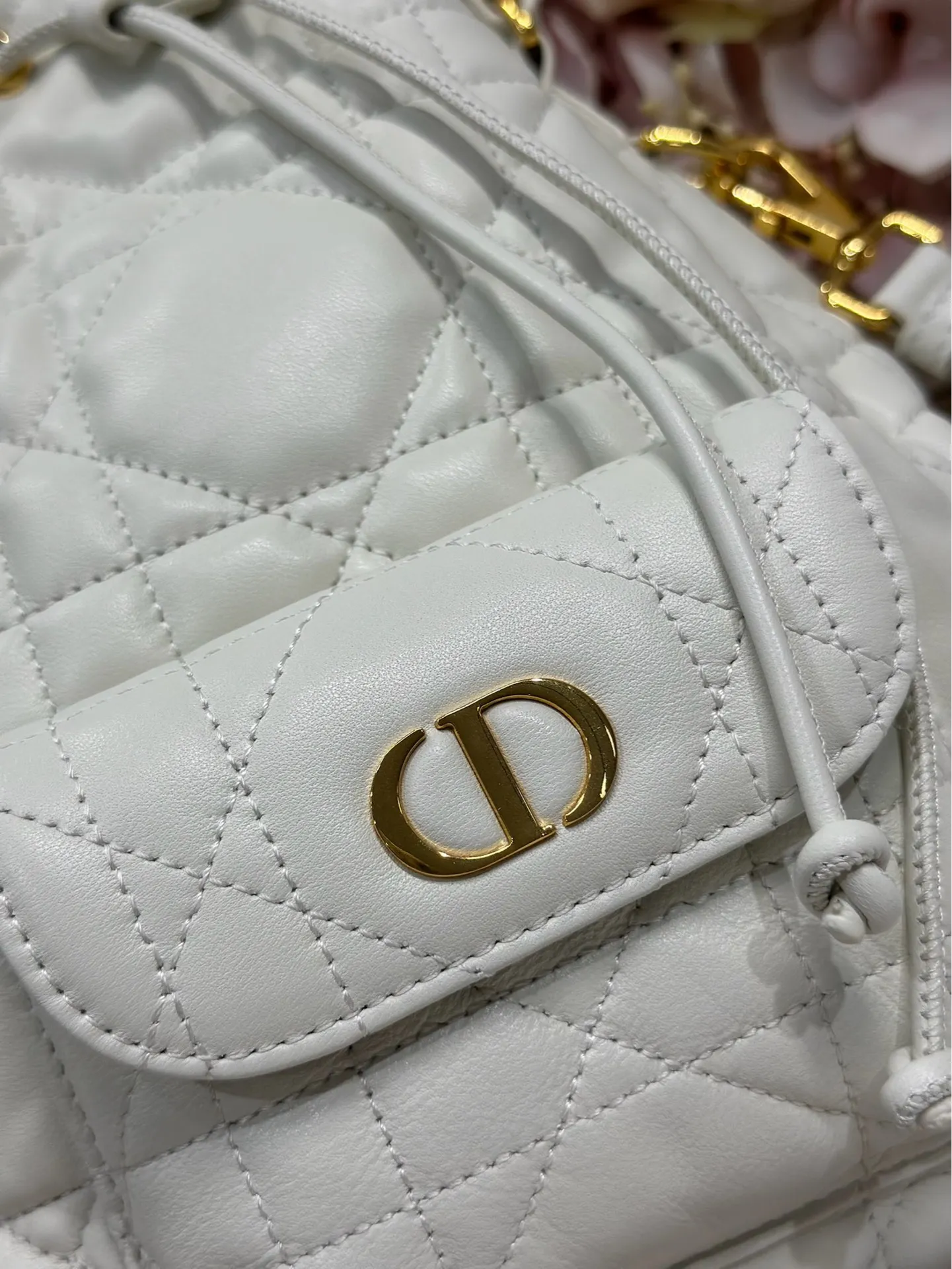 小号 Dior Caro 水桶包 白色 这款 Dior Caro 水桶包秋季成衣系列新品 彰显时尚优雅风范 采用白色羊皮革等材质精心制作 饰以超大藤格纹缉面线 带有宽敞的抽绳隔层 正面翻盖口袋饰以金色饰面金属 CD 标志 可收纳各种小件日常用品 小号款式 搭配可拆卸顶部手柄和可调节 可拆卸肩带 可轻松手提 肩背或斜挎 型号 3372