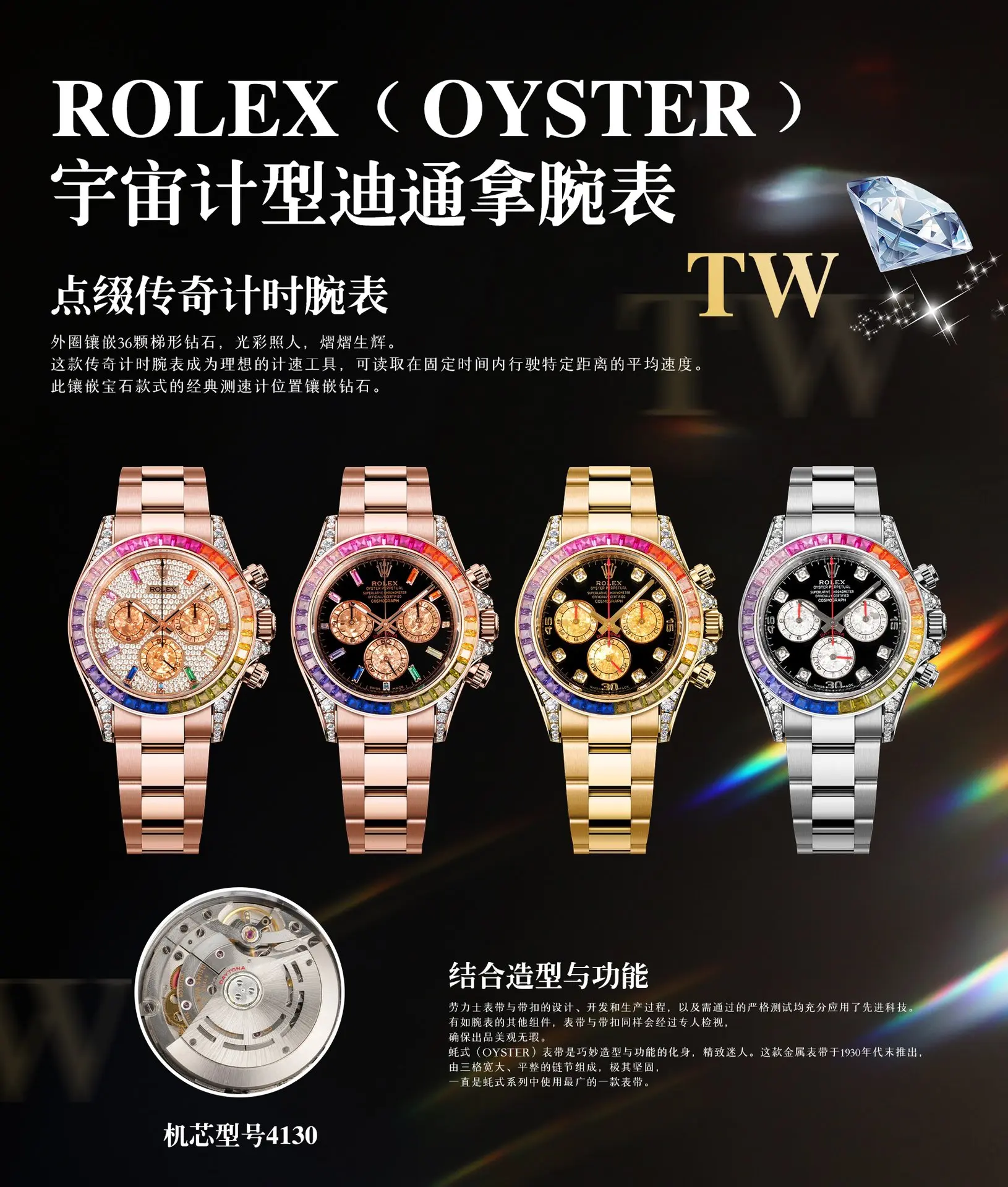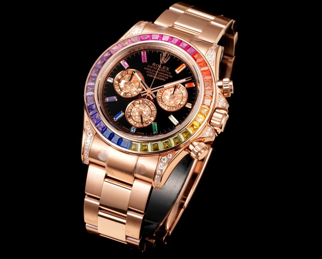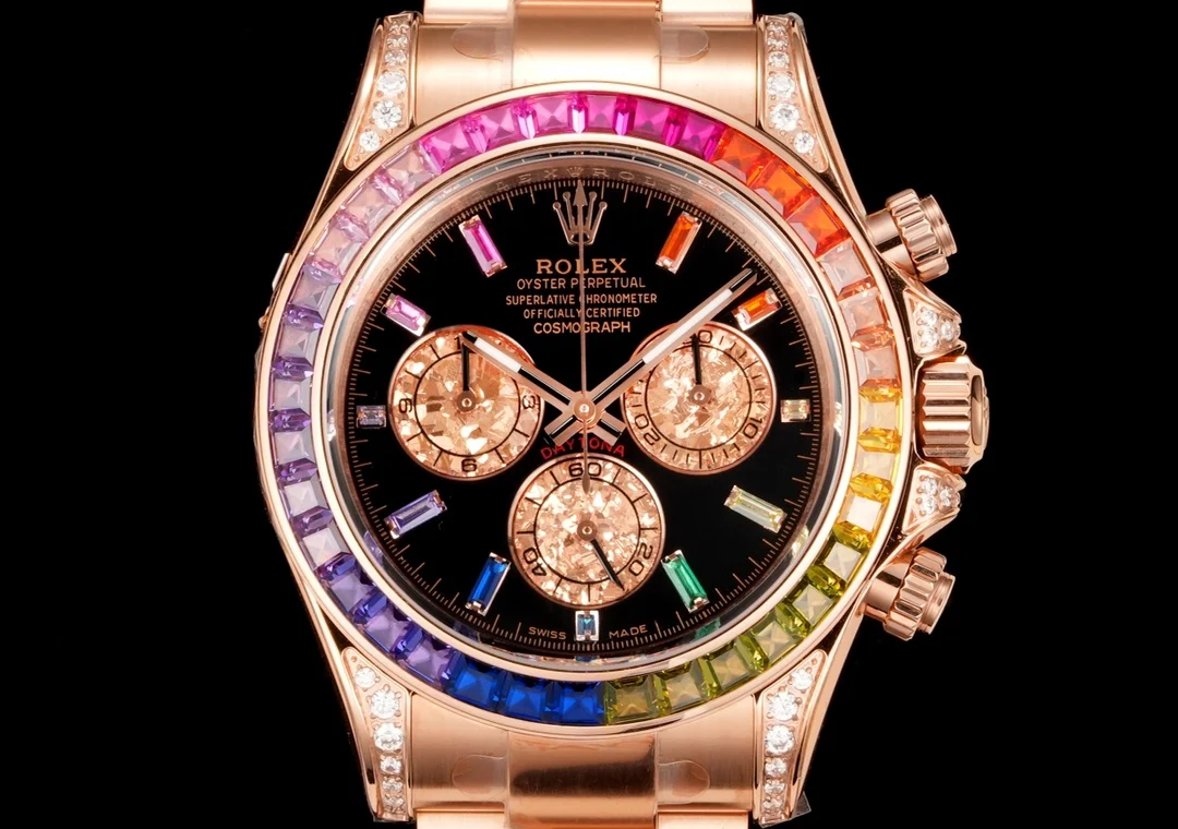 宇宙计型迪通拿 外圈镶嵌彩虹渐变色蓝宝石 代替了经典的测速外圈 表耳及表冠护肩镶嵌56颗圆形切割钻石每一道工序精制严谨确保角度颜色与原版一样光彩夺目 1 表盘镶嵌11颗蓝宝石钟点标记 对应外圈上的宝石颜色 2 表壳石高度一致 壳身纤薄 3 采用进口天然橡胶表带 质感柔细软腻 佩戴非常舒适 表扣细节处理完美无瑕 4 搭载4130机械计时机芯