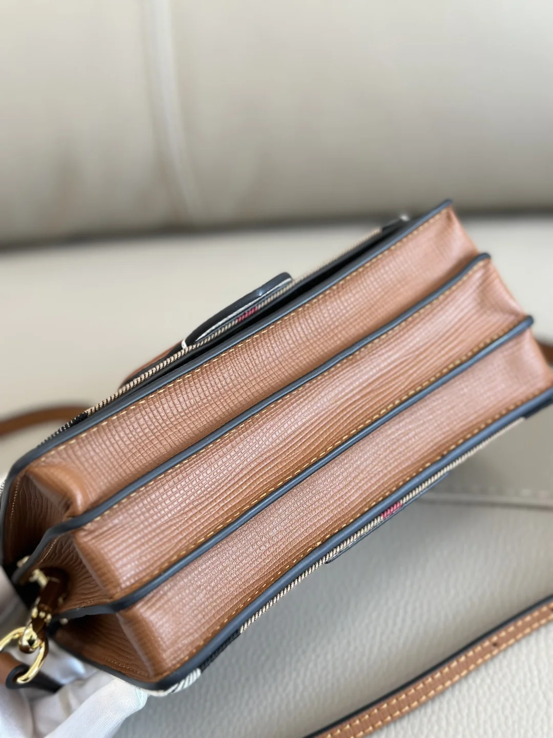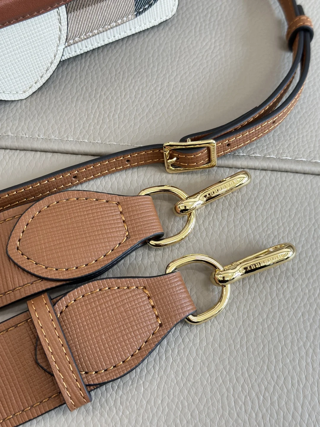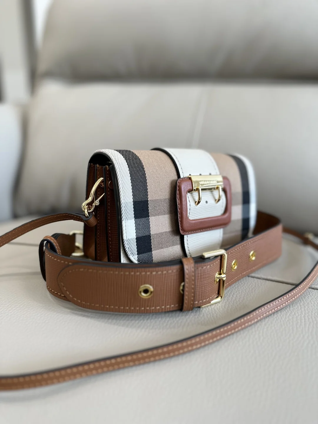 顶级 B家The Buckle 搭扣包 臻选质感皮革与英格兰精纺的House格纹裁片 搭配精湛的手工精制缉明线设计 于意大利高级工坊匠制而成 军装风格的亮泽金属搭扣装饰取材于传统Trench风衣 搭扣包也因此而得名 本款单品为小号款式 适合日常使用 随附两条肩背带 可用作斜背包 肩背包或手拿包 19.5*5*12cm型号460163