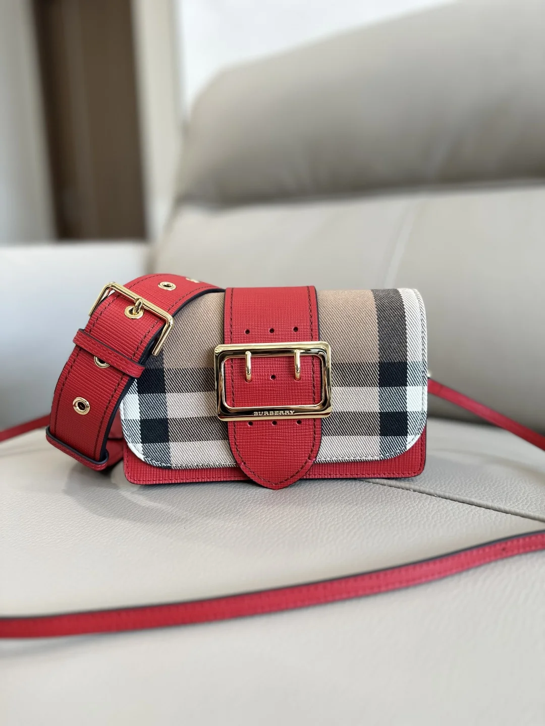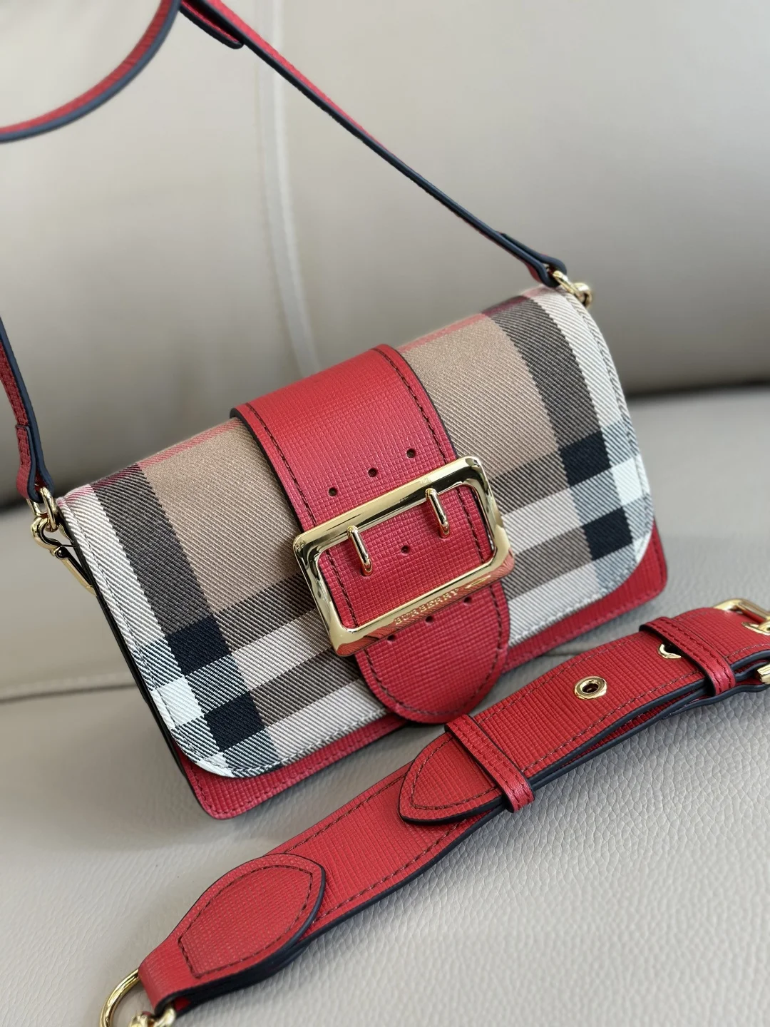 顶级 B家The Buckle 搭扣包 臻选质感皮革与英格兰精纺的House格纹裁片 搭配精湛的手工精制缉明线设计 于意大利高级工坊匠制而成 军装风格的亮泽金属搭扣装饰取材于传统Trench风衣 搭扣包也因此而得名 本款单品为小号款式 适合日常使用 随附两条肩背带 可用作斜背包 肩背包或手拿包 19.5*5*12cm型号460160