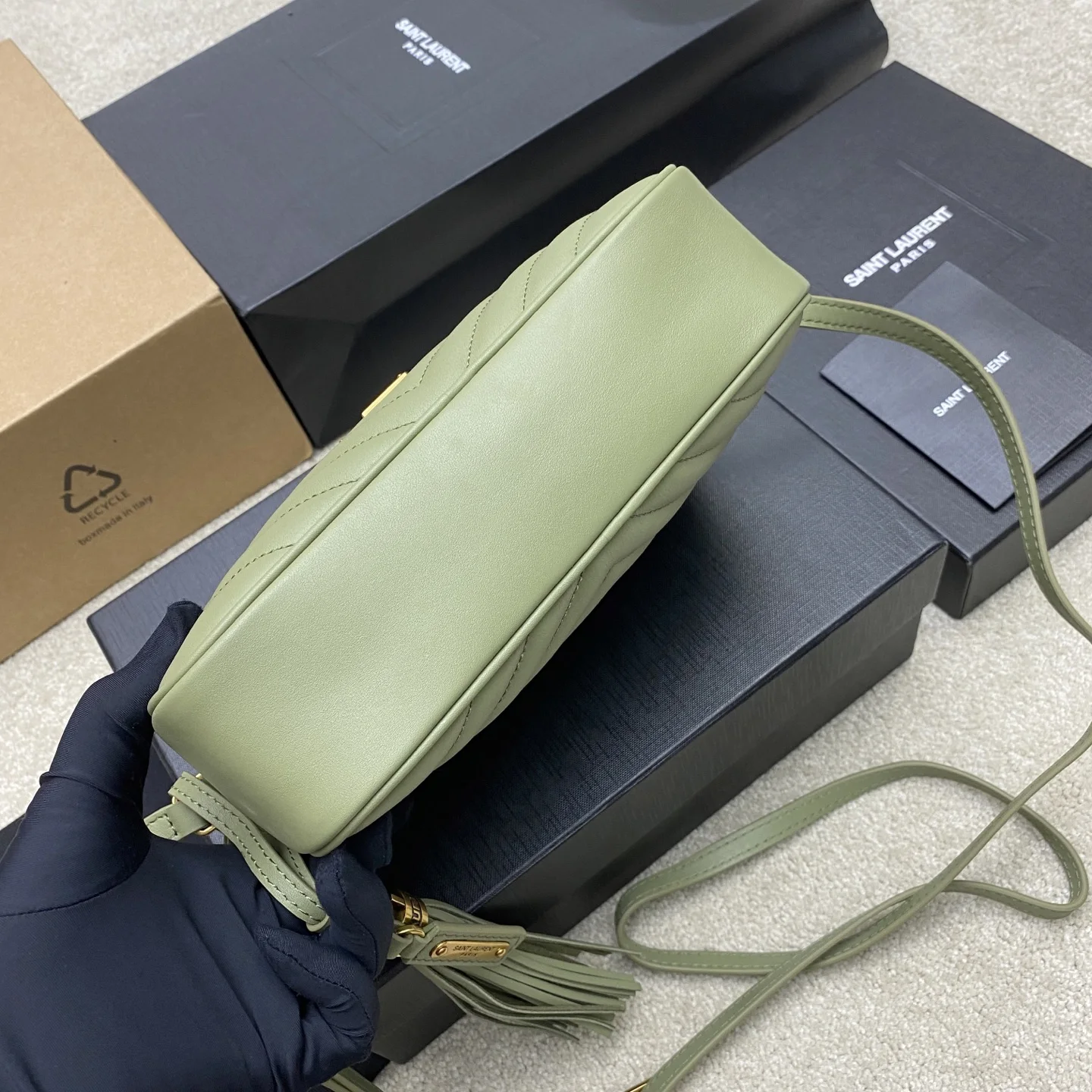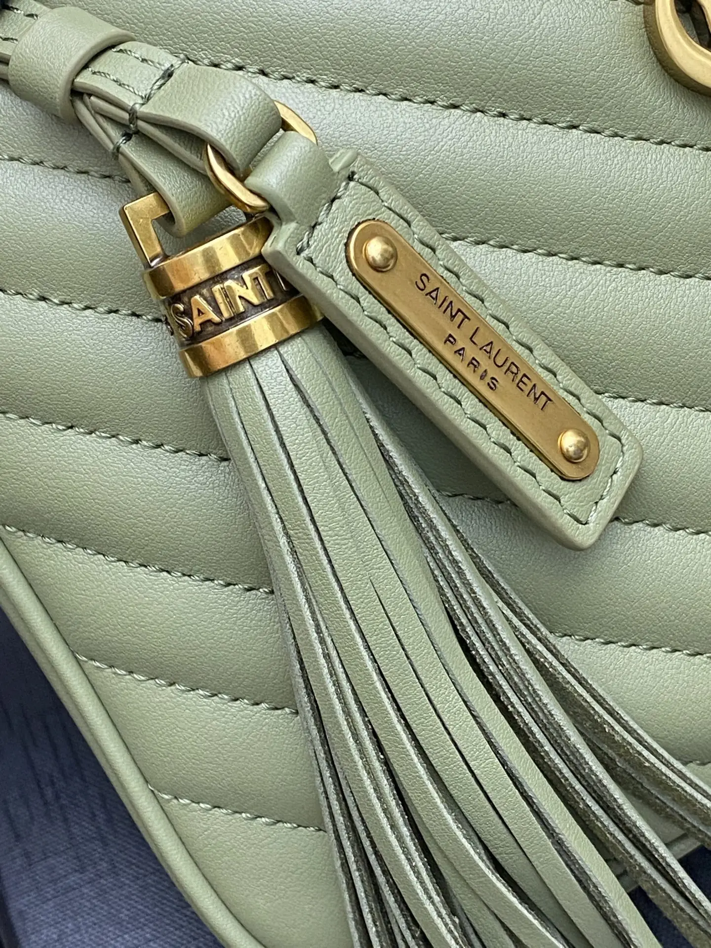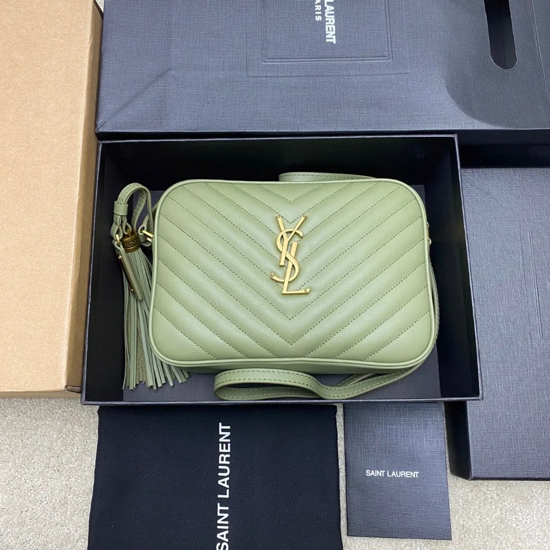 果绿平纹/金全新升级版 强烈种草Y家LOU BAG爆款相机包 比老版本后面多了一个小口袋 自重超级轻巧的款式 容量惊人原厂ZP皮 细腻高级 皮质手感都超级棒简约的包身有Y家经典Logo作为点缀 肩带可以调节 流苏吊坠可以取下 轻便百搭