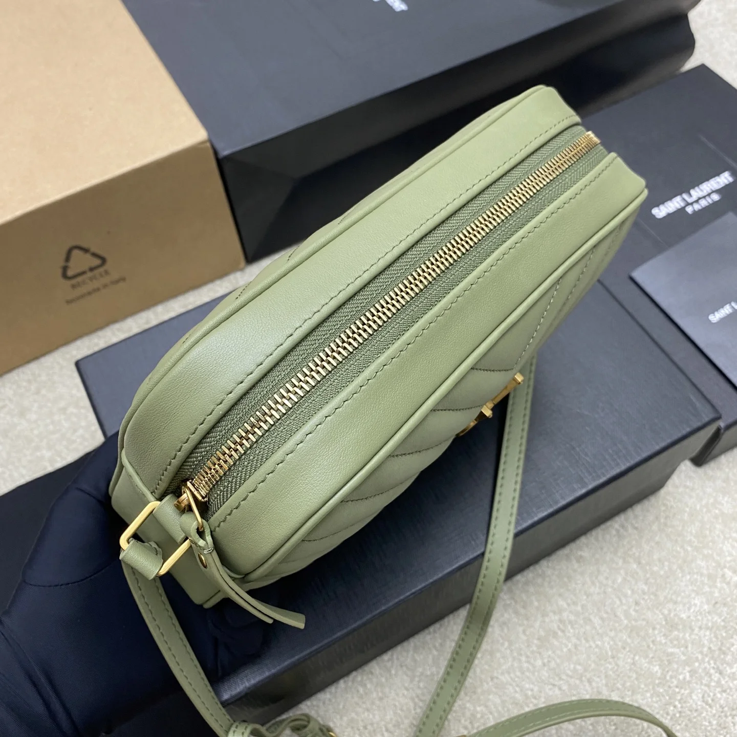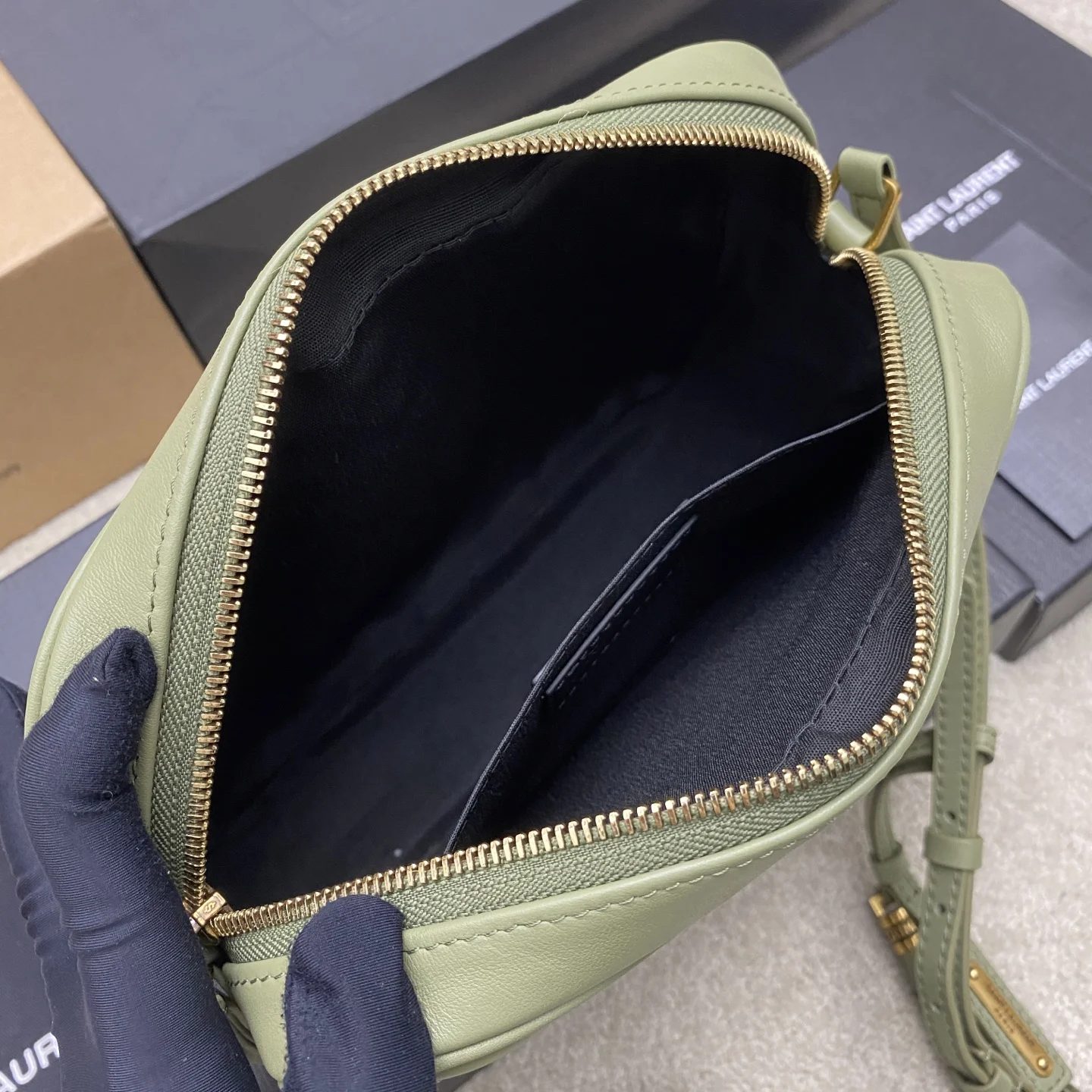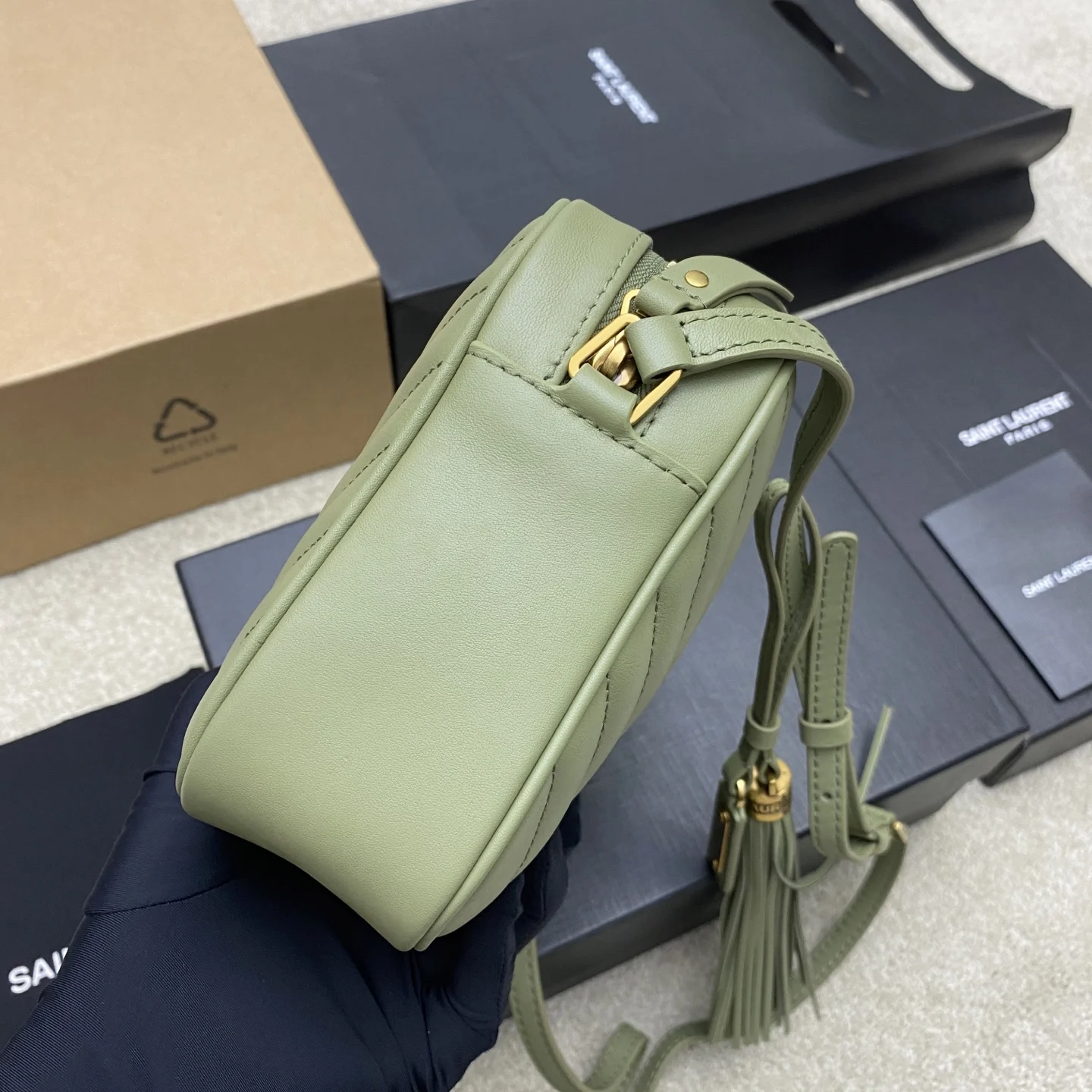 果绿平纹/金全新升级版 强烈种草Y家LOU BAG爆款相机包 比老版本后面多了一个小口袋 自重超级轻巧的款式 容量惊人原厂ZP皮 细腻高级 皮质手感都超级棒简约的包身有Y家经典Logo作为点缀 肩带可以调节 流苏吊坠可以取下 轻便百搭
