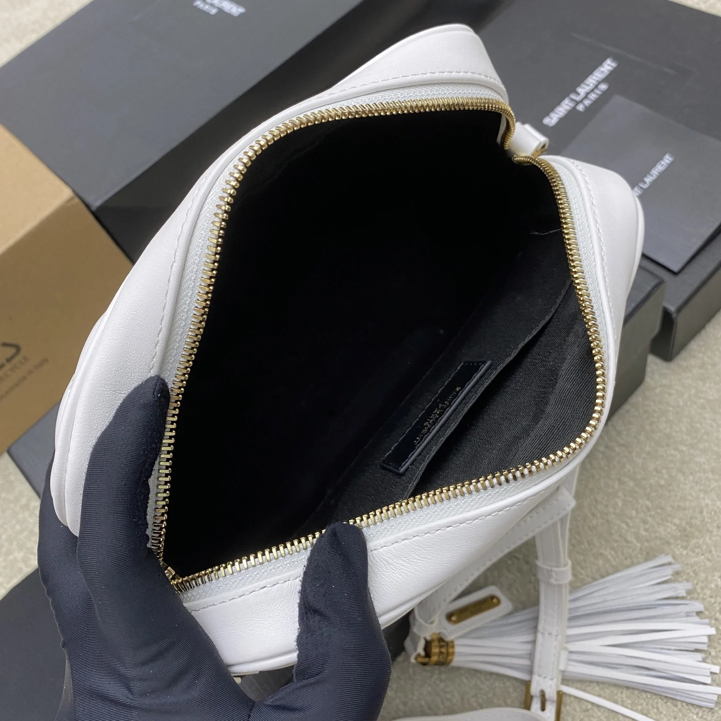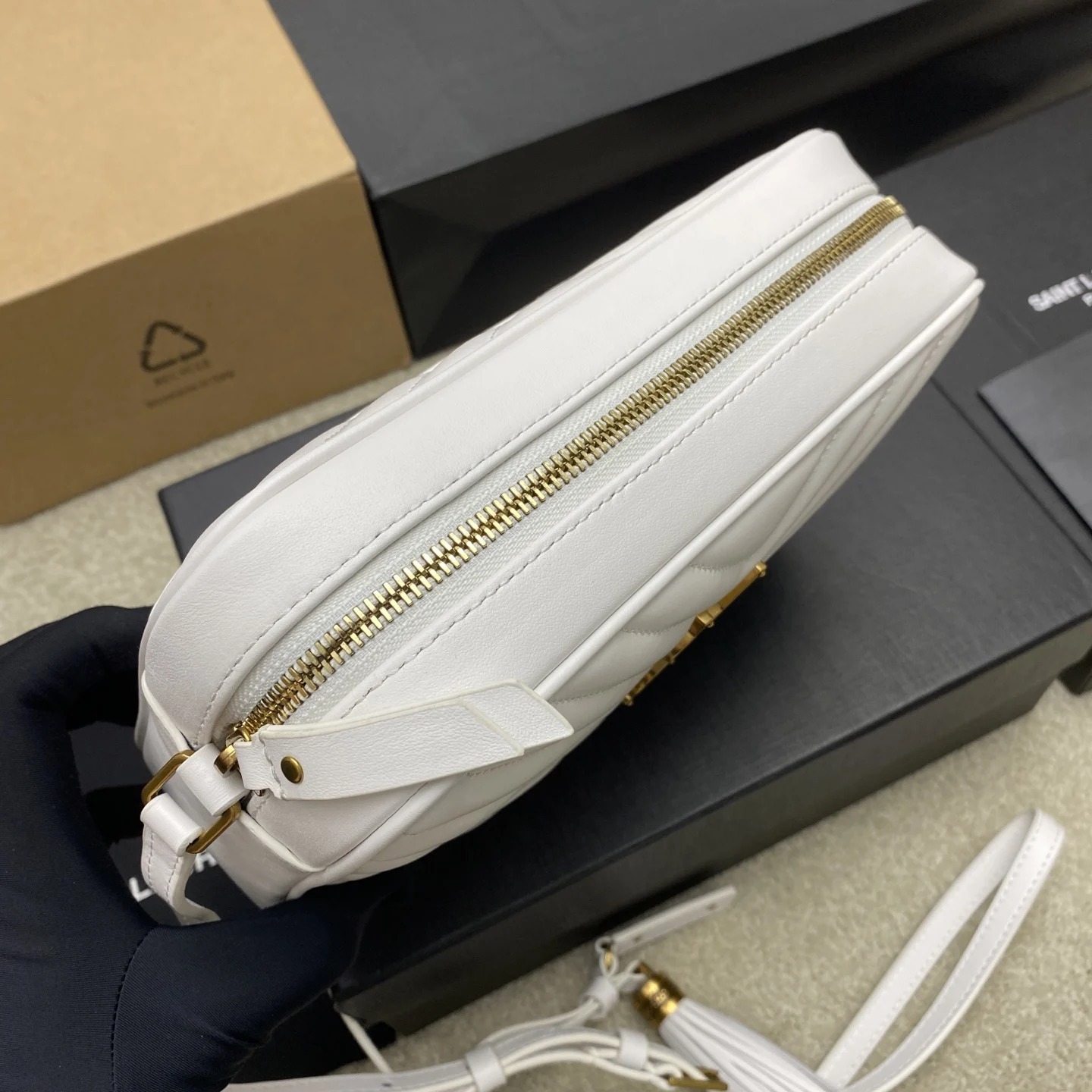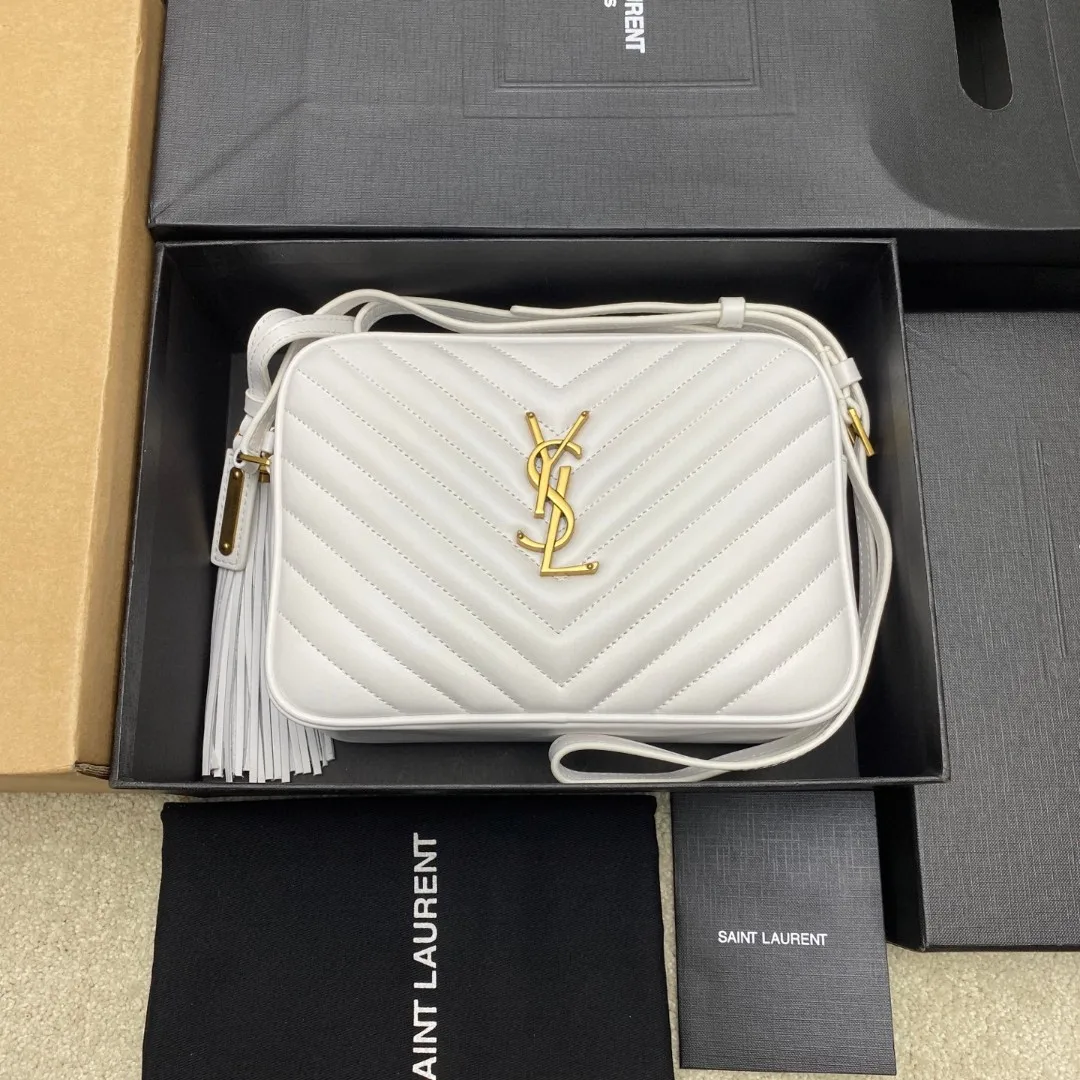奶白平纹/金全新升级版 强烈种草Y家LOU BAG爆款相机包 比老版本后面多了一个小口袋 自重超级轻巧的款式 容量惊人原厂ZP皮 细腻高级 皮质手感都超级棒简约的包身有Y家经典Logo作为点缀 肩带可以调节 流苏吊坠可以取下 轻便百搭