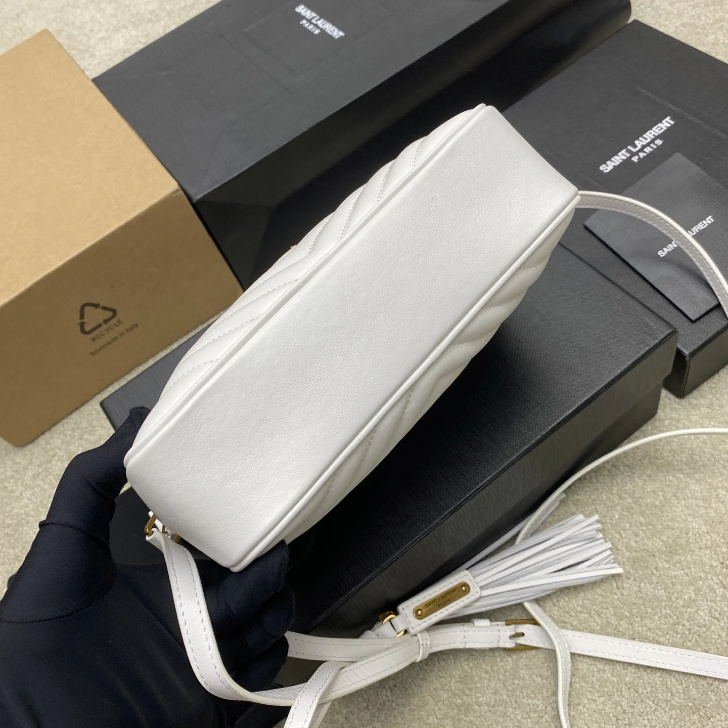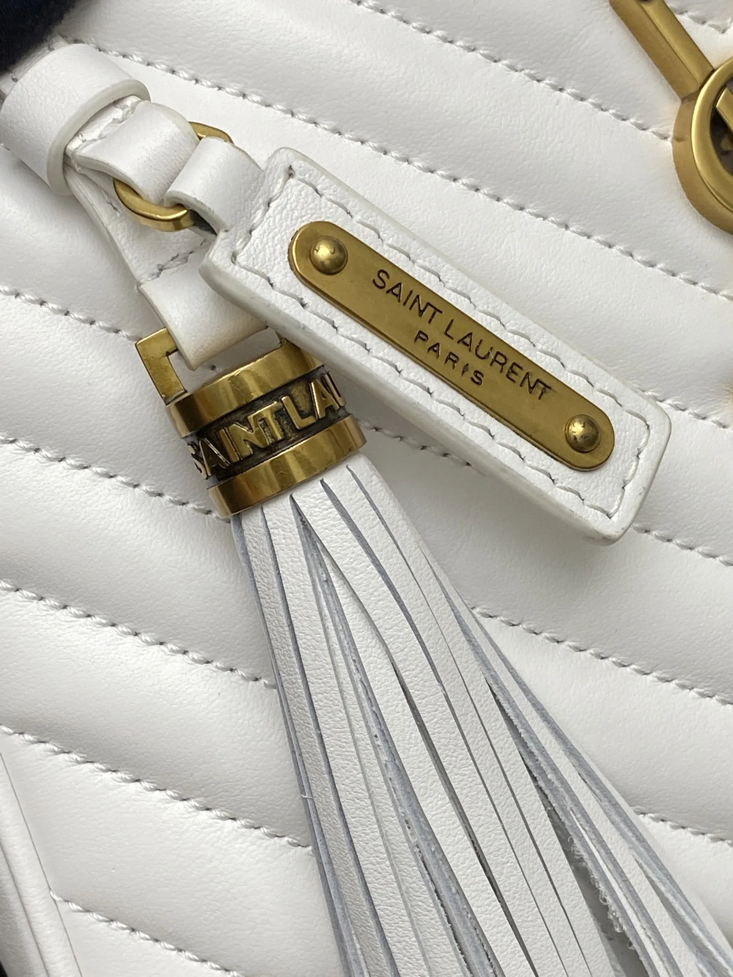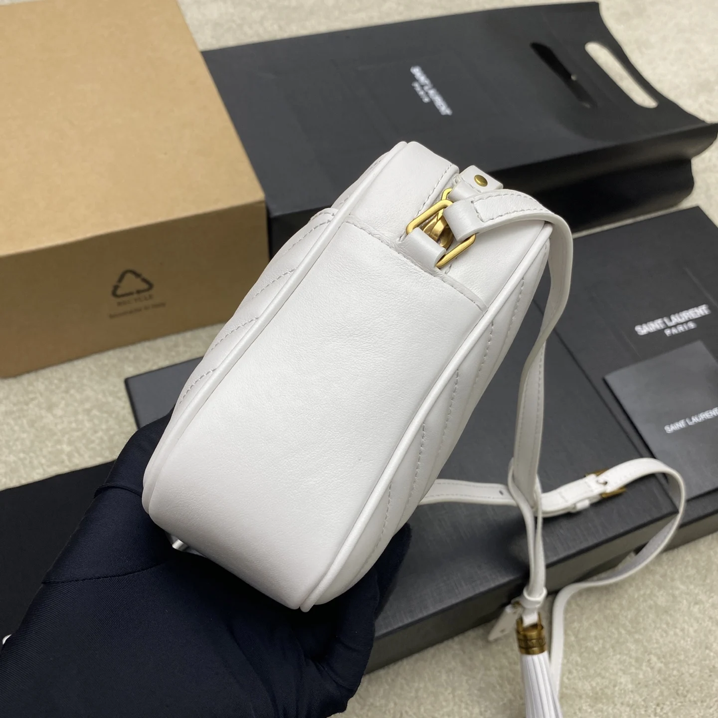 奶白平纹/金全新升级版 强烈种草Y家LOU BAG爆款相机包 比老版本后面多了一个小口袋 自重超级轻巧的款式 容量惊人原厂ZP皮 细腻高级 皮质手感都超级棒简约的包身有Y家经典Logo作为点缀 肩带可以调节 流苏吊坠可以取下 轻便百搭