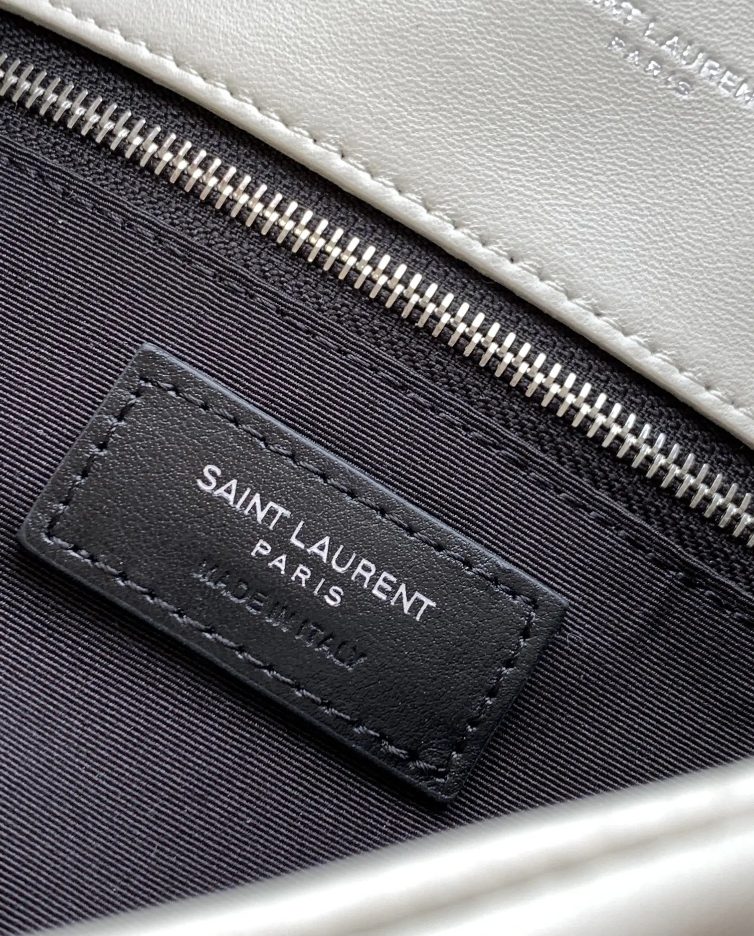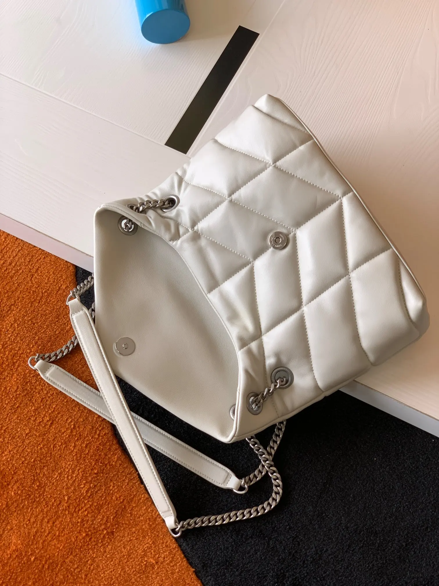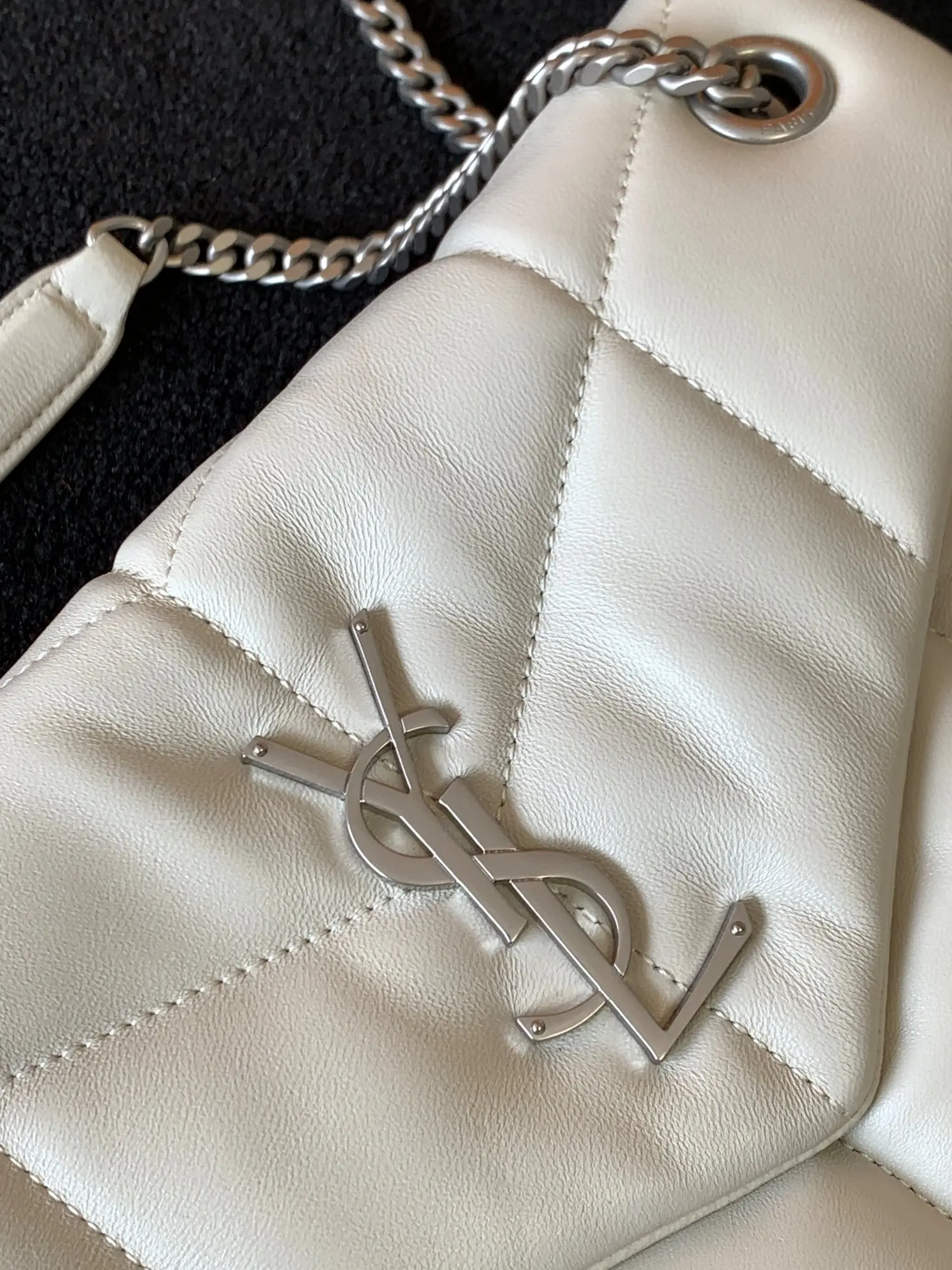 LOULOU PUFFER 绗缝小羊皮包 原厂正品皮制作 手感柔软细腻 犹如怀抱云朵 般的感受 经典的Y家logo 链条及扣眼五金均采用巴金哑光银五金 包袋开口处折叠后使用了磁性四合扣封口 密闭性及安全性一流 包内设有一个拉链内袋可放置手机及贵重物品 除此之外无多余内袋设计 使用起来随心所欲 尺寸 29x17x11cm 型号 577476