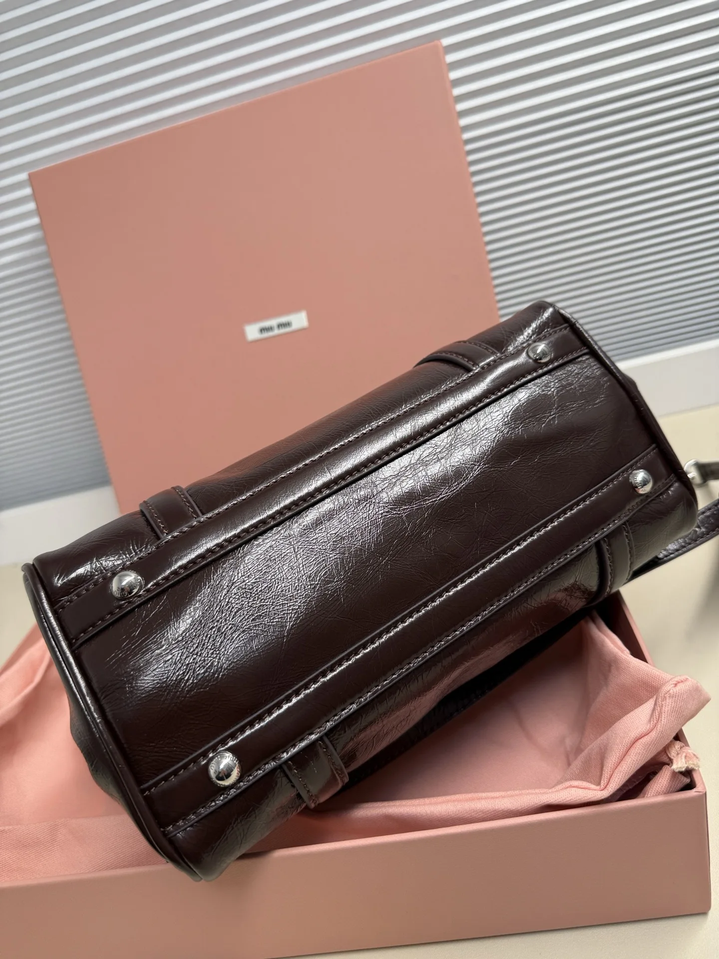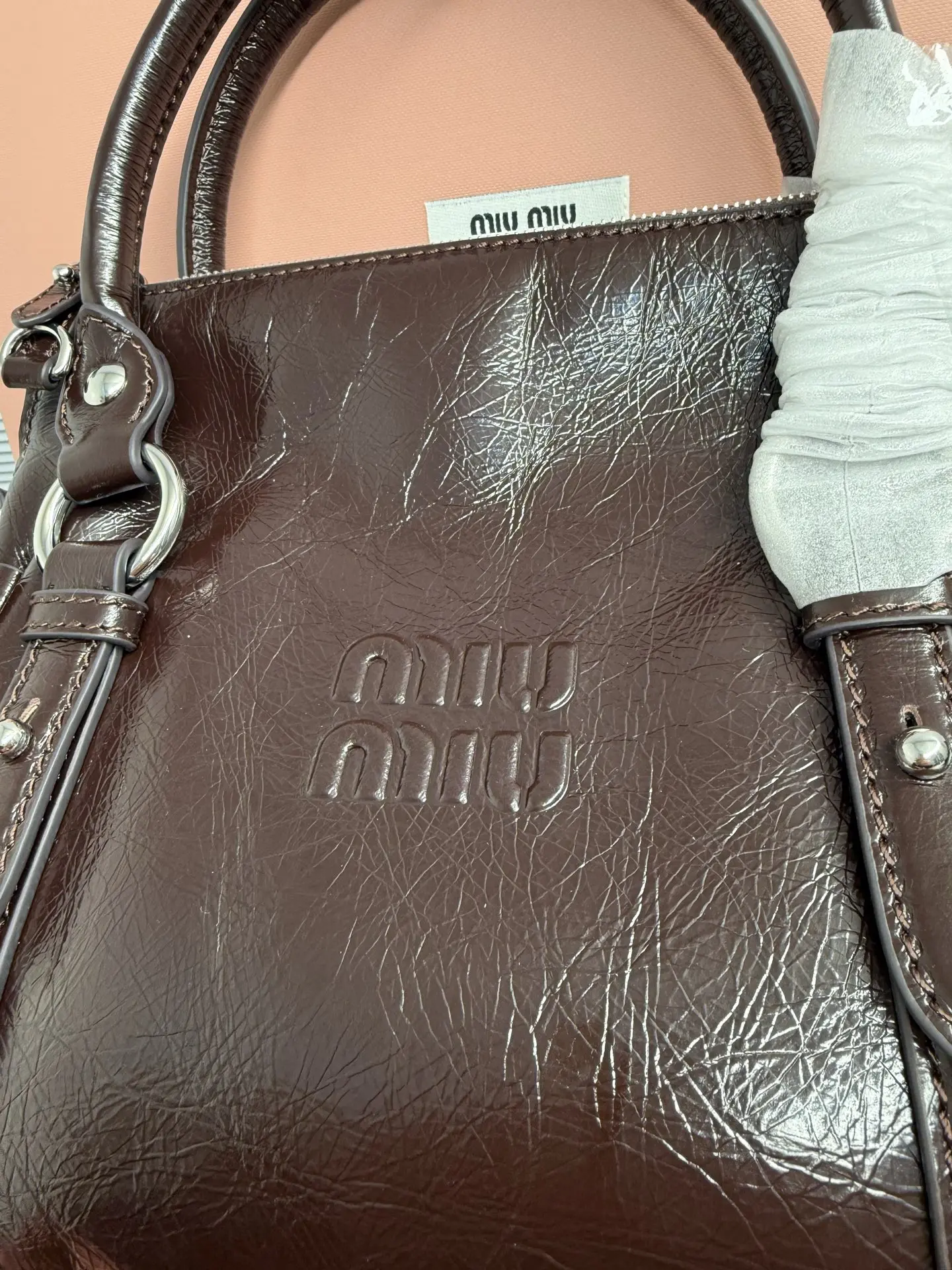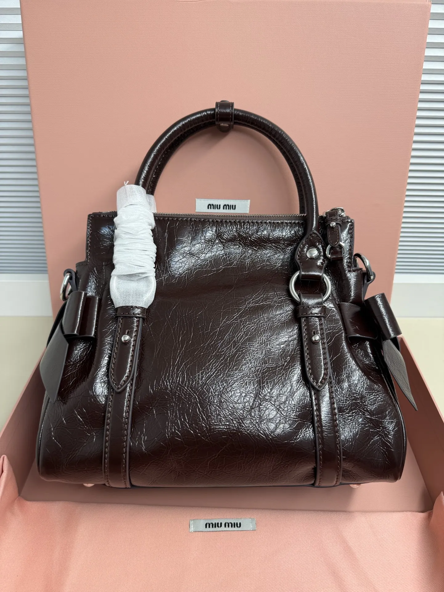 Miu Miu 26SS RIBBON 早春手袋 经典 一看到就想到miu初代的经典 当一对翅膀决定同时栖落在 历史与此刻的肩头 真正的经典永远在时间的两端同时生长中古银扣锁着未褪的鎏金梦 硬壳机车包型+蝴蝶结 这两个八杆子打不着的关系撞在一起 居然毫无违和感 有点机车有点可爱 甜和飒同时拉满 自重很轻 亮面牛皮革材质