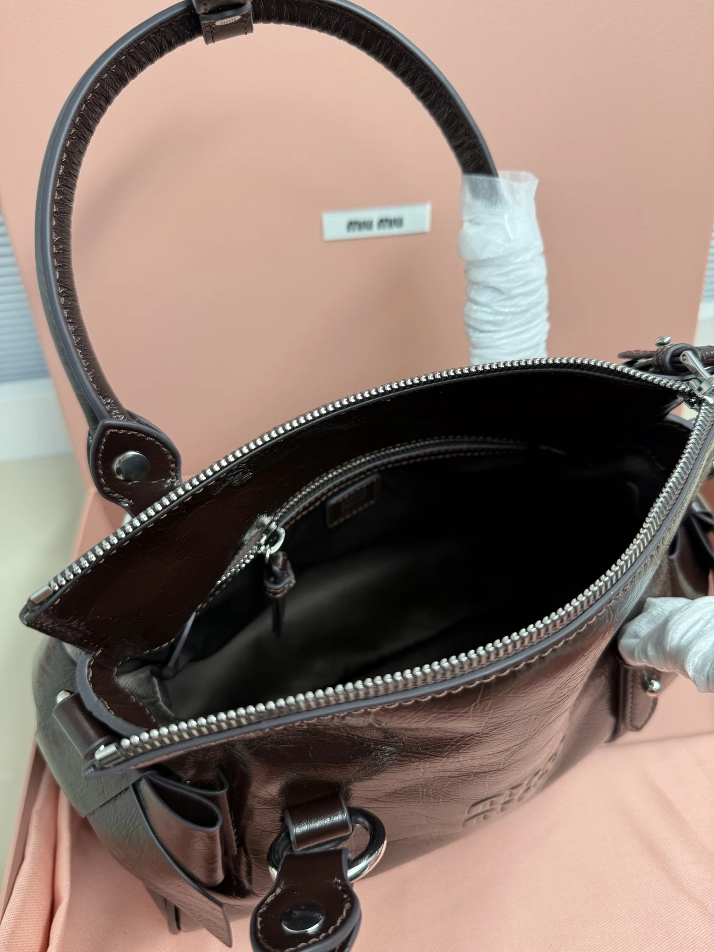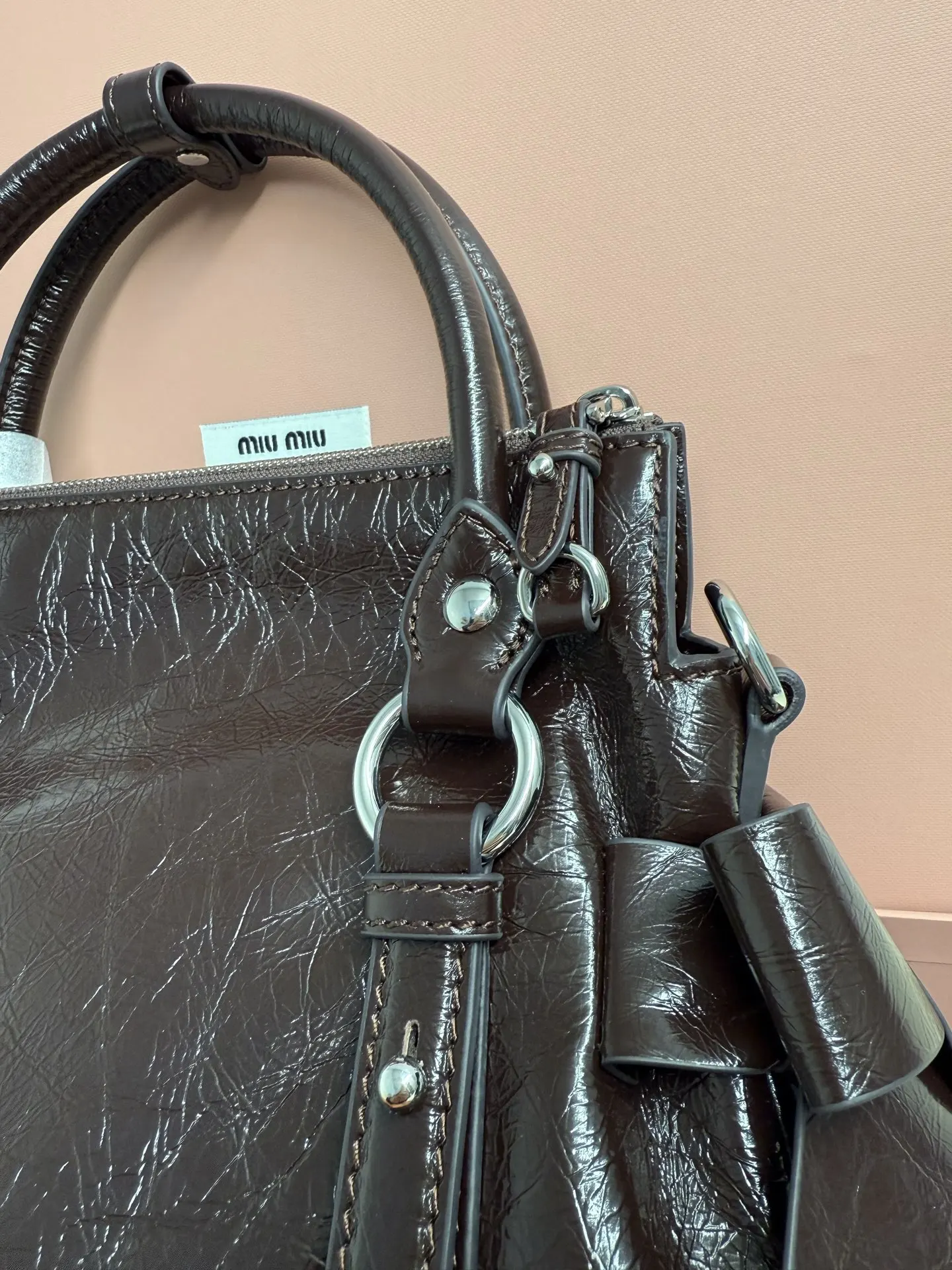 Miu Miu 26SS RIBBON 早春手袋 经典 一看到就想到miu初代的经典 当一对翅膀决定同时栖落在 历史与此刻的肩头 真正的经典永远在时间的两端同时生长中古银扣锁着未褪的鎏金梦 硬壳机车包型+蝴蝶结 这两个八杆子打不着的关系撞在一起 居然毫无违和感 有点机车有点可爱 甜和飒同时拉满 自重很轻 亮面牛皮革材质